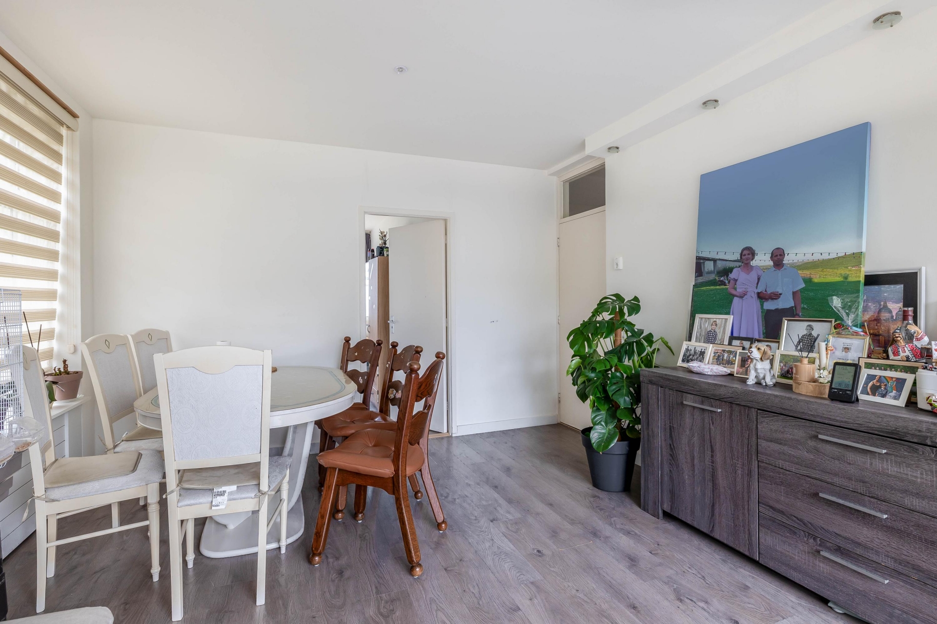 Het appartement ligt op de eerste verdieping van een goed onderhouden portiekflat. De woonkamer is licht dankzij de grote raampartijen en biedt voldoende ruimte voor een gezellige zithoek en een eettafel. De vloer is netjes afgewerkt en de witte wanden zorgen voor een frisse basis. Vanuit de woonkamer loop je zo het balkon op — heerlijk gelegen op het zuidoosten — waar je in de ochtend en vroege middag van de zon kunt genieten.