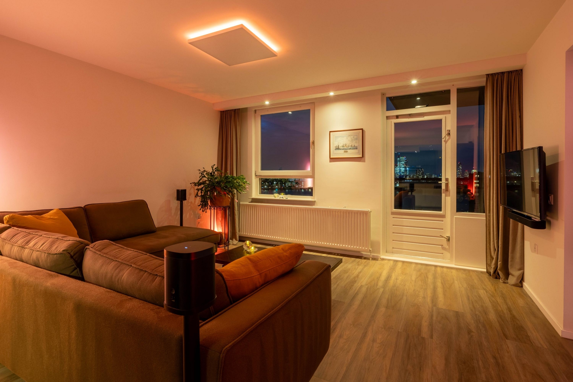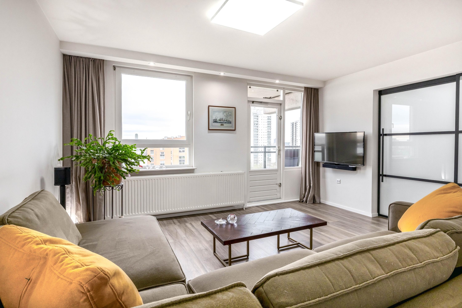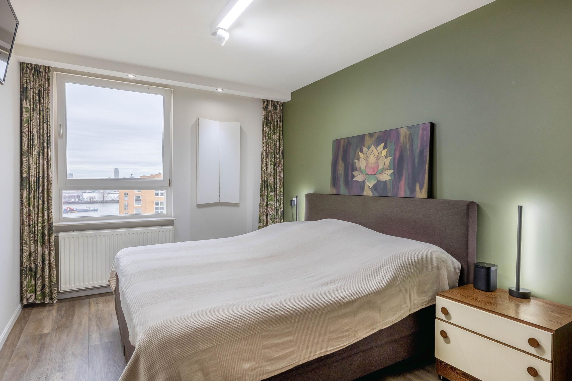 Via de afgesloten centrale entree met dubbele liftinstallatie bereik je dit goed ingedeelde 3-kamer appartement. Door de grote ramen komt het daglicht naar binnen, wat zorgt voor een open en lichte sfeer in de hele woning. De woonkamer is ruim van opzet en heeft een mooi vrij uitzicht richting de Maas en de skyline van Rotterdam. De woonkamer loopt over in de keuken (2018), die is voorzien van diverse luxe inbouwapparatuur van AEG, een wijnklimaatkast en voldoende kastruimte.