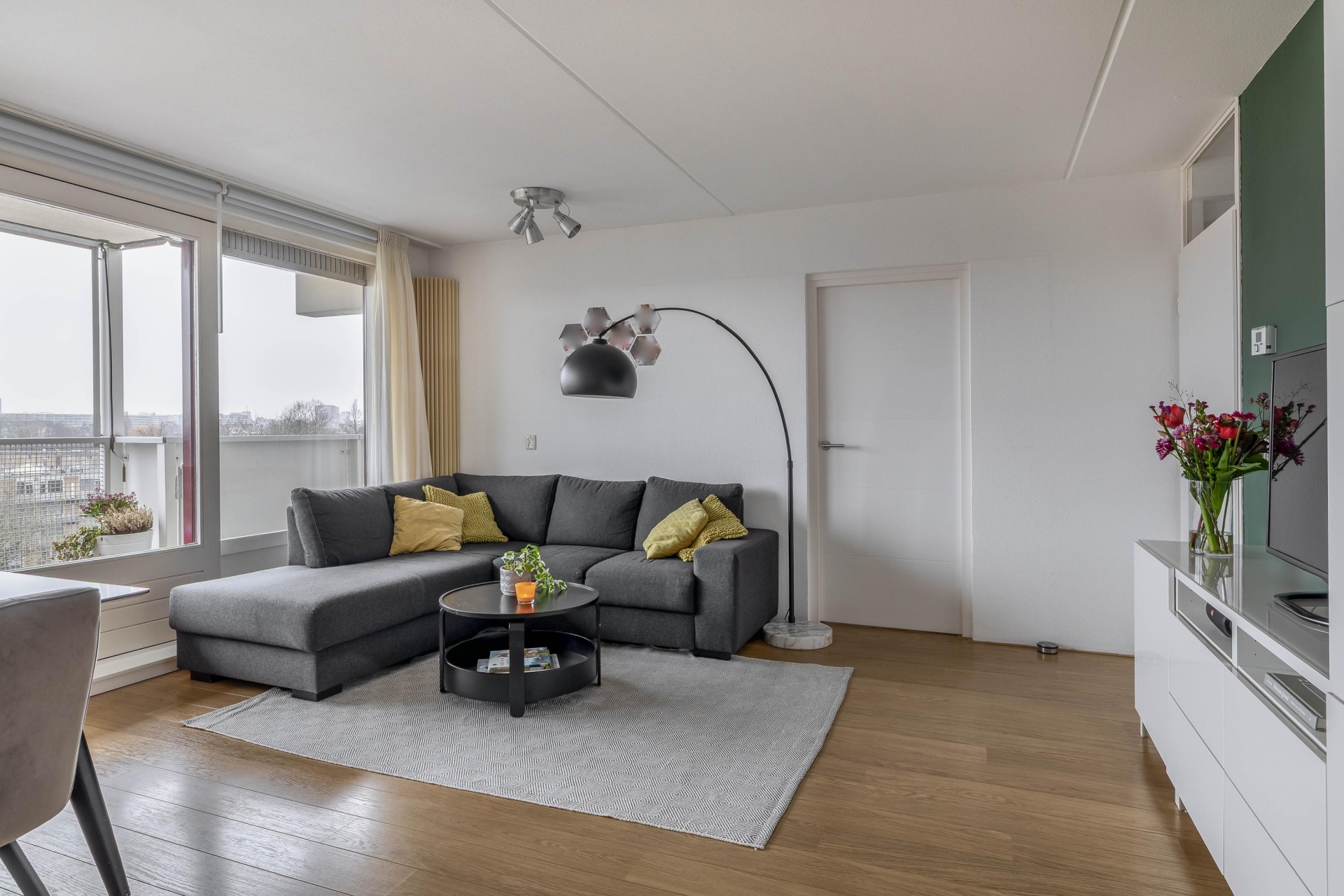 De woonkamer is ruim van opzet en wordt door de grote raampartijen heerlijk verlicht. Dankzij de ligging op hoogte kijk je hier mooi weg over de wijk, terwijl je binnen geniet van een comfortabele zithoek en plek voor een eettafel. De toegang tot het zonnige balkon loopt direct vanuit de woonkamer.