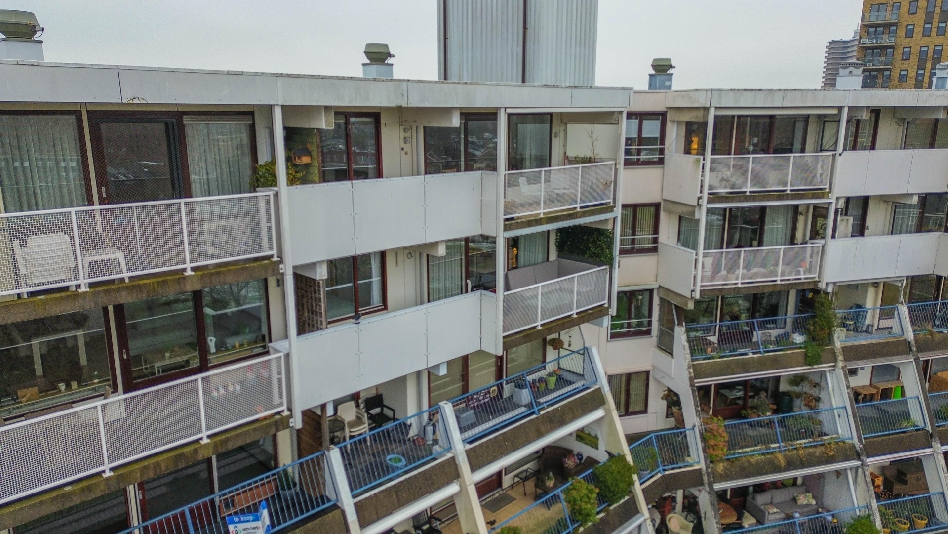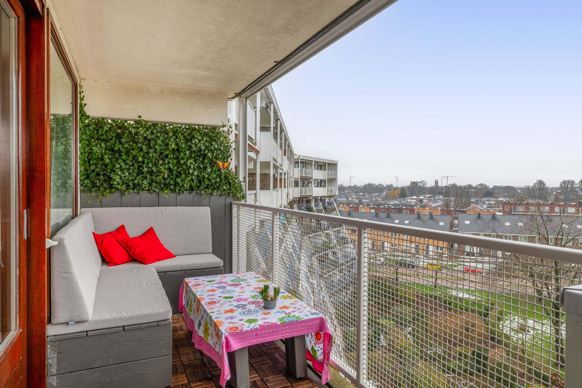 Een groot pluspunt is het terras op het zuidwesten. Het balkon is uitzonderlijk ruim, 12,5 vierkante meter, over de volledige breedte van het appartement. De vaste zithoek op het balkon is op maat gemaakt, inclusief de kussens. Het maakt het mogelijk om vrijwel het hele jaar comfortabel buiten op het balkon te zitten. Het brede deel van het balkon is voorzien van een zonnescherm. Door de ligging op de zesde verdieping geniet je hier van de middag- en avondzon, rust en privacy. Het terras is sfeervol ingericht met houten vlonders, groen en ruimte voor een zitje. Ideaal voor een kop koffie in de zon of een ontspannen borrel aan het eind van de dag.