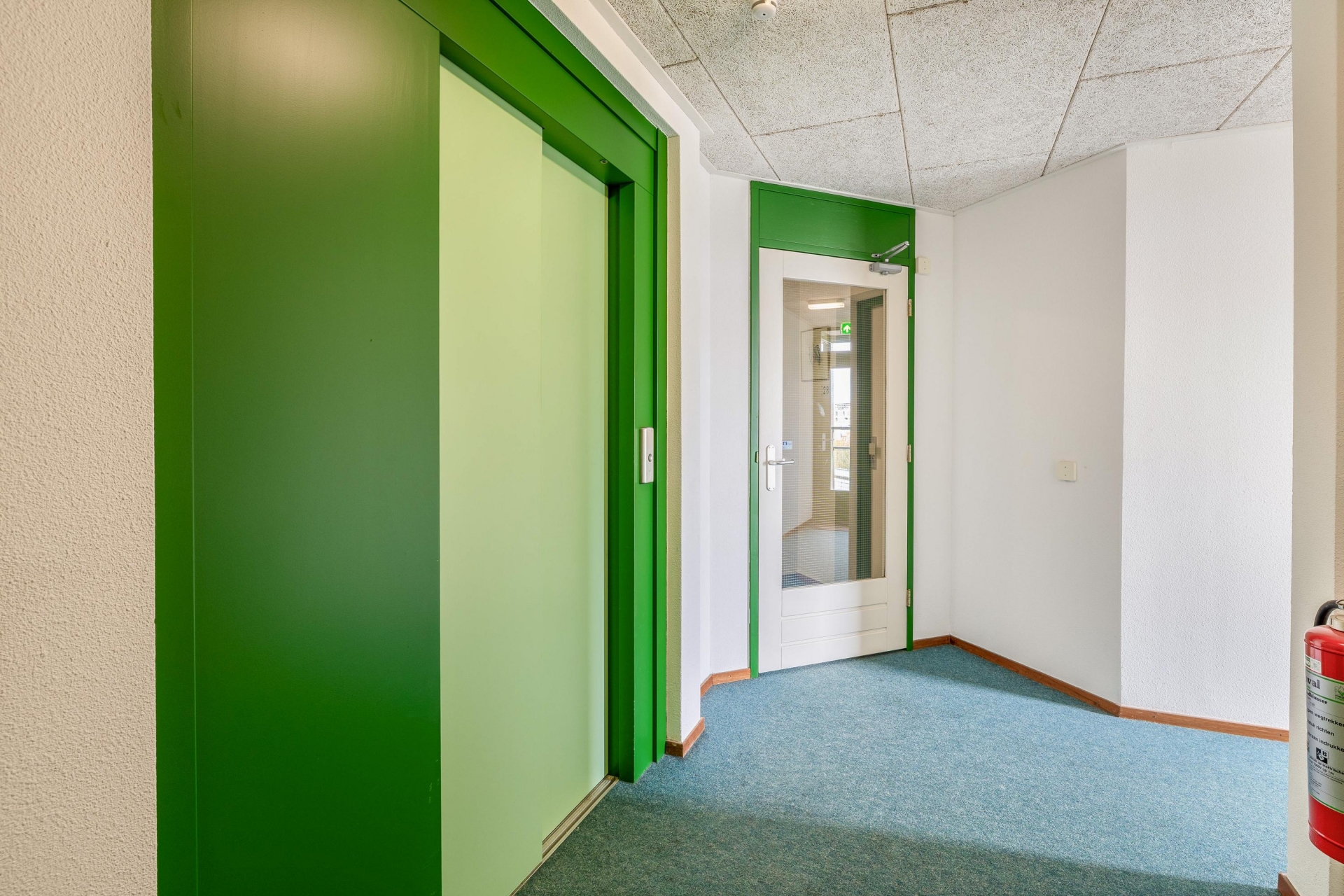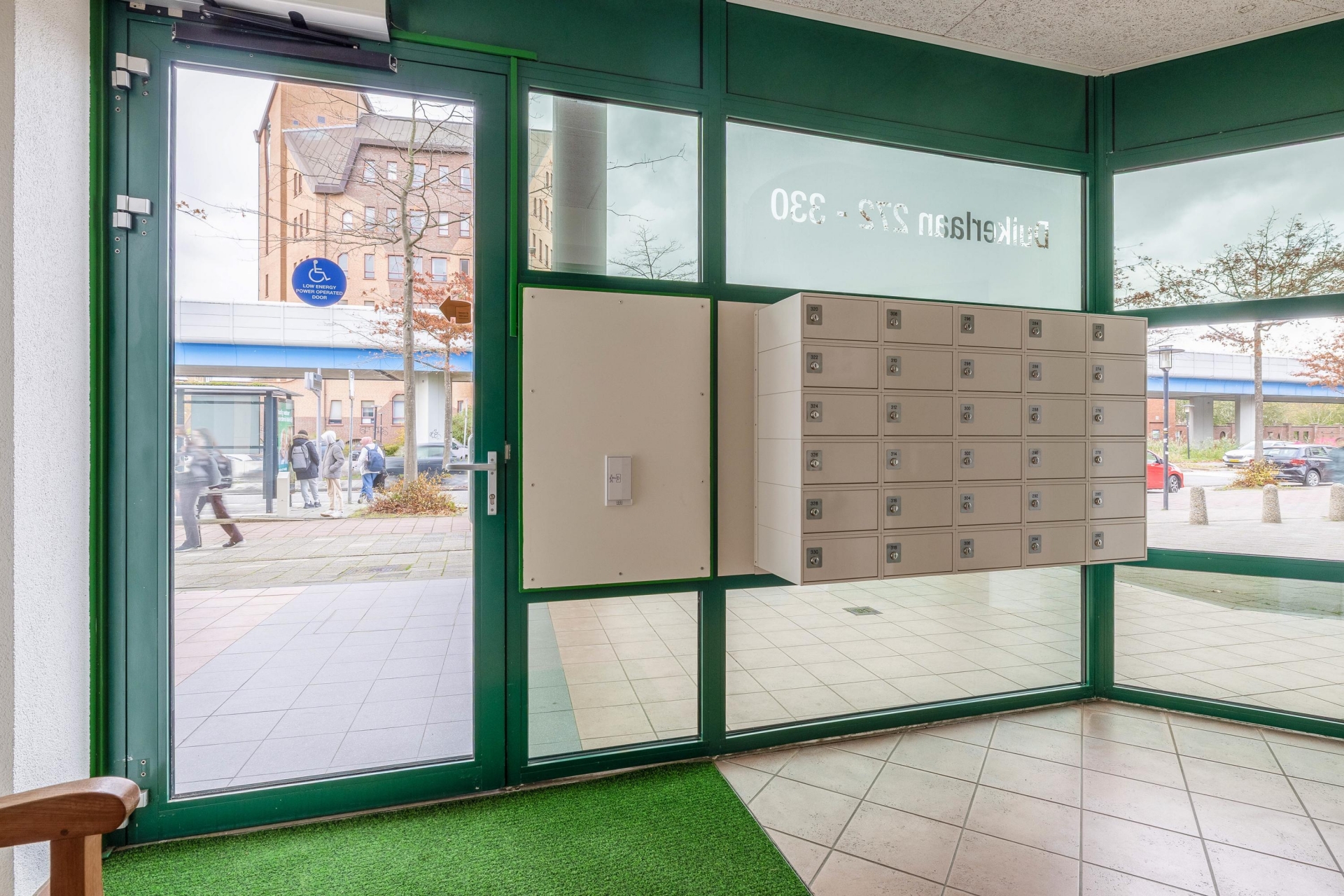 Afgesloten entree met bellentableau, brievenbussen, lift, trappenhuis en toegang tot de bergingen.