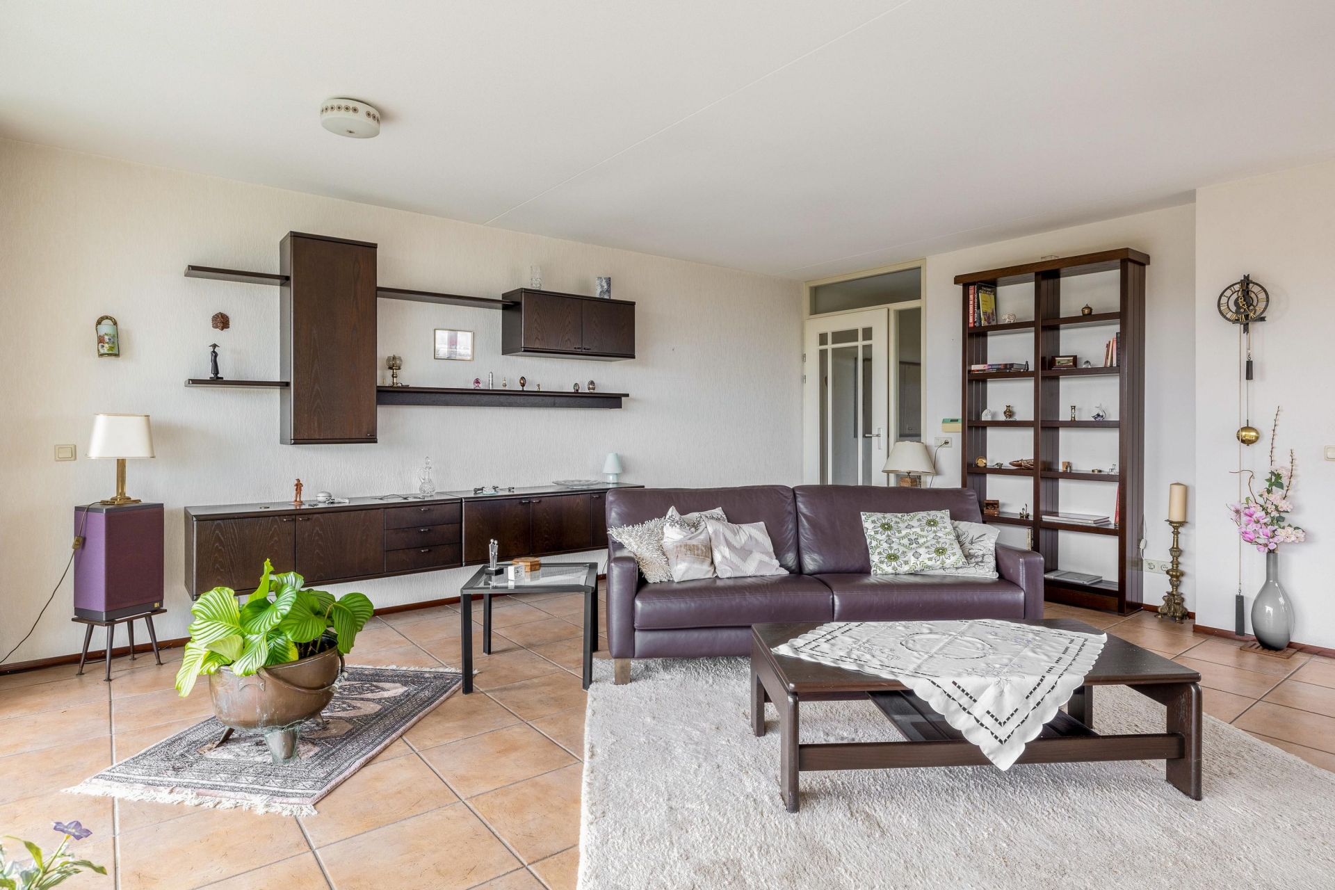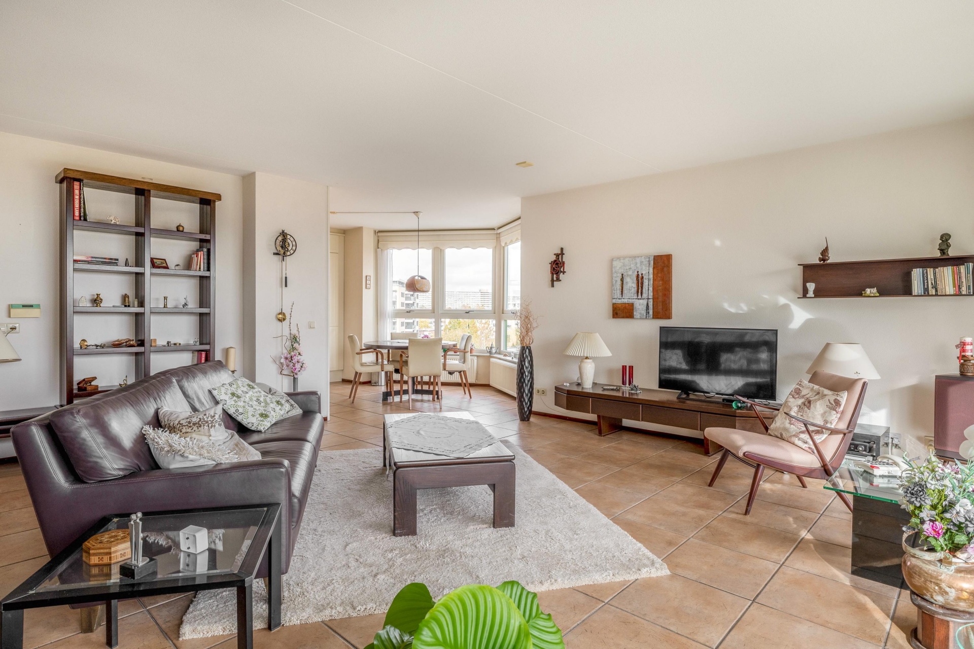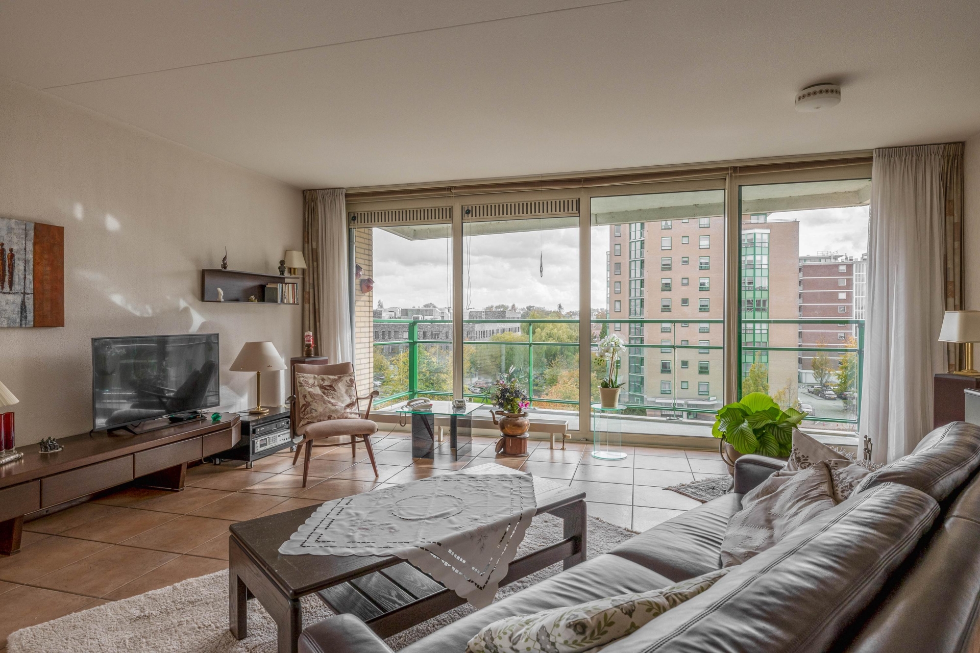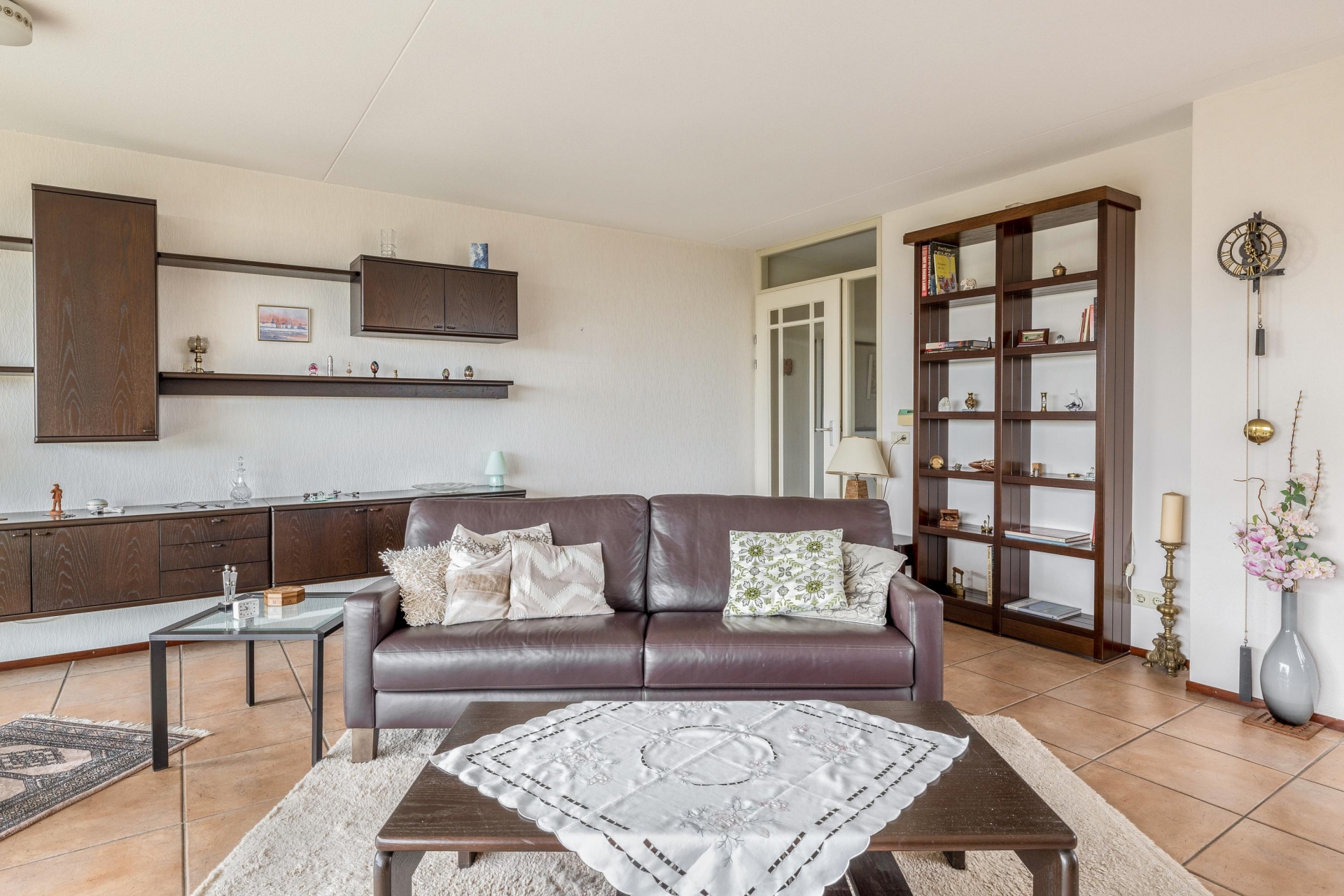 De lichte woonkamer heeft via een schuifpui toegang tot het royale balkon.