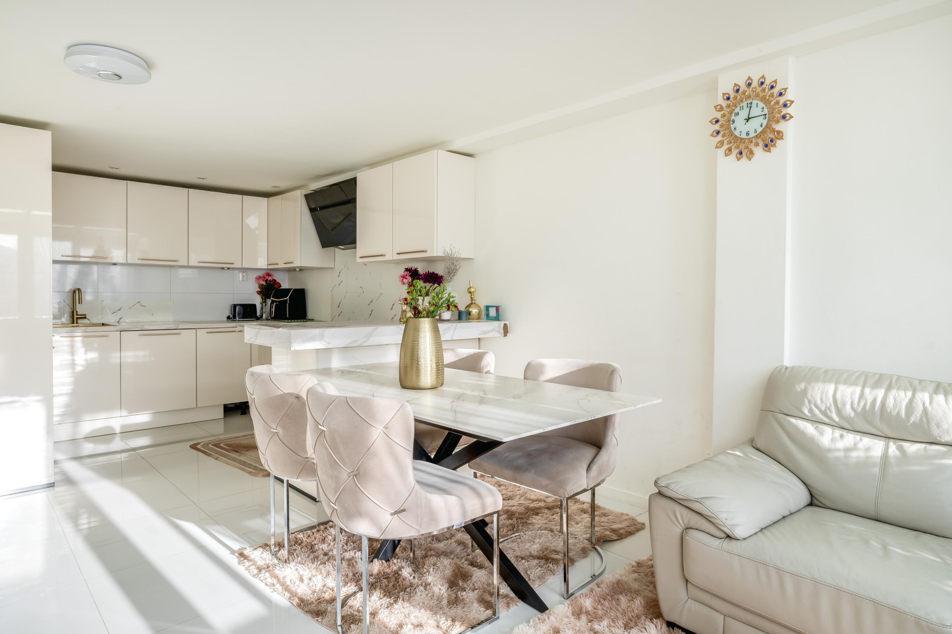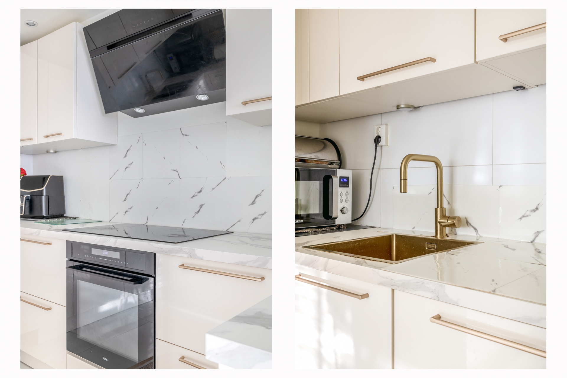 Wat direct opvalt bij binnenkomst is de strakke en moderne afwerking. De begane grond is voorzien van een fraaie plavuizen vloer met vloerverwarming (2024), wat zorgt voor veel wooncomfort. Aan de achterzijde is de woonkamer uitgebouwd en biedt via een grote schuifpui toegang tot de zonnige achtertuin op het zuiden. De open keuken aan de voorzijde is in 2024 vernieuwd en uitgerust met diverse inbouwapparatuur, waaronder een oven, kookplaat, afzuigkap en vaatwasser.