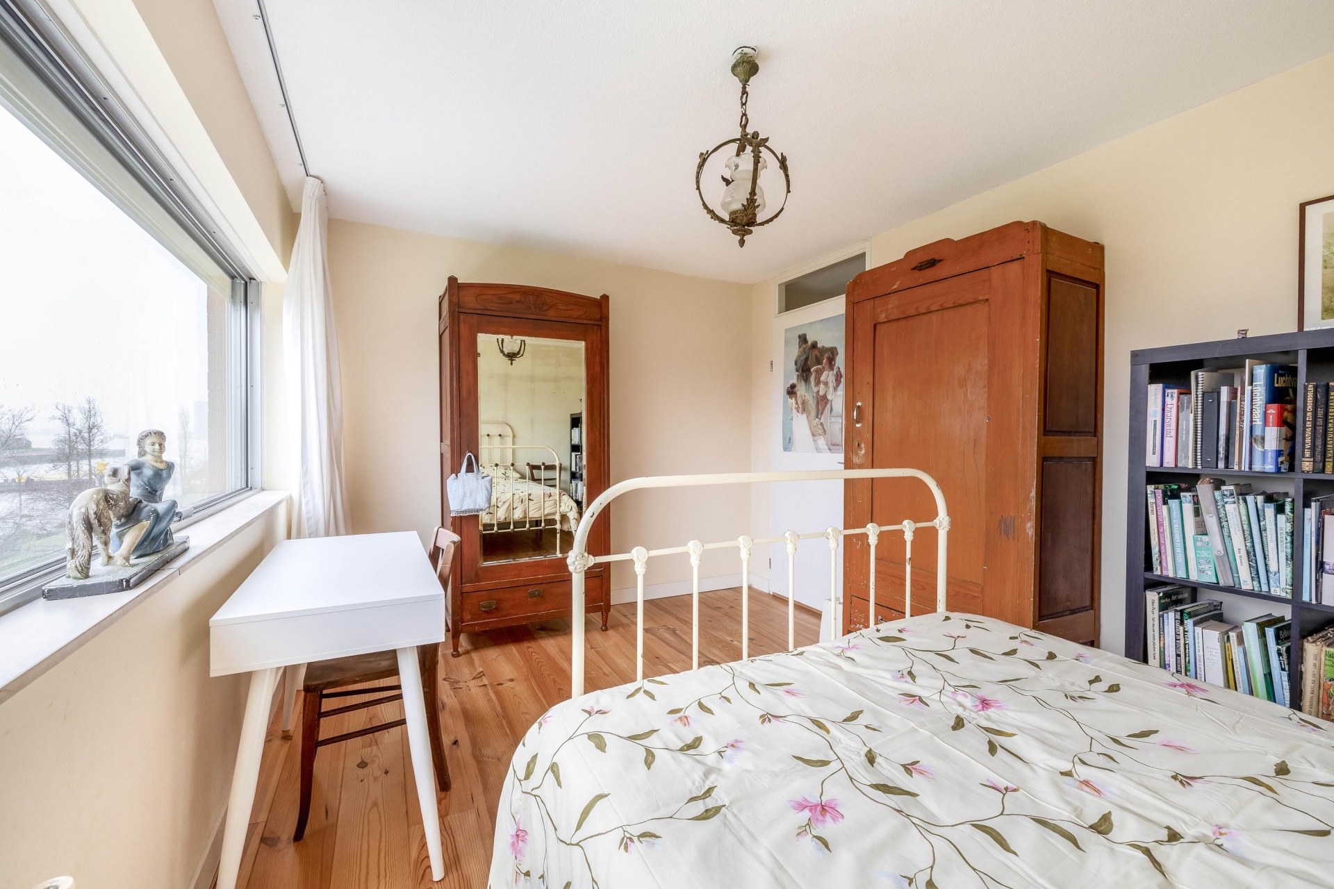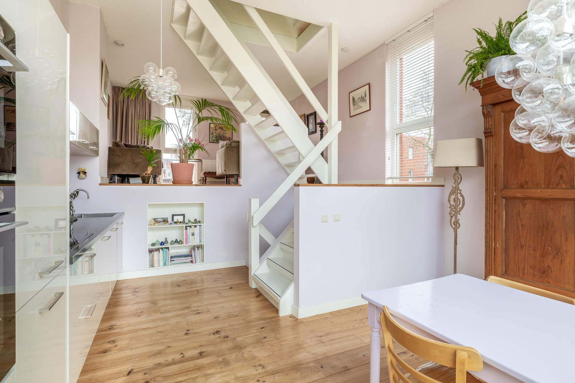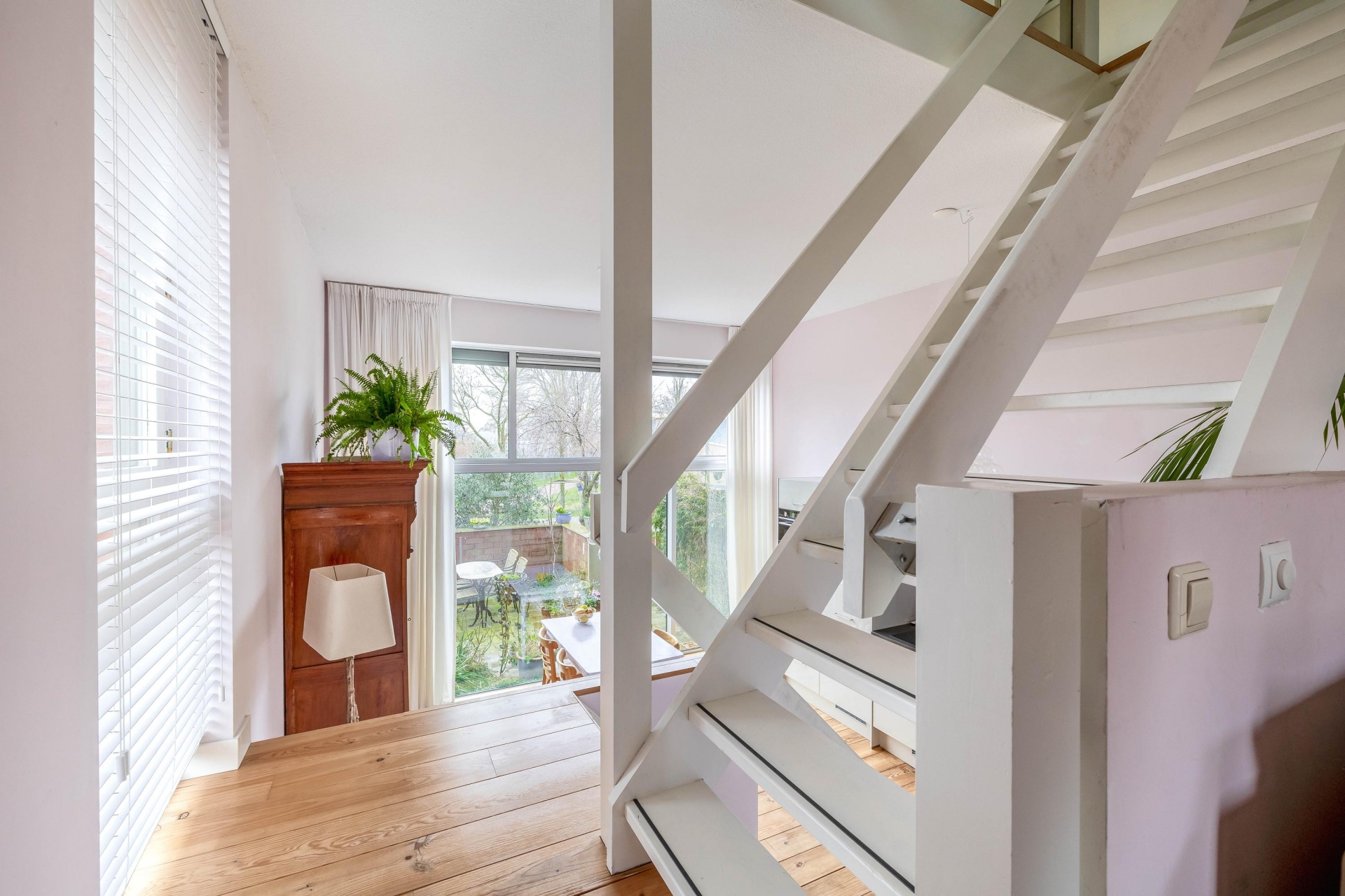 De indeling wijkt net even af van standaard en dat maakt deze woning juist zo aantrekkelijk. De woonkamer bevindt zich op de eerste verdieping en biedt een prettige, lichte leefruimte. Aan de terraskant ligt de woonkeuken. Deze grenst direct aan het terras en vormt daarmee het hart van het huis. De keuken is in 2021 vernieuwd en uitgevoerd in een moderne, rechte opstelling met diverse inbouwapparatuur. Er is volop ruimte voor een grote eettafel, waardoor koken, tafelen en samenzijn hier moeiteloos samenkomen. Op de derde verdieping bevinden zich twee slaapkamers en de ruime badkamer. De grootste slaapkamer op deze verdieping is heerlijk licht en biedt voldoende plek voor een groot bed en kastruimte. De tweede kamer is perfect als kinderkamer, werkplek of logeerkamer. De badkamer is compleet uitgevoerd met een ligbad, douchecabine, dubbele wastafel en een tweede toilet. De bovenste verdieping telt nog eens twee ruime slaapkamers. De grootste kamer op deze etage is bijzonder royaal en kan ook uitstekend dienen als master bedroom. De vierde slaapkamer is eveneens van goed formaat. Op de overloop bevindt zich de cv-ruimte.