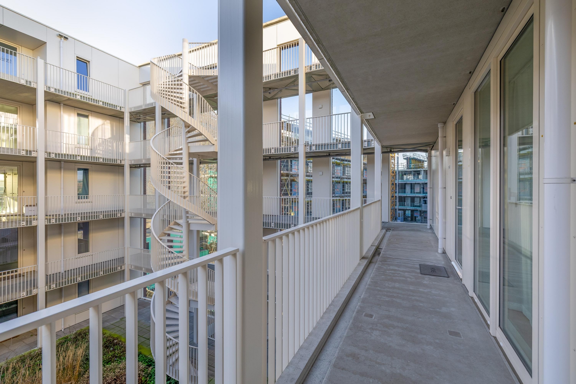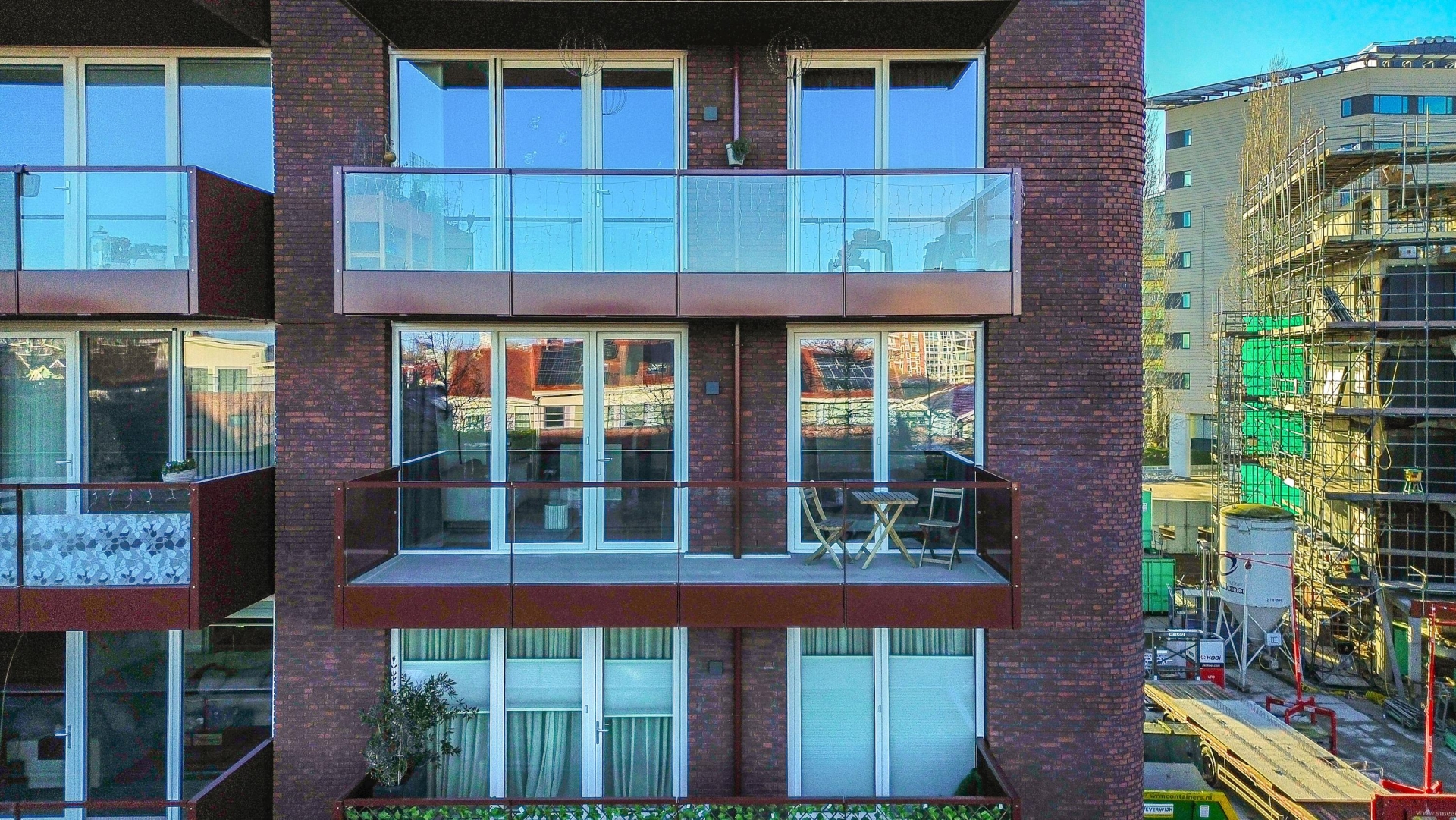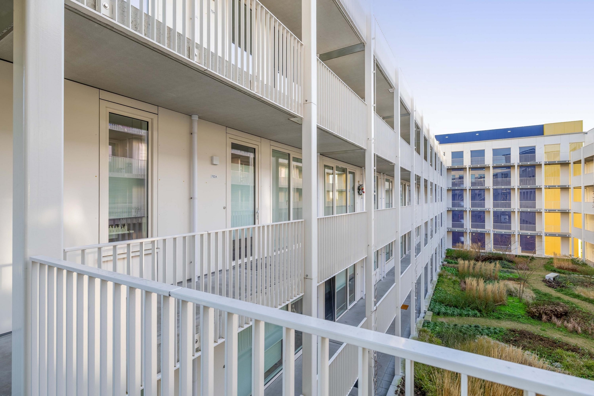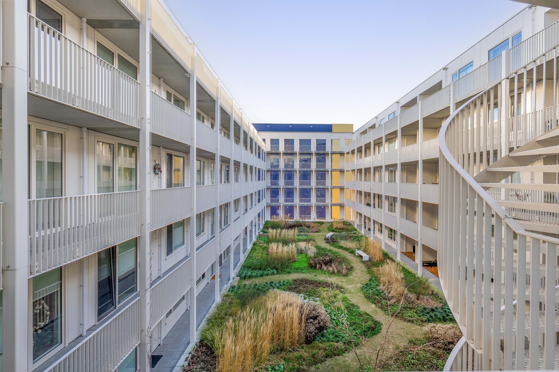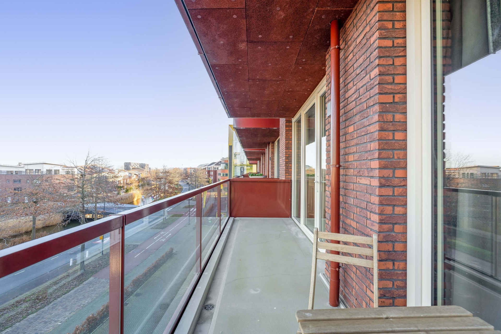 Voor de entree van het appartement is ruimte voor een zitje met uitzicht op het binnenterrein van het complex, een fijne plek om even buiten te zitten.