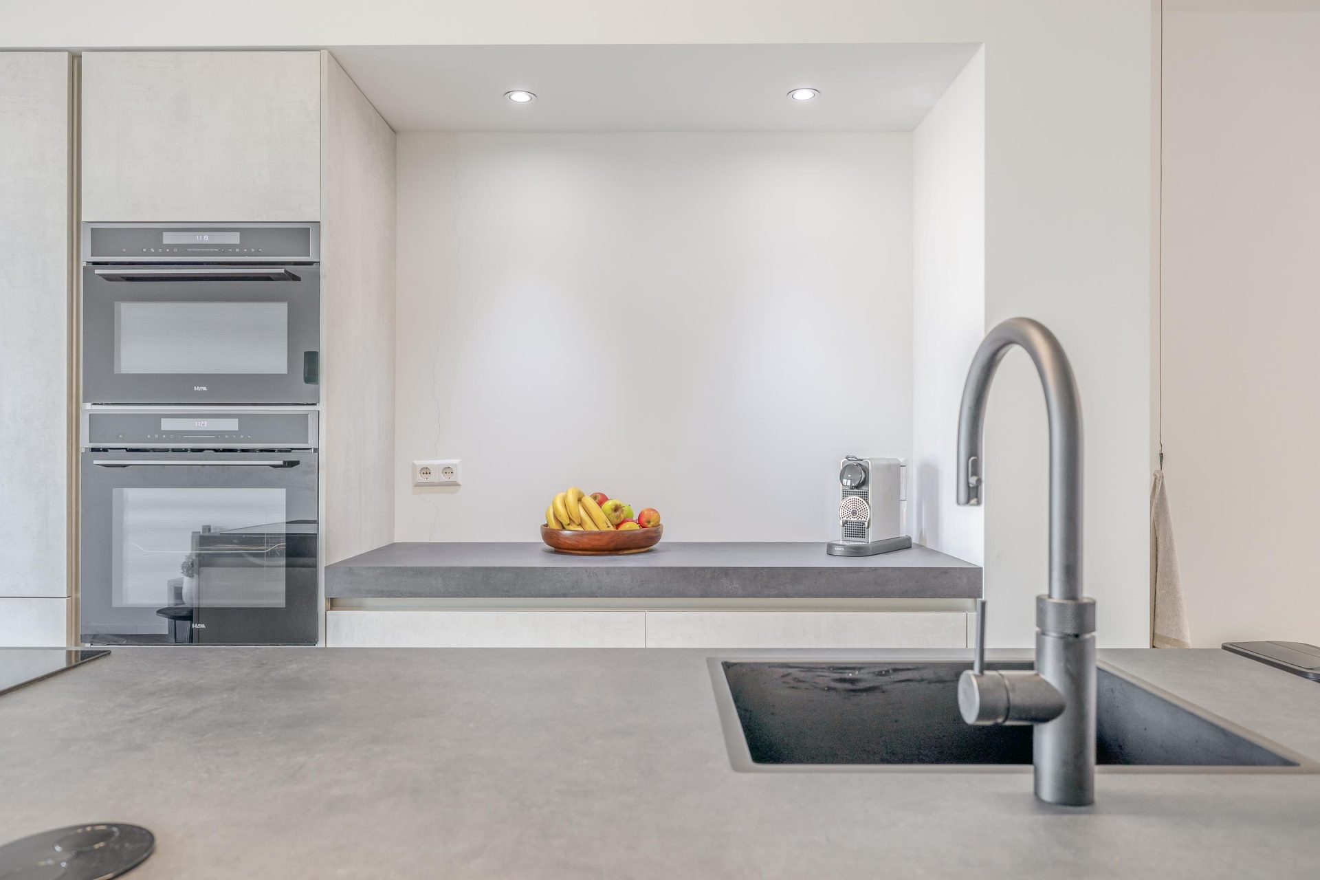 De keuken is zonder twijfel één van de eyecatchers van deze woning. De lichte kleurstelling geeft de keuken een luxe en moderne uitstraling. Uiteraard is de keuken volledig uitgerust met hoogwaardige inbouwapparatuur, waaronder een oven en combi-oven, een inductiekookplaat met geïntegreerd afzuigsysteem, een koel-vriescombinatie en een vaatwasser.