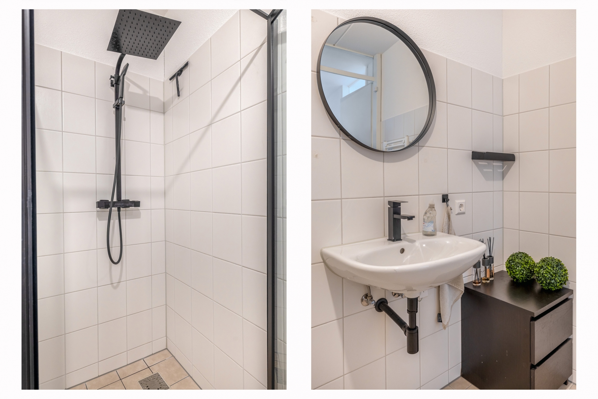 De badkamer is modern afgewerkt en voorzien van een ruime douche, een fraai wastafelmeubel en een toilet.
