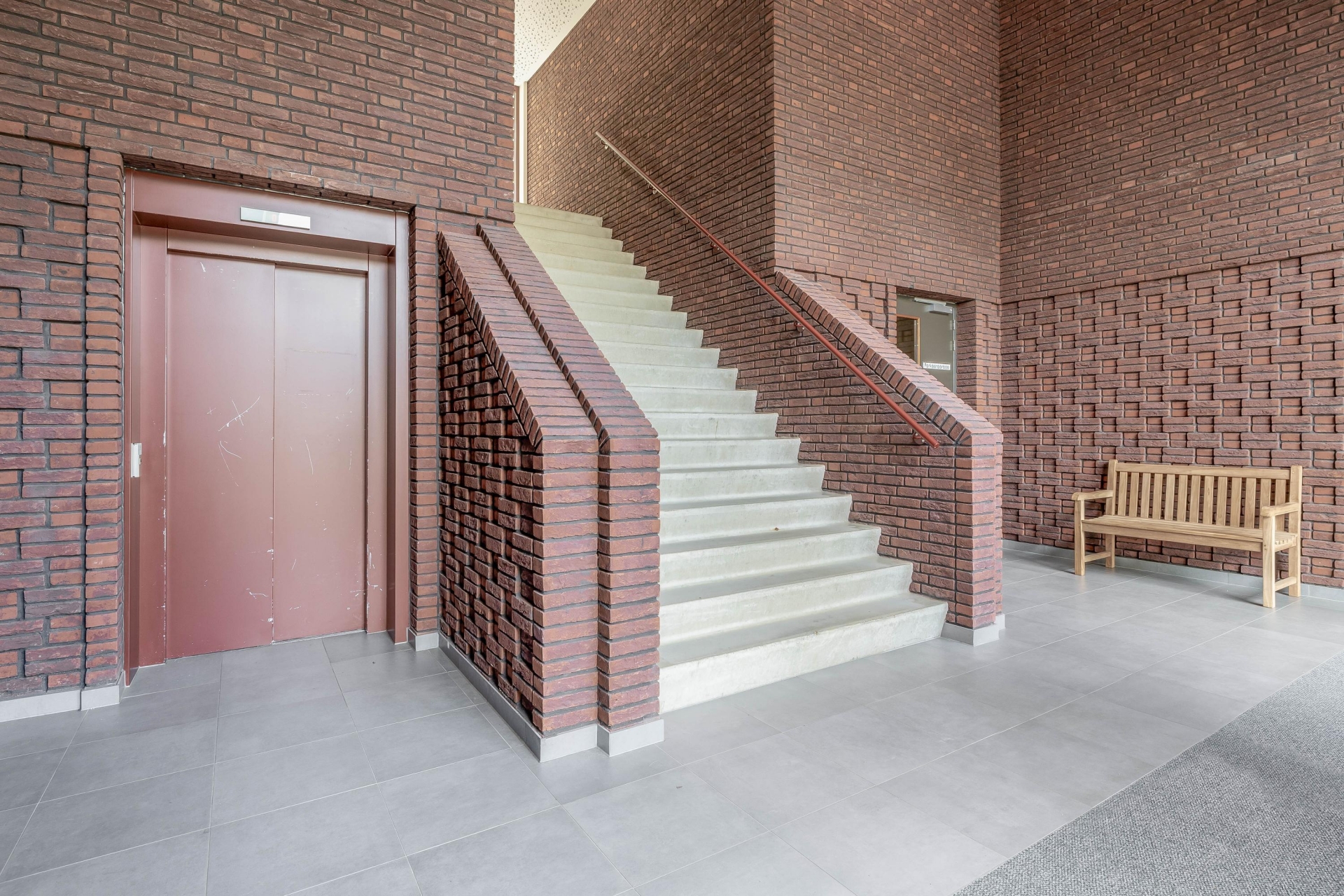 Voor de entree is genoeg ruimte voor een zitje, met uitzicht op het binnenterrein van het complex.