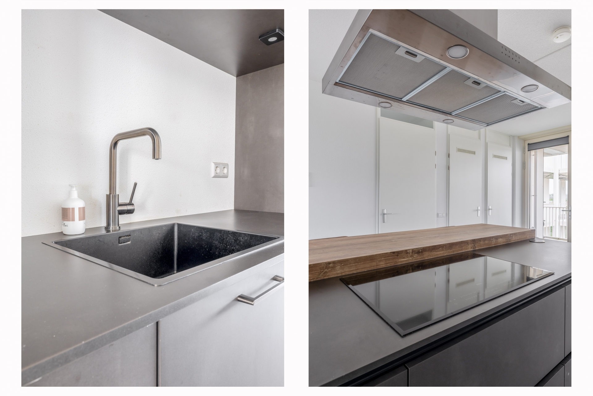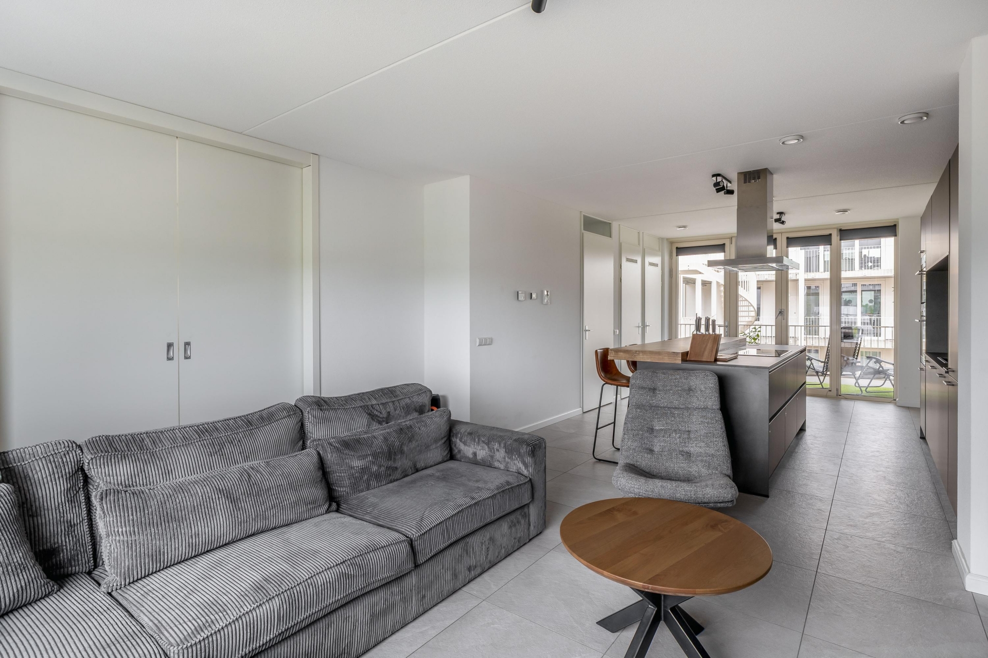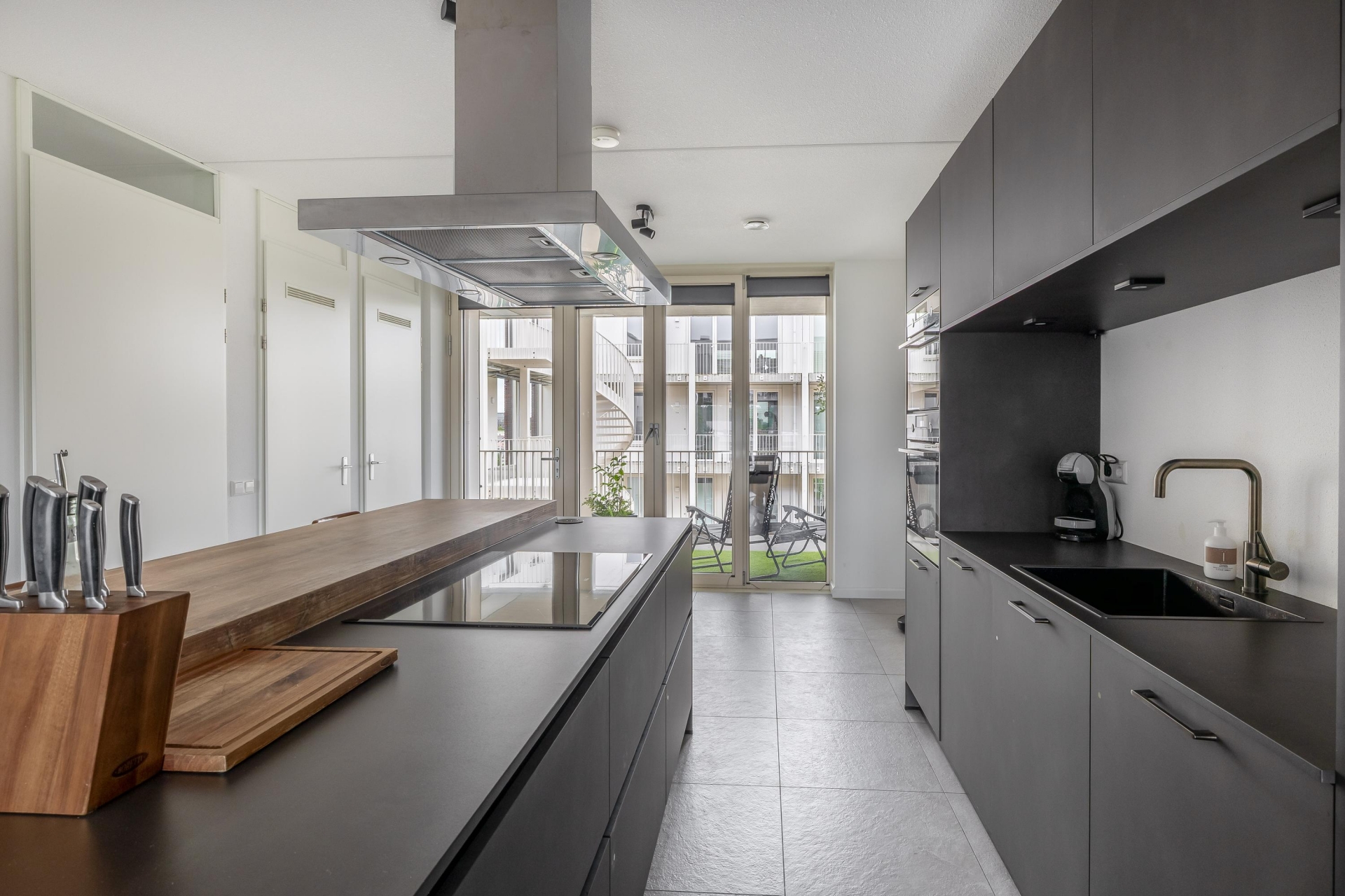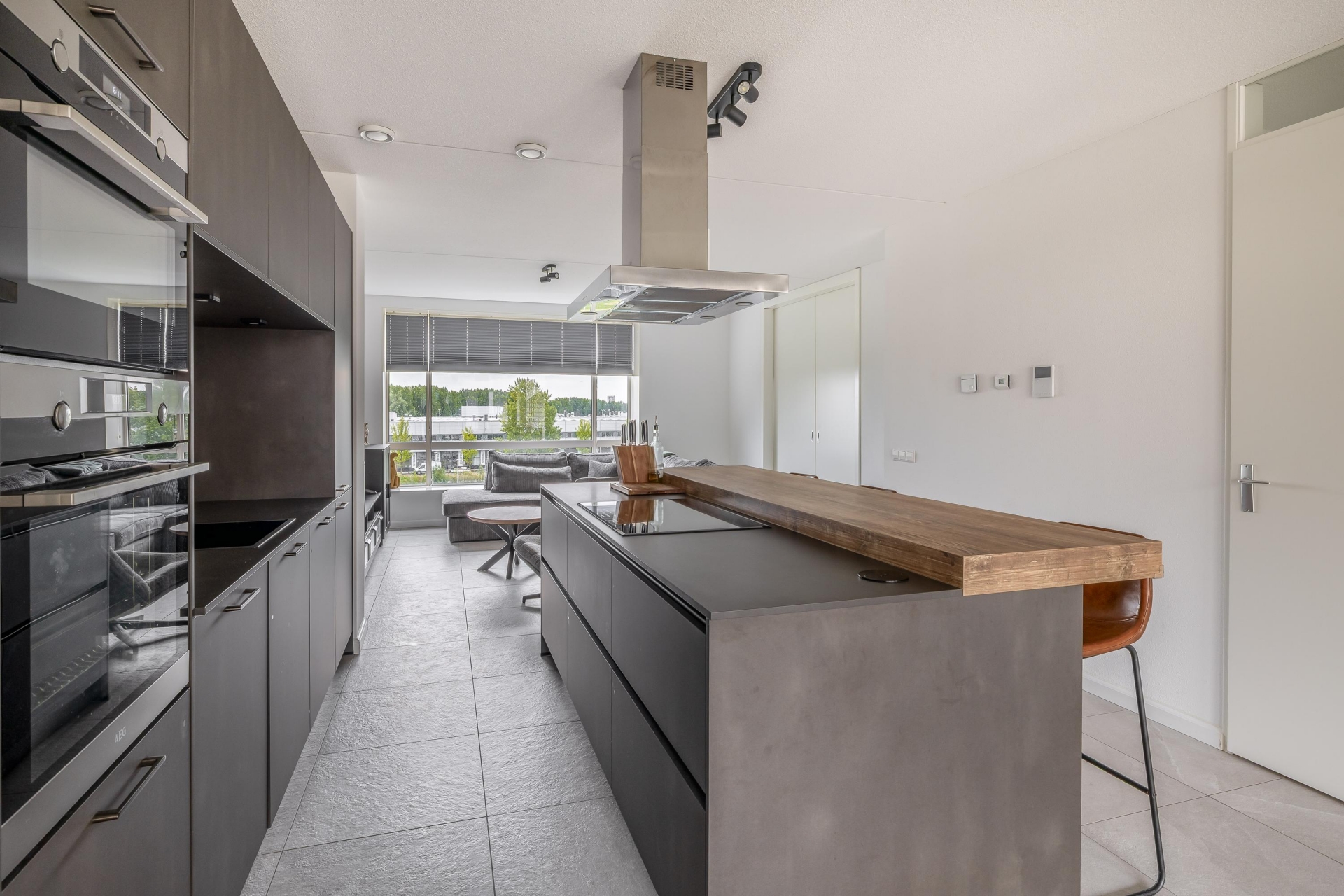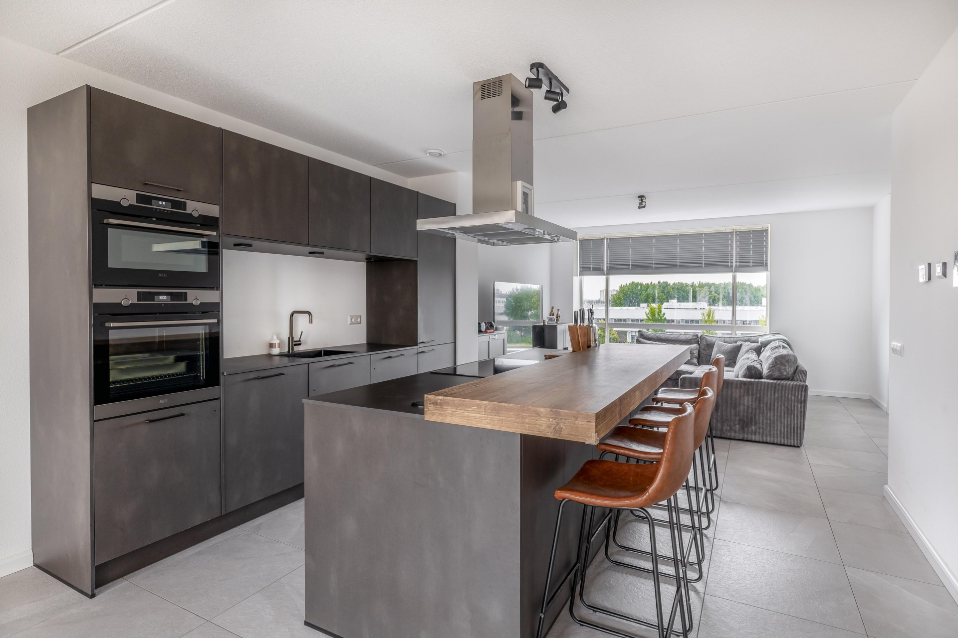 De keuken is zonder twijfel een van de eyecatchers van dit huis. De donkere kastenwand in combinatie met het robuuste kookeiland en houten barblad zorgen voor een luxe uitstraling. Natuurlijk is deze keuken volledig uitgerust met moderne inbouwapparatuur, waaronder een oven en combi-oven, inductiekookplaat met afzuigkap, koel-vriescombinatie en vaatwasser. Vanuit de eetkamer heb je direct toegang tot een heerlijk zitje buiten — een fijne plek voor je eerste kop koffie of een goed glas wijn aan het eind van de dag.