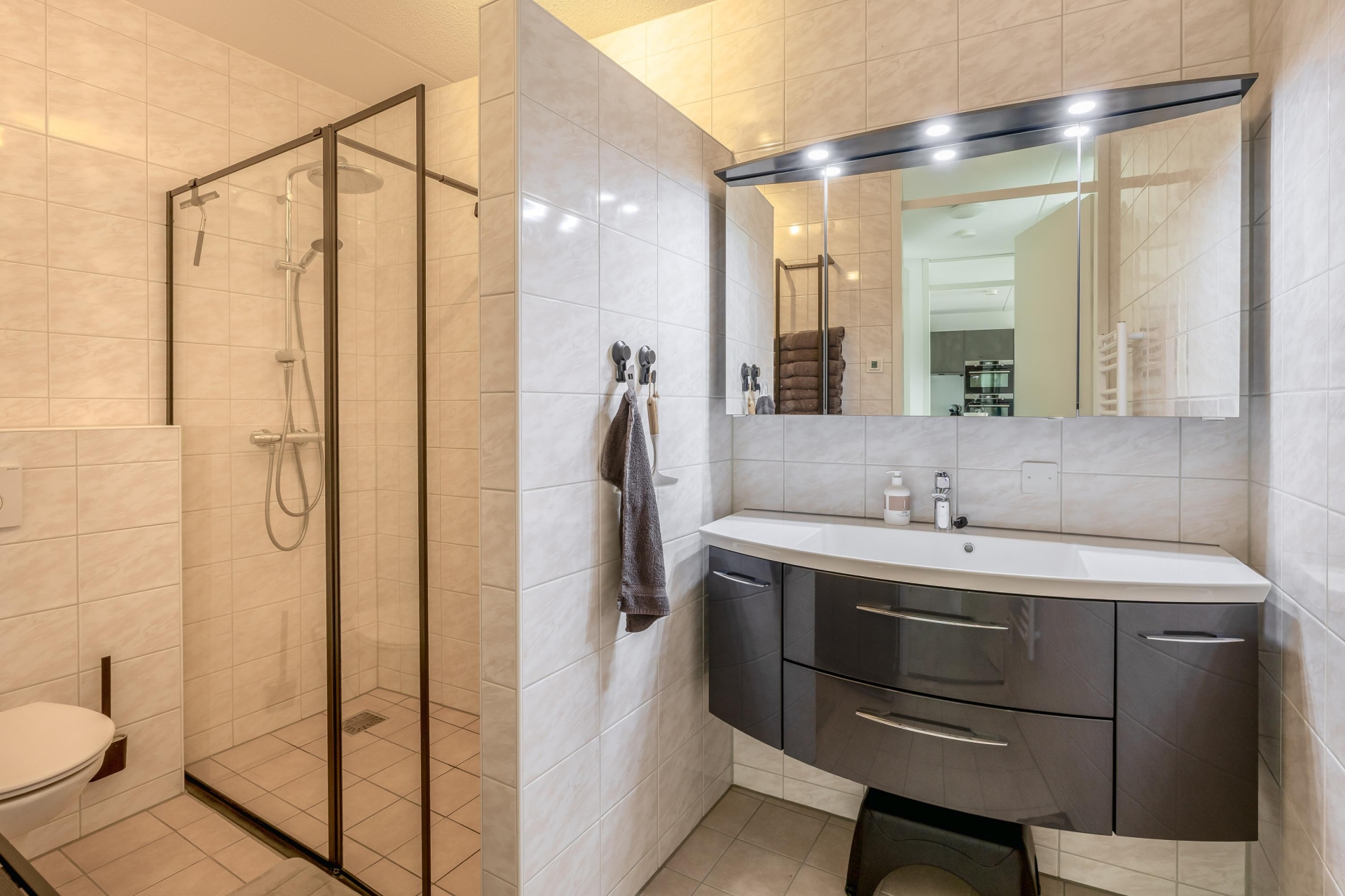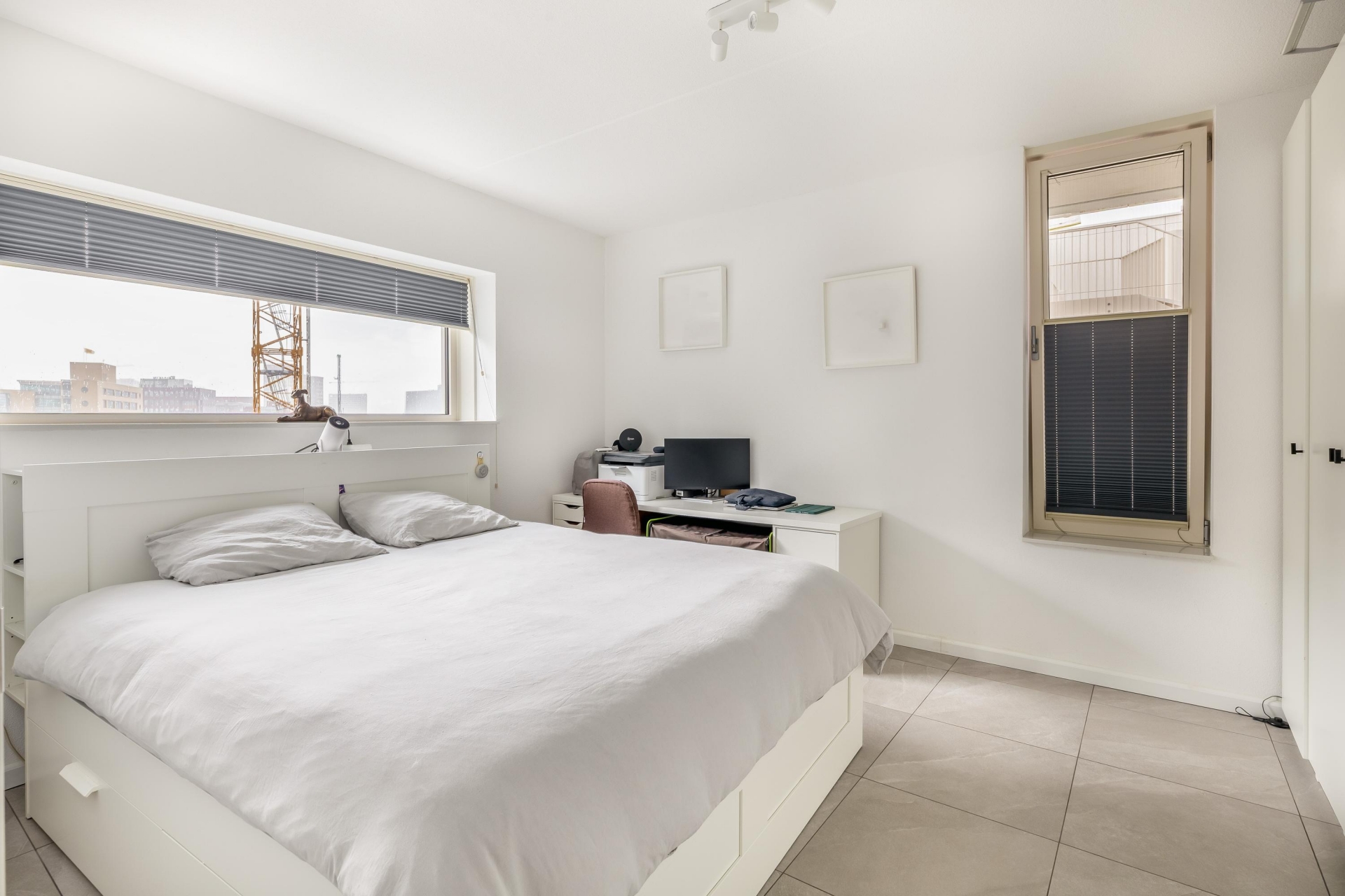 Het appartement beschikt over twee slaapkamers, beide van goed formaat. De grootste slaapkamer biedt ruimte voor een tweepersoonsbed en een grote kast, de tweede slaapkamer is ideaal als werk- of logeerkamer, of natuurlijk als kinderkamer. De badkamer is modern afgewerkt met een ruime douche, fraai wastafelmeubel en toilet.