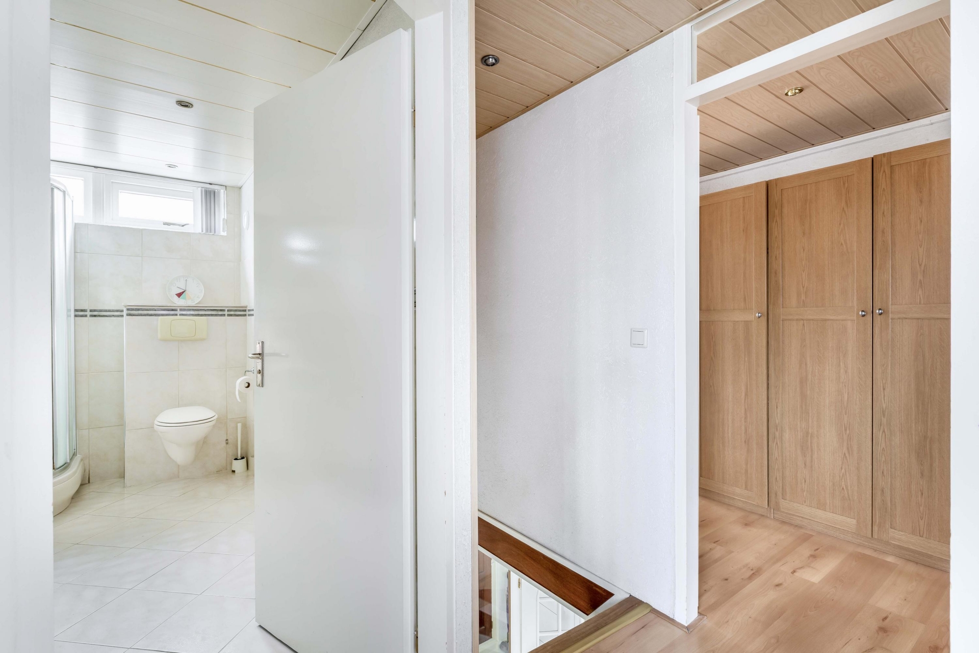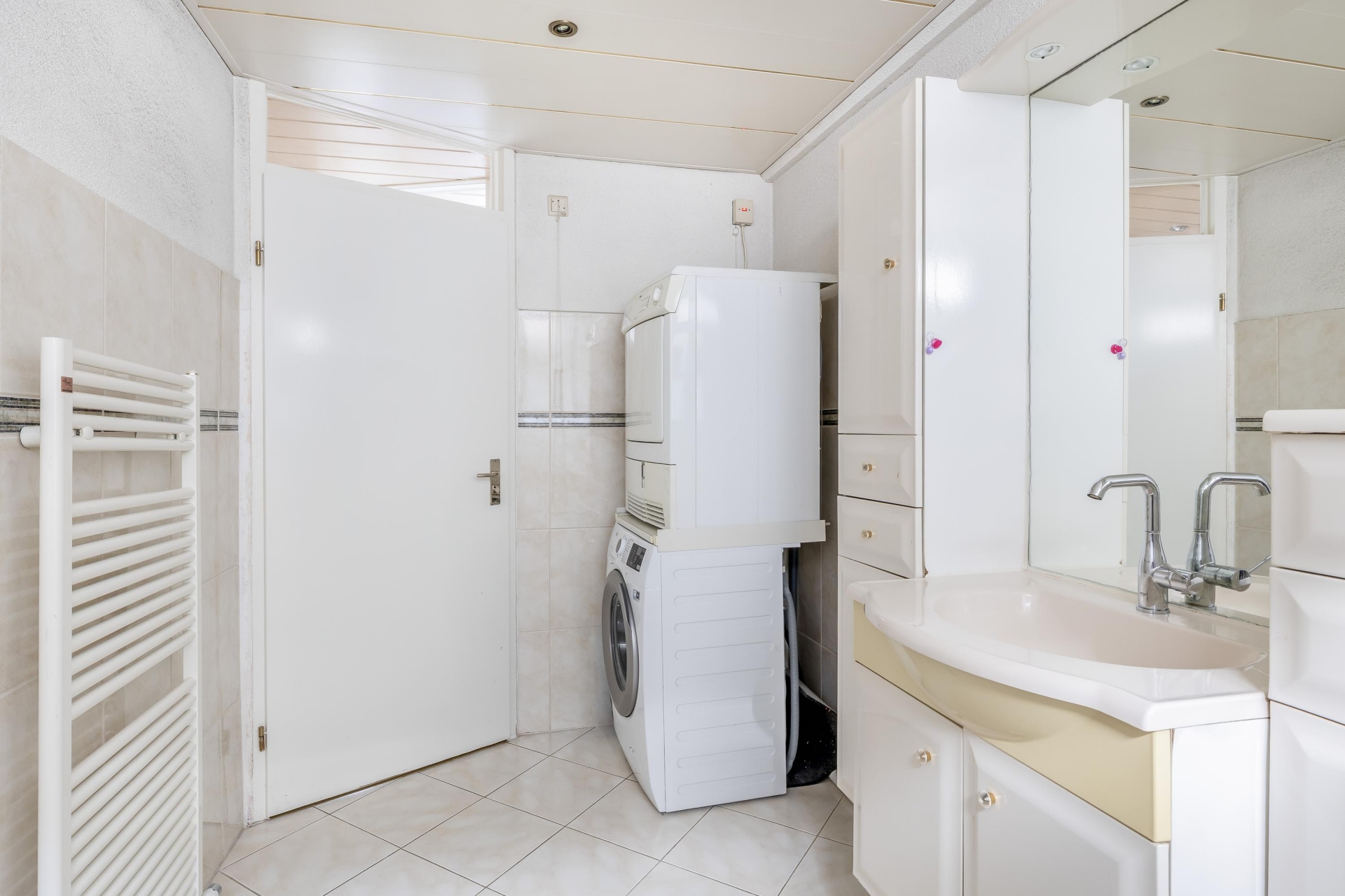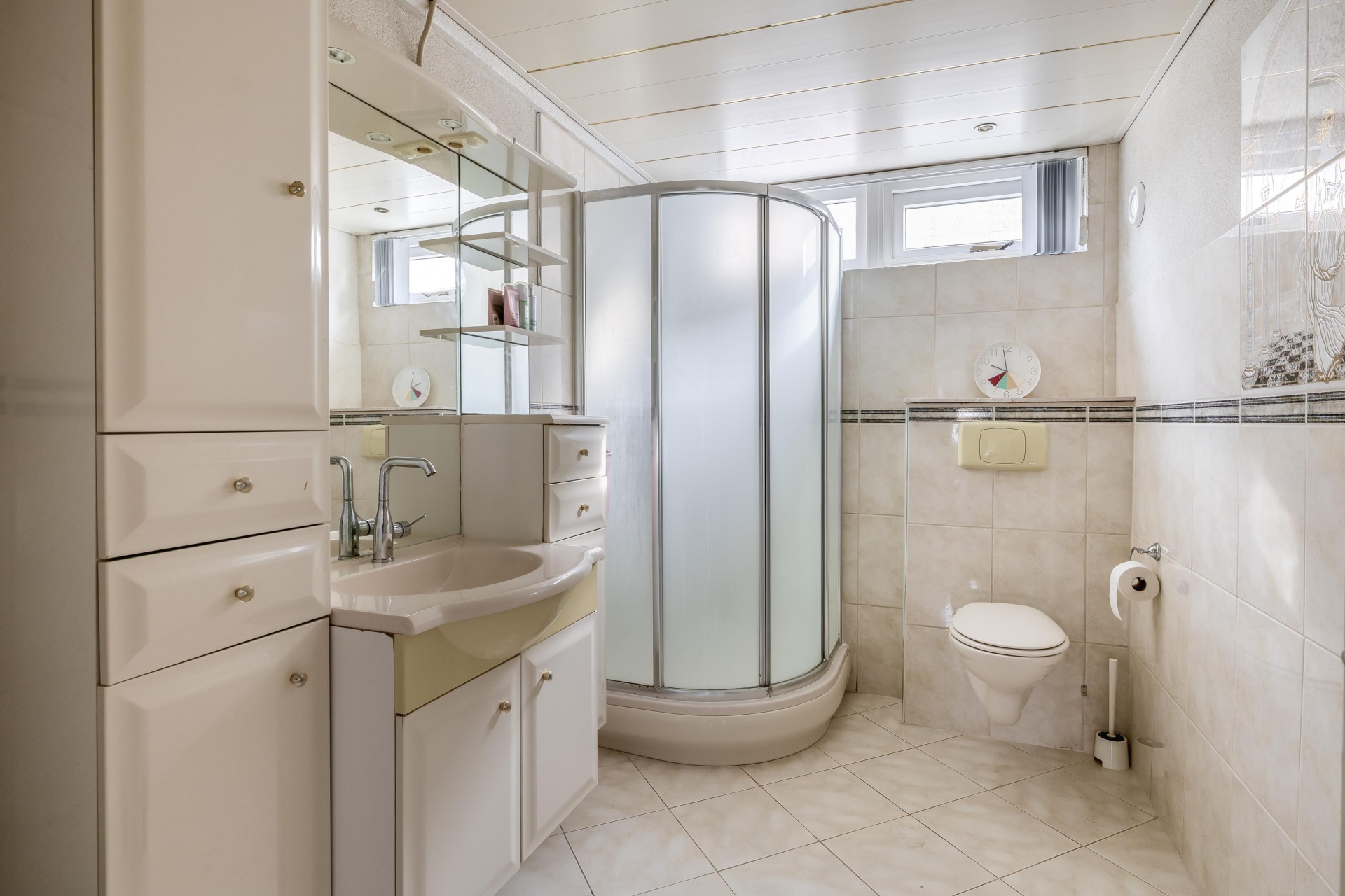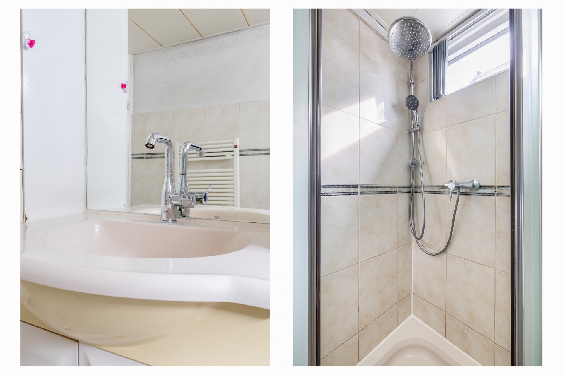 Tevens treft u hier de badkamer welke is voorzien van een douche, toilet, wastafelmeubel en aansluiting voor de wasmachine/droger.