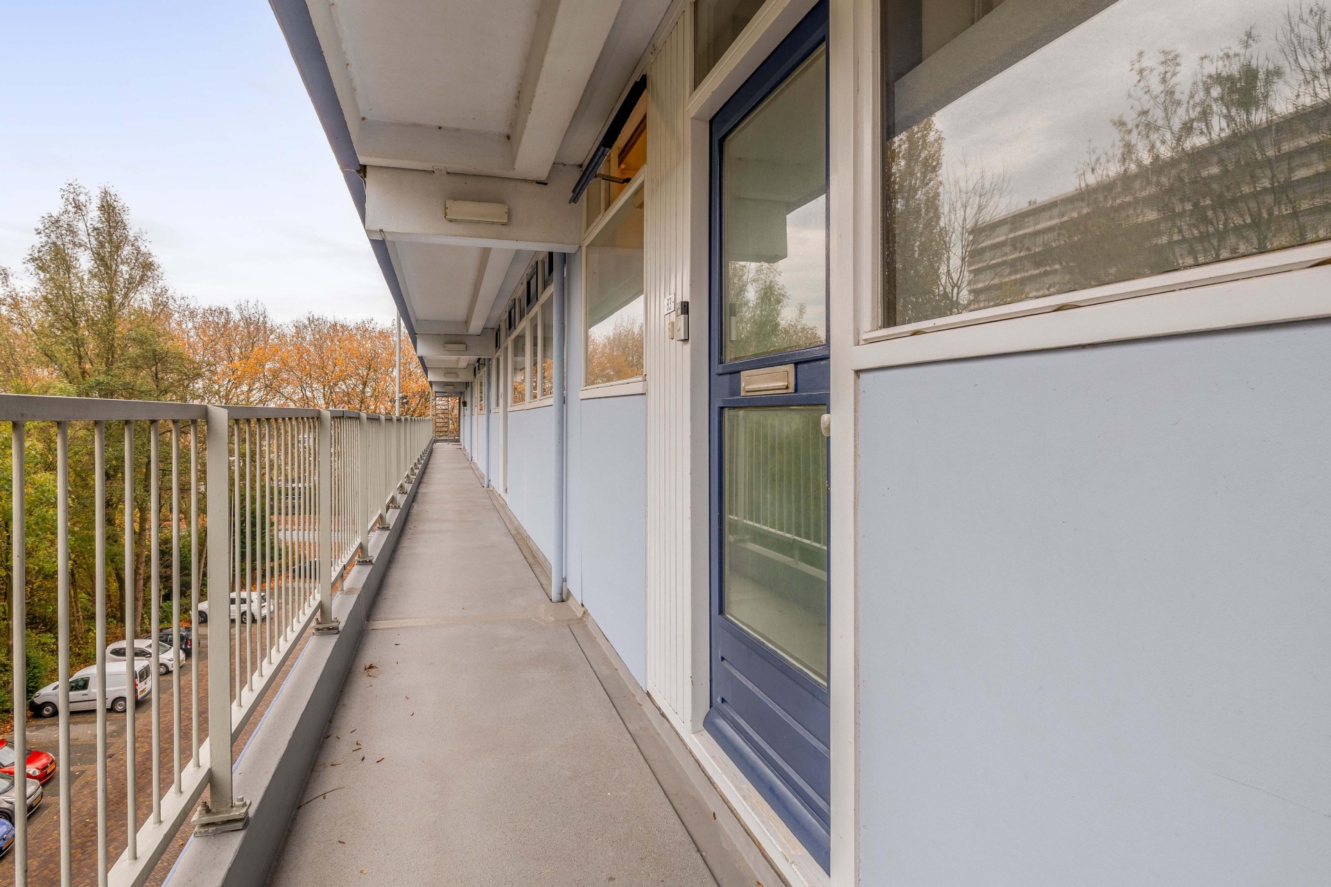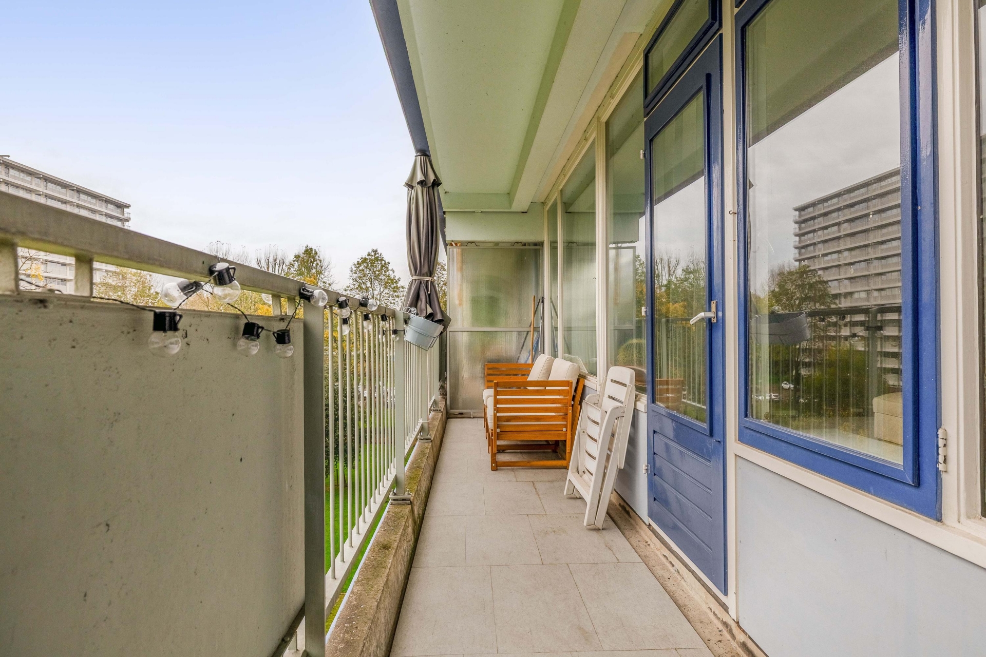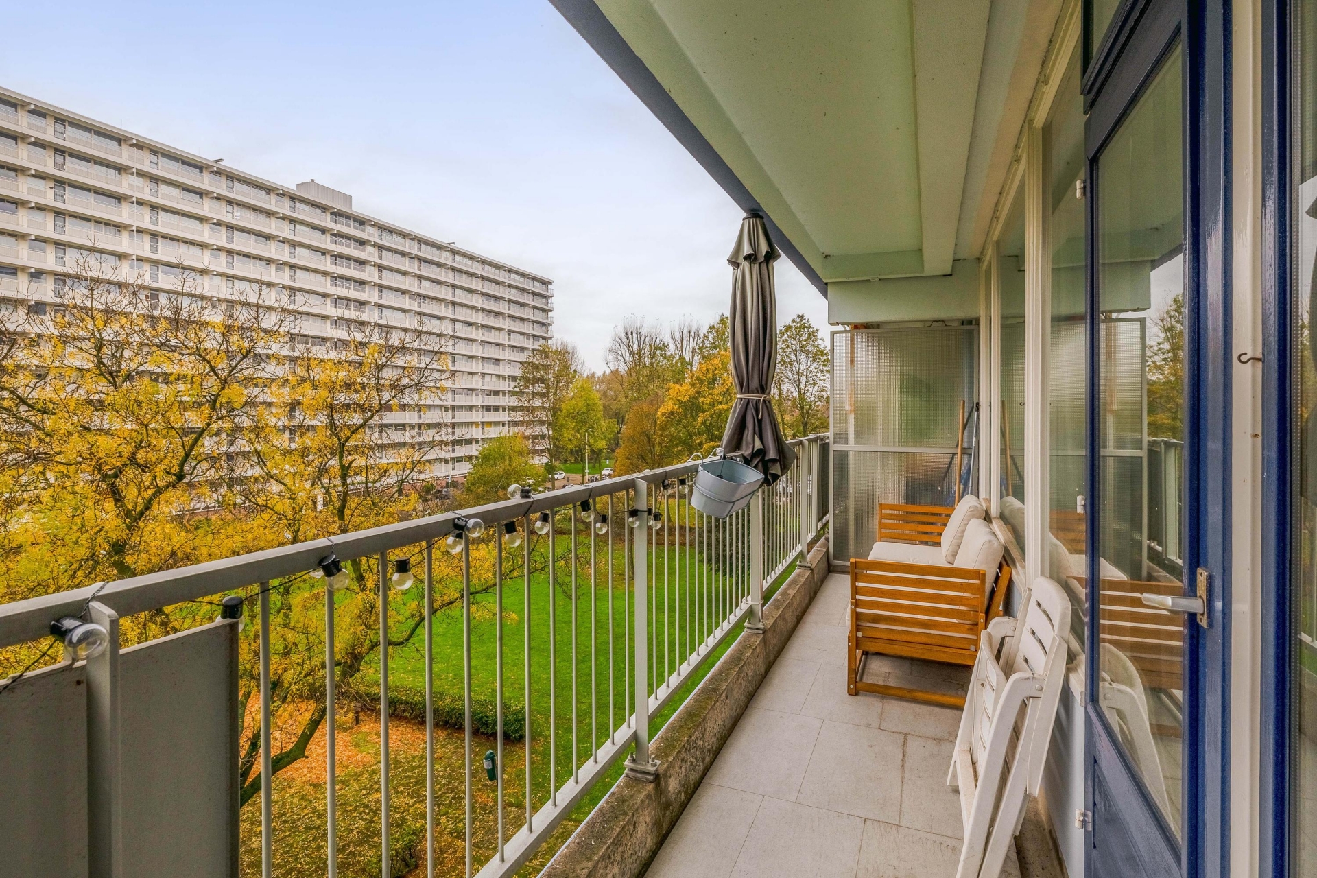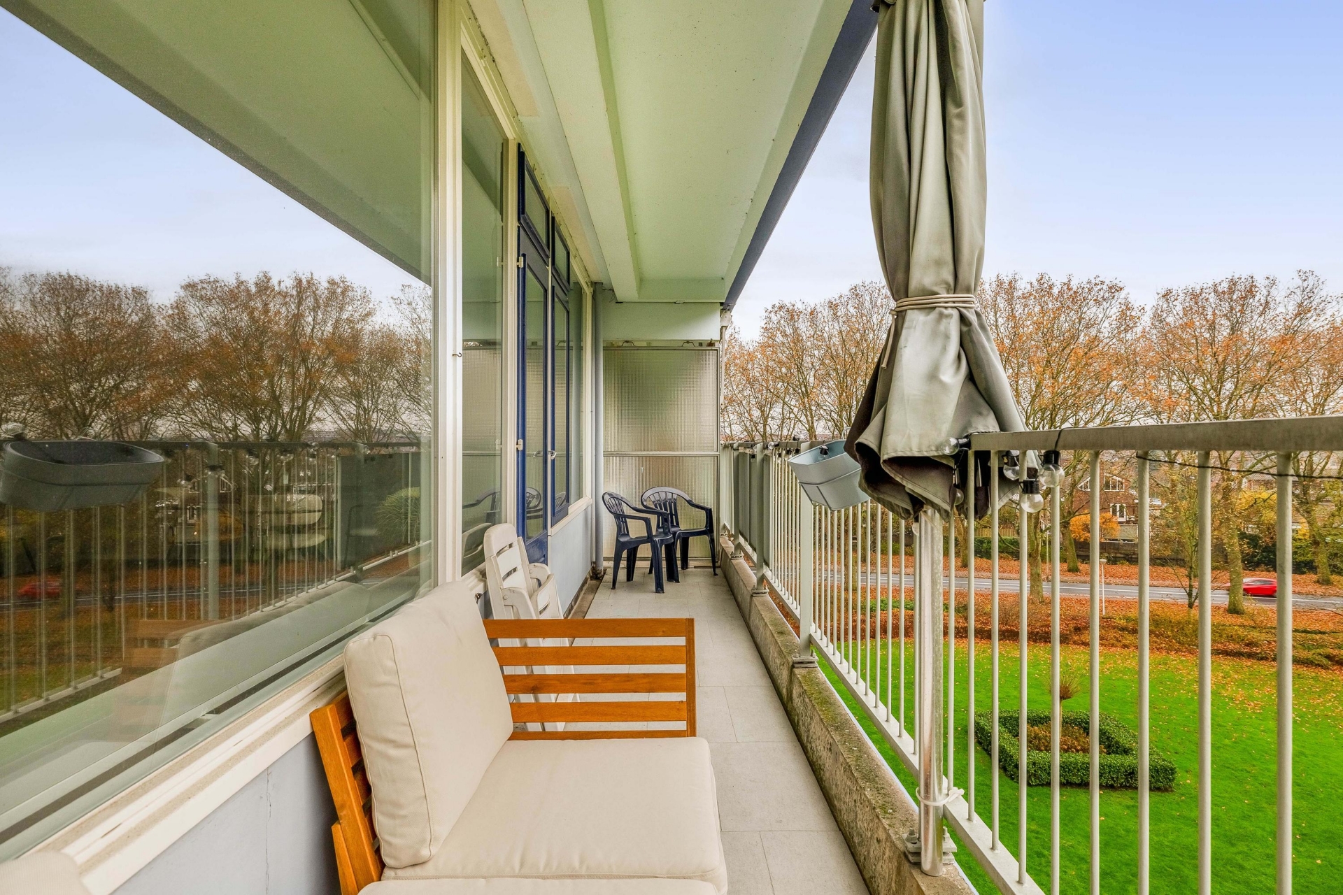 Grenzend aan de woonkamer ligt het ruime balkon op het zuidwesten. Dit is echt een verlengstuk van je leefruimte. Je kunt hier in de middag en avond genieten van de zon, of je nu een kop koffie drinkt in je eentje of borrelt met vrienden. Het uitzicht over het grasveld en de bomenrij maakt dit balkon een fijne plek om even tot rust te komen.