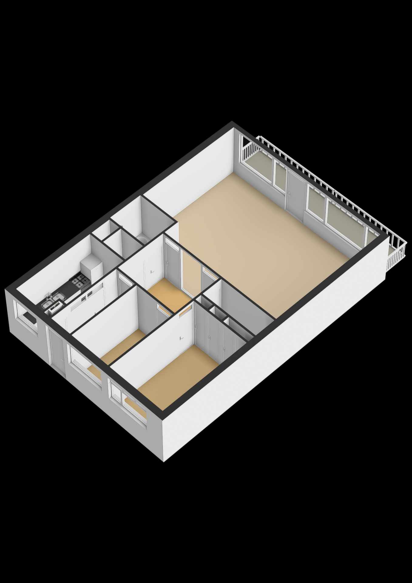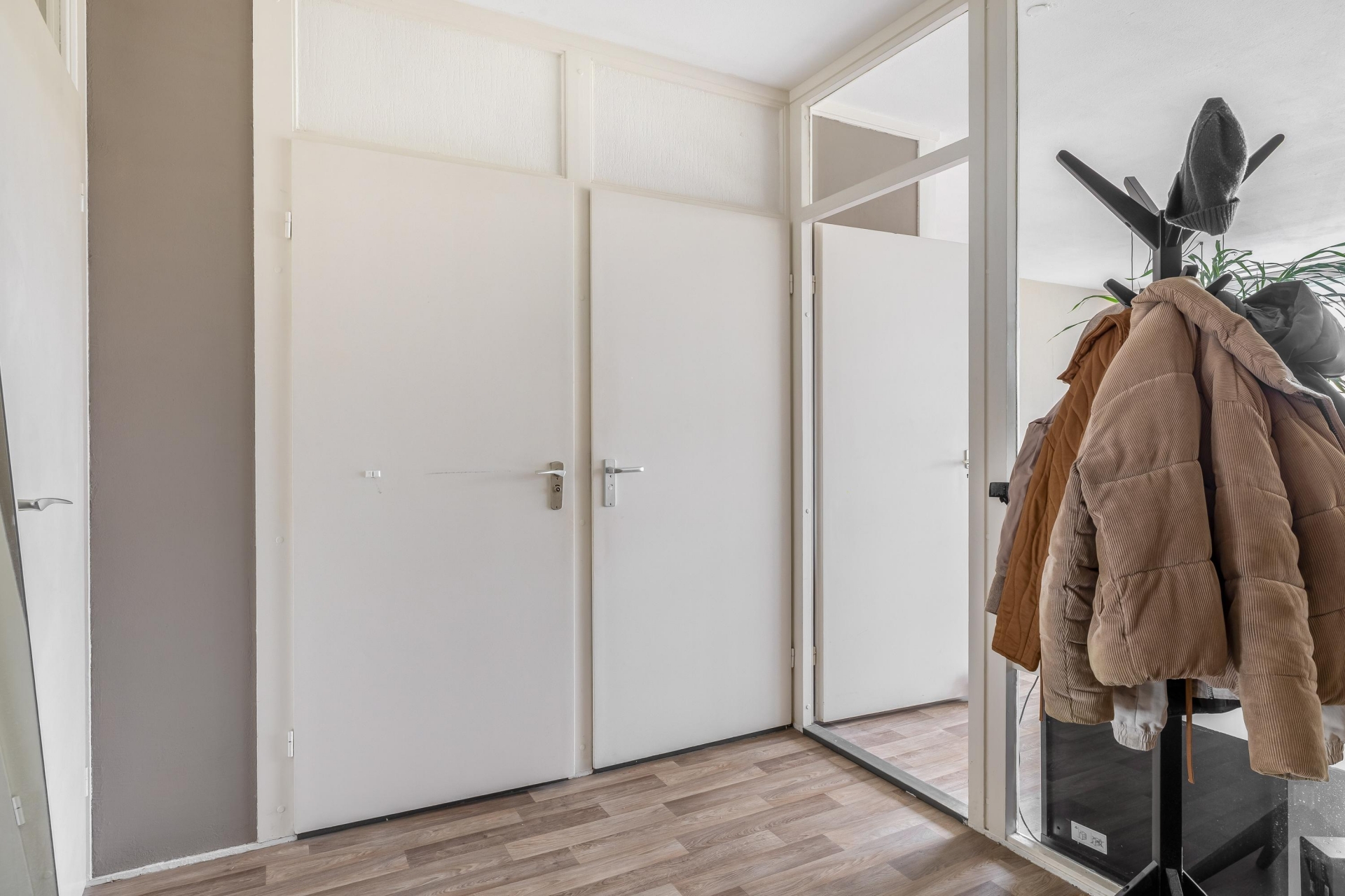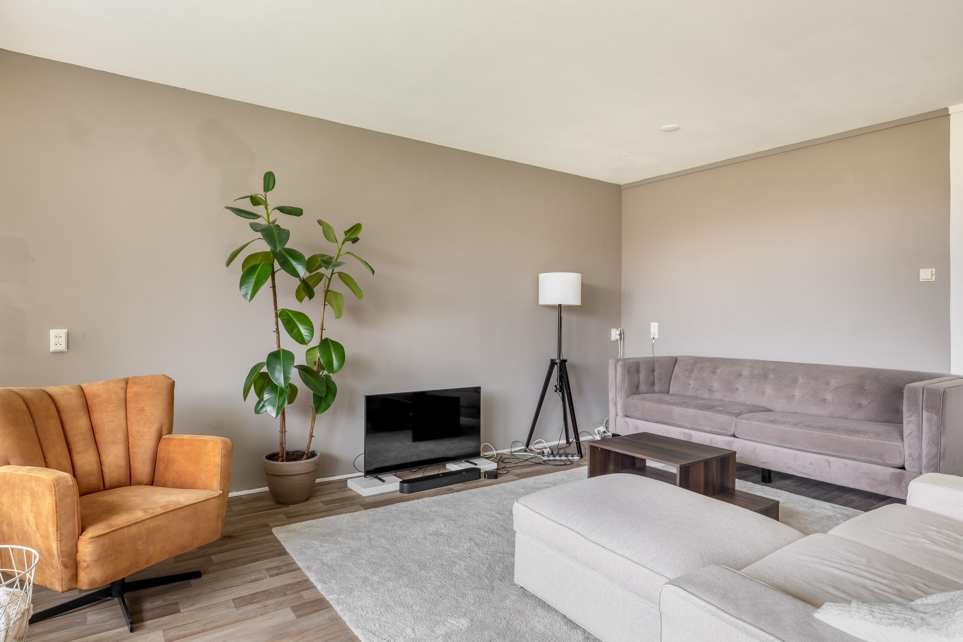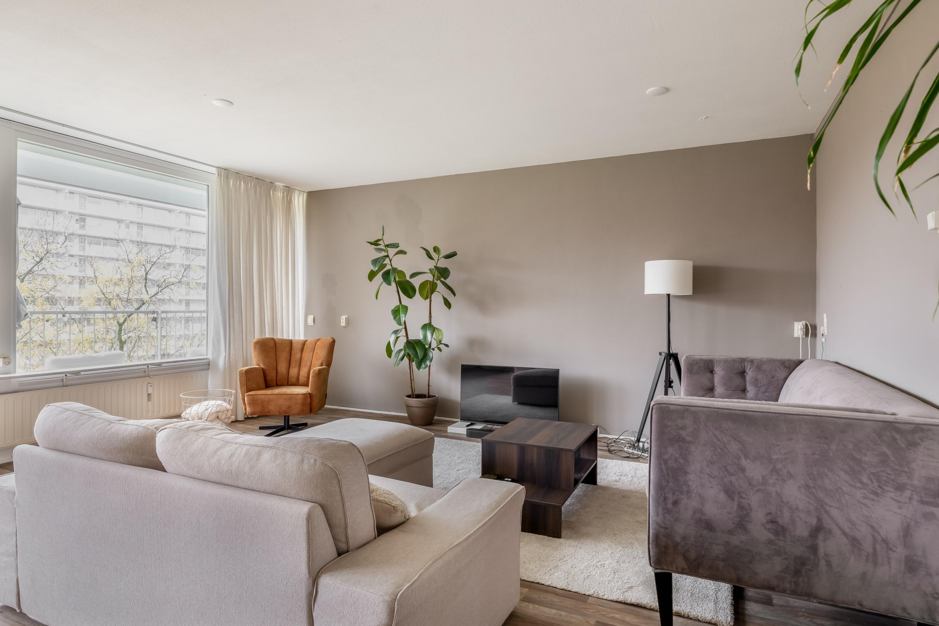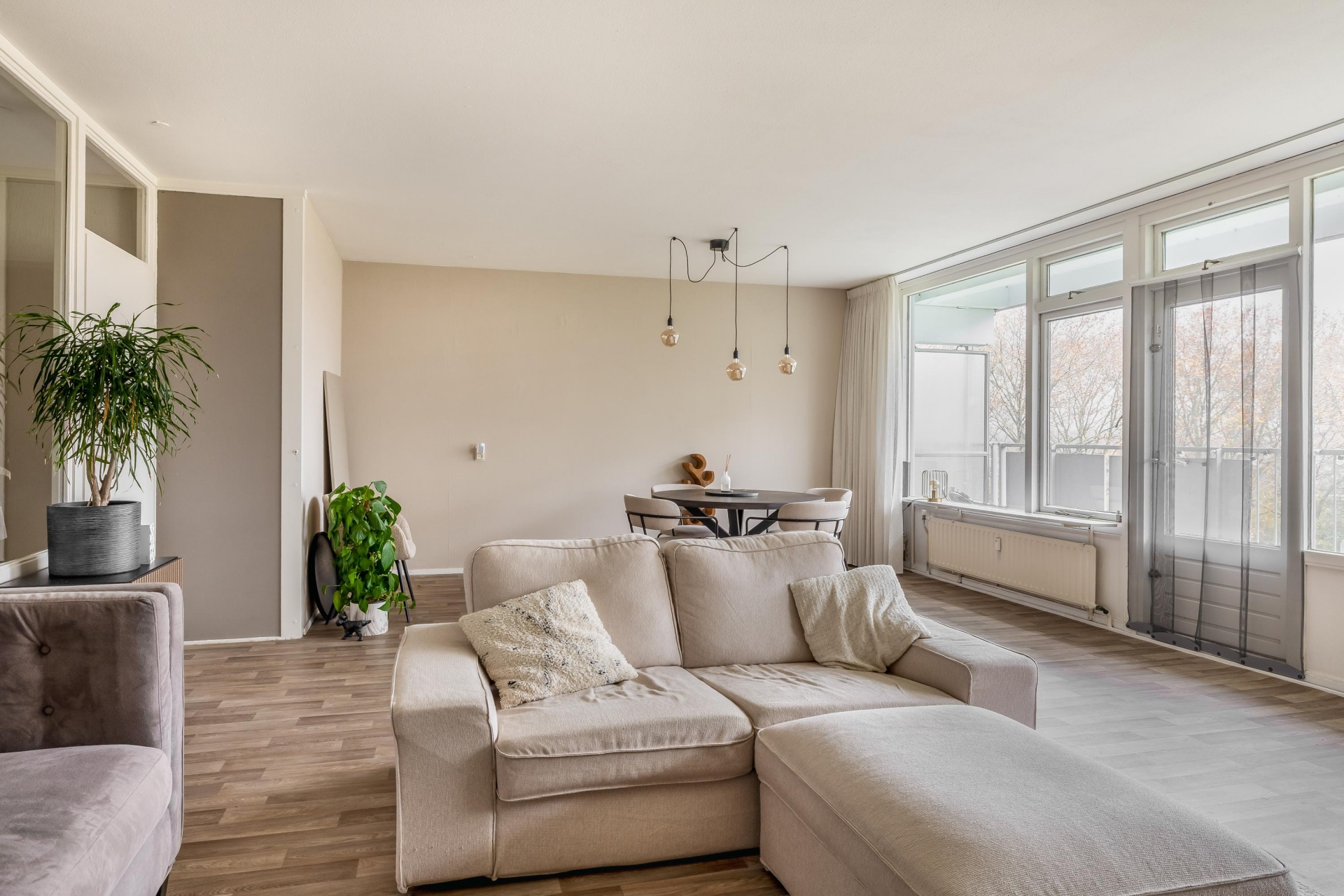Grenzend aan de woonkamer ligt het ruime balkon op het zuidwesten. Dit is echt een verlengstuk van je leefruimte. Je kunt hier in de middag en avond genieten van de zon, of je nu een kop koffie drinkt in je eentje of borrelt met vrienden. Het uitzicht over het grasveld en de bomenrij maakt dit balkon een fijne plek om even tot rust te komen.
