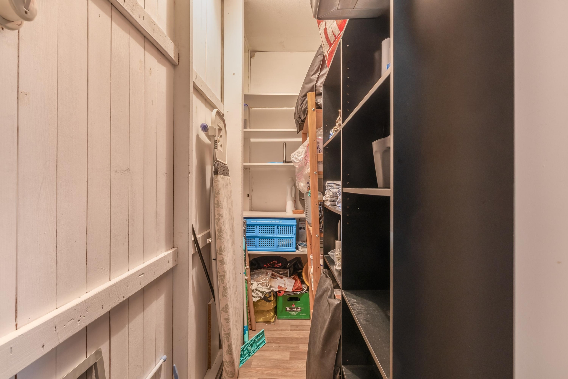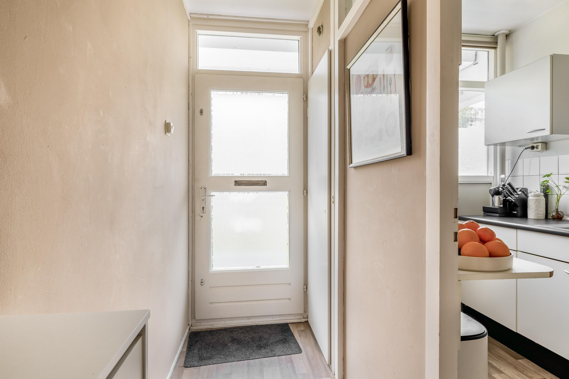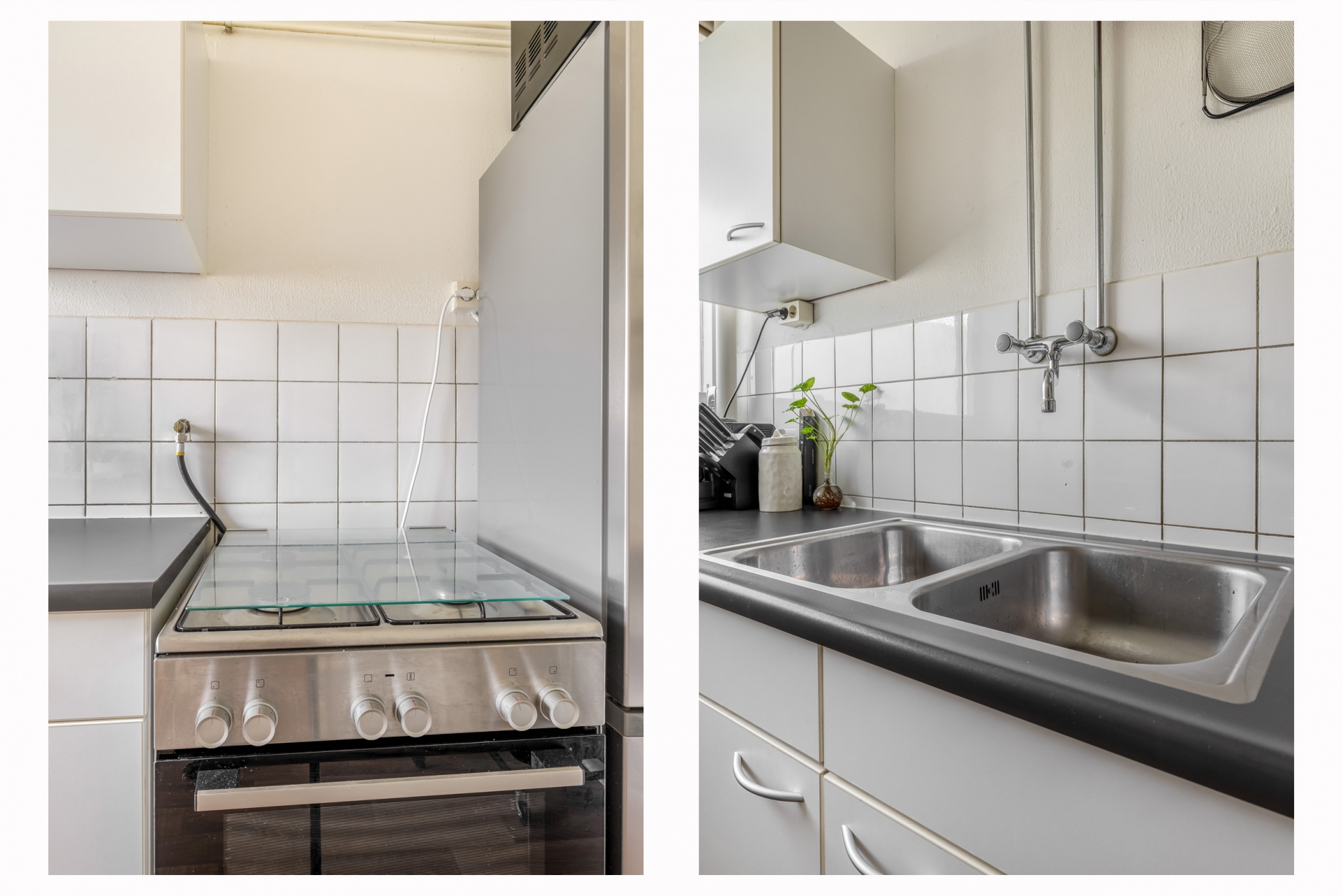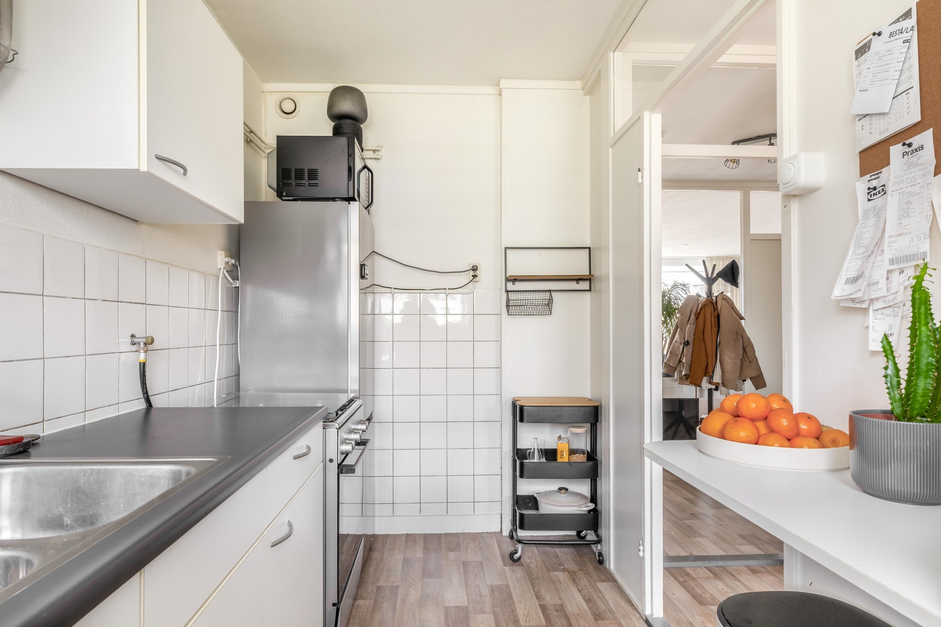 De keuken is netjes en functioneel ingericht, met voldoende werk- en bergruimte. Dankzij het raam aan de achterzijde is ook hier prettig daglicht aanwezig. Je hebt toegang tot een praktische bergkast en directe verbinding naar de hal.