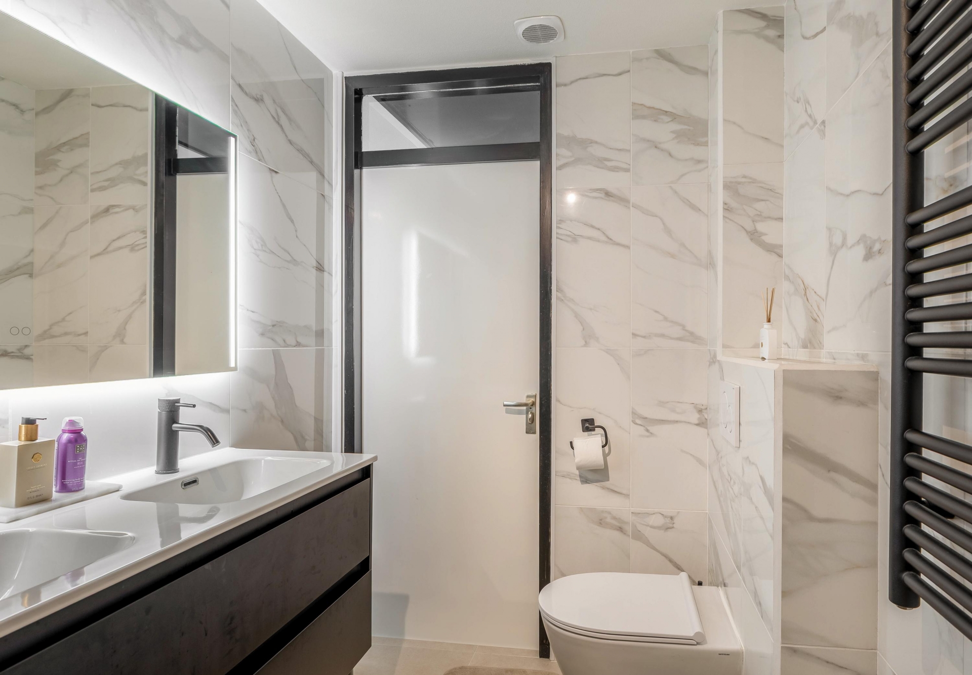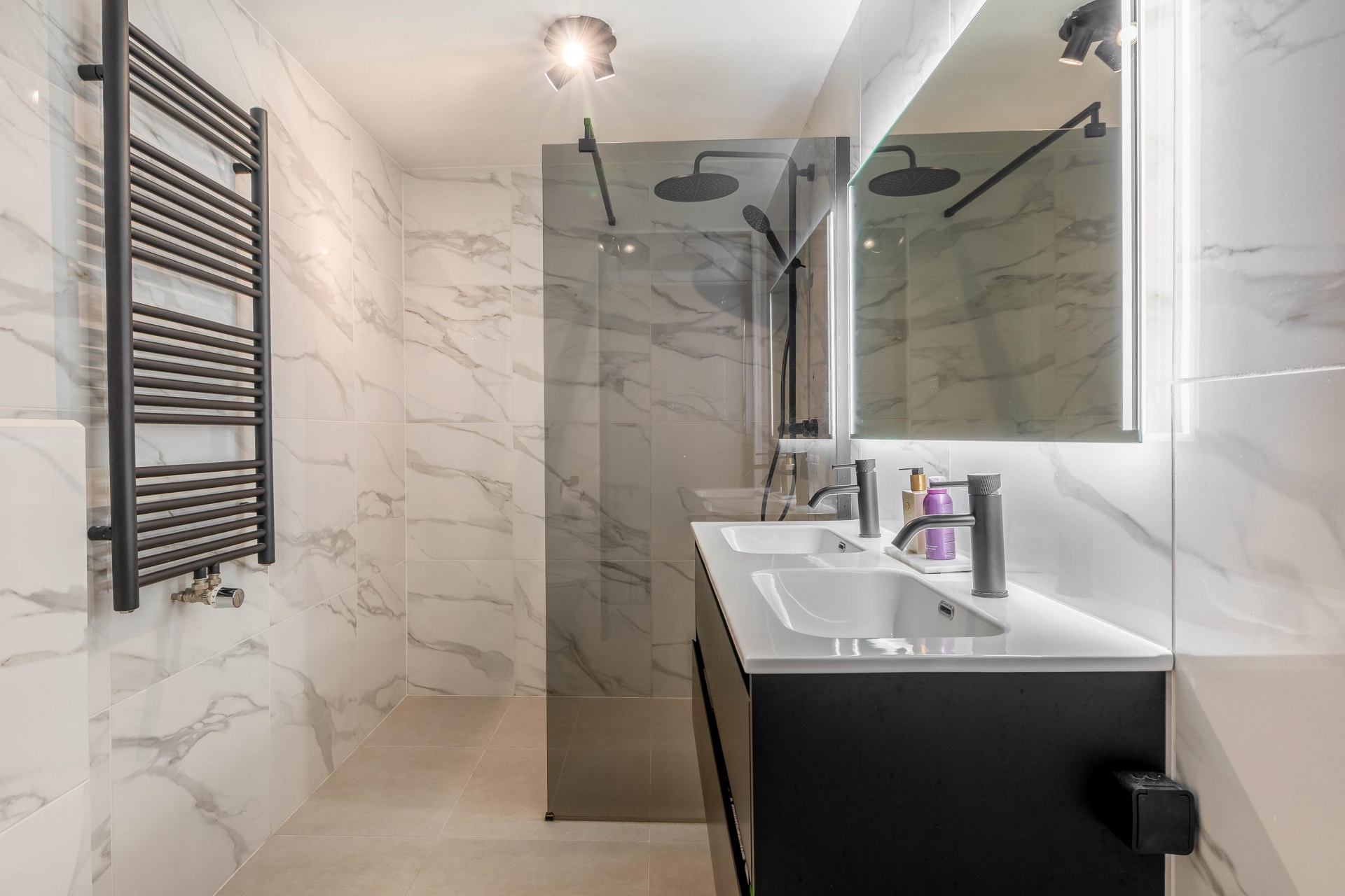 Op de eerste verdieping vind je vier volwaardige slaapkamers. De grootste slaapkamer ligt aan de achterzijde en biedt uitzicht op de tuin. De recent vernieuwde badkamer is stijlvol betegeld in een moderne marmerlook en voorzien van een dubbele wastafel, inloopdouche met regendouche en designradiator. Alles voelt hier fris en luxe aan.