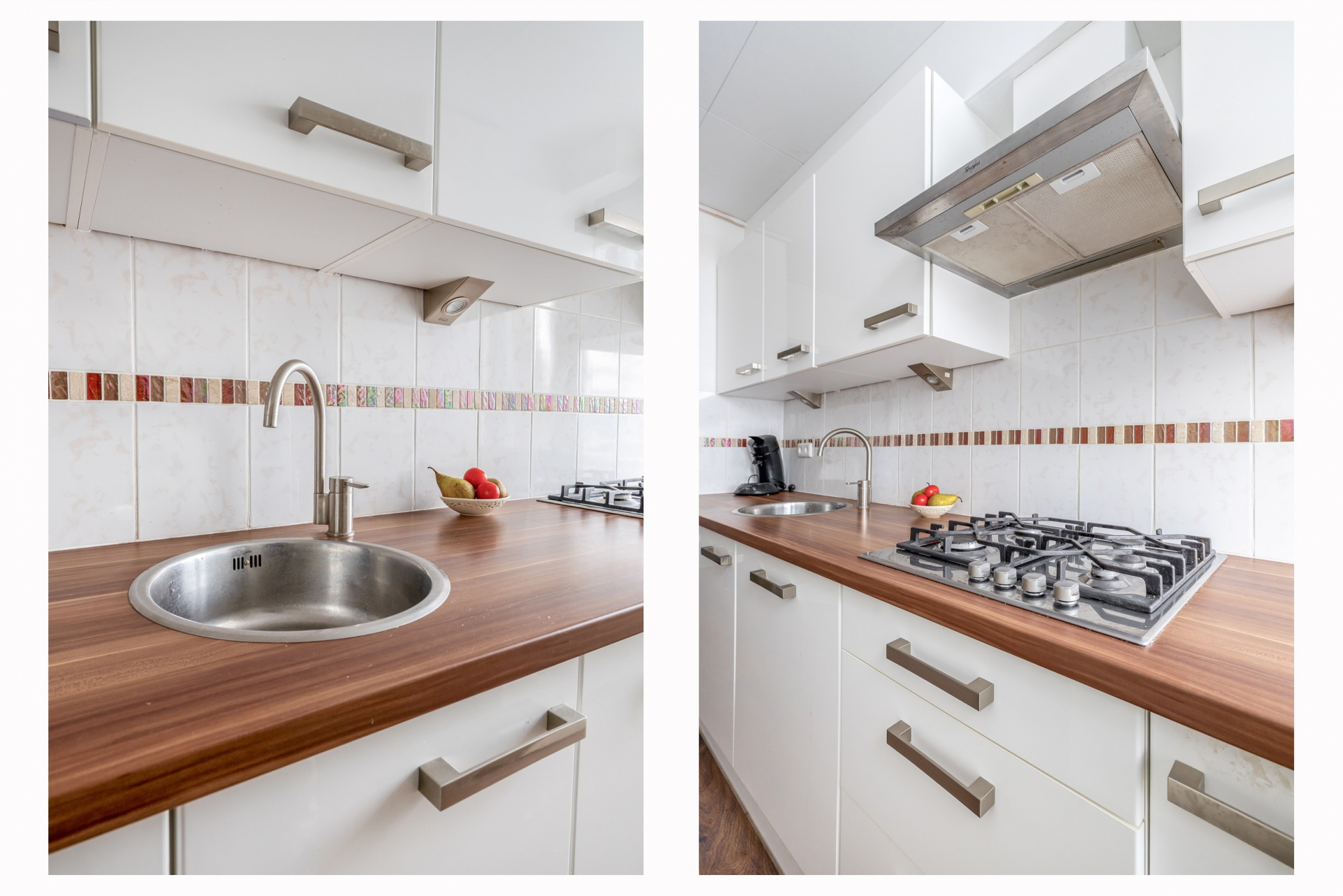 De dichte keuken is opgesteld in wandopstelling en beschikt over veel bergruimte. De keuken is recent verbouwd en voorzien van een nieuw plafond (september 2025). Uitgerust met een spoelbak, 4-pits gaskookplaat met afzuigkap, vaatwasser, koelkast en vriezer. De CV-ketel is netjes weggewerkt in een kast; de CV-installatie en radiatoren zijn in april 2025 goedgekeurd tot april 2027. Via een nieuwe deur (januari 2026) bereikt u het zonnige balkon op het zuidwesten.