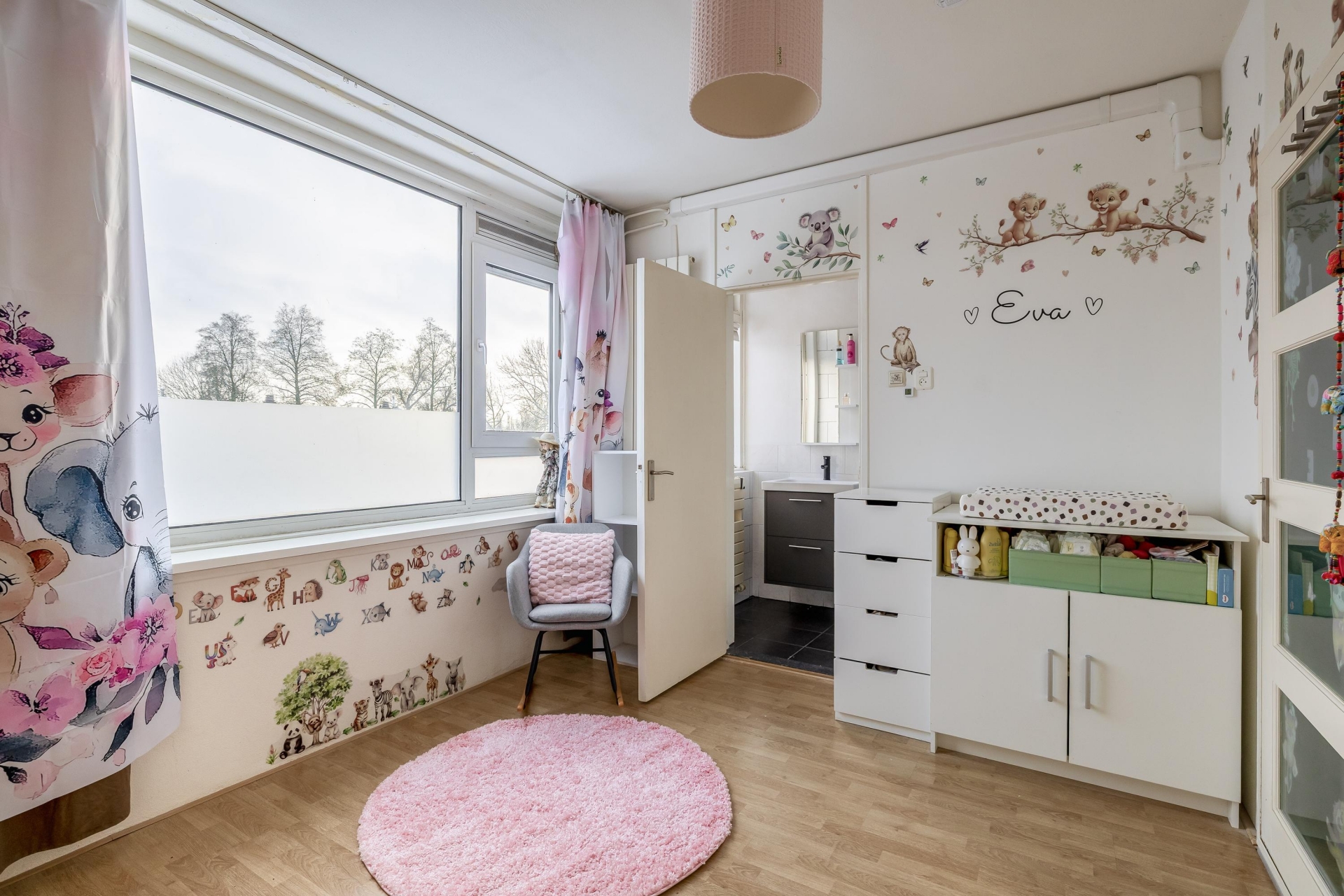 Slaapkamer 2: eveneens aan de voorzijde, met parketvloer, wasmachineaansluiting en een luxe kastenwand.