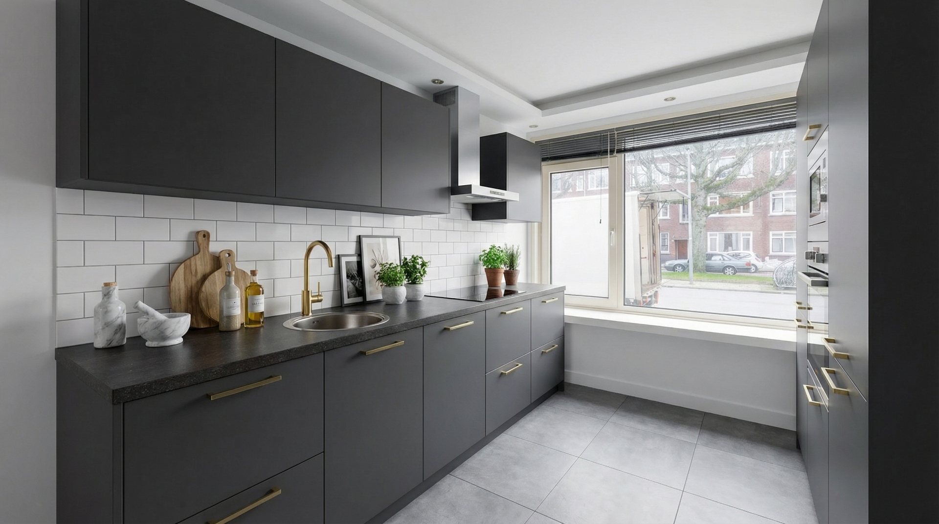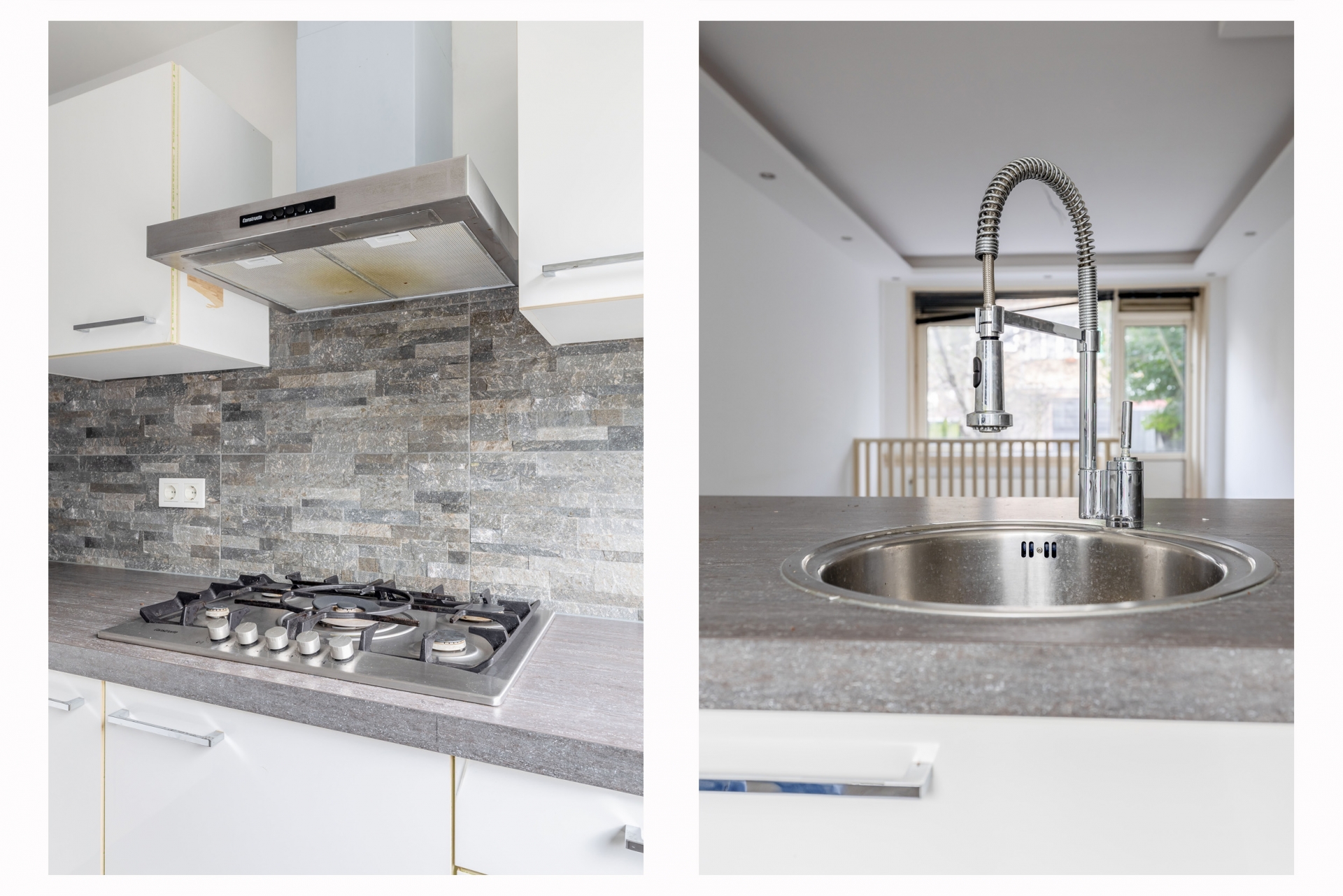 Je komt binnen op de begane grond, waar de woonkamer meteen opvalt door de prettige lichtinval en de open verbinding met de keuken. Dankzij de grote raampartijen aan de tuinzijde voelt deze leefruimte licht en open aan. Er is voldoende plek voor een comfortabele zithoek én een eettafel, waardoor dit echt een fijne plek is om thuis te komen na een lange dag. De open keuken sluit hier naadloos op aan en is praktisch ingericht, met voldoende werkruimte en kastruimte. Ideaal voor wie graag kookt en ondertussen contact houdt met gasten of huisgenoten.