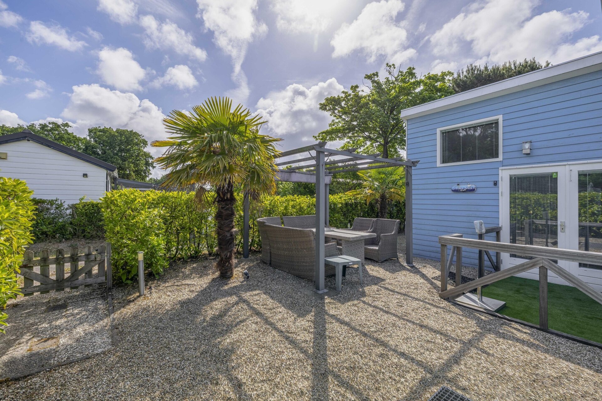 Buiten is het minstens zo fijn als binnen. De tuin is onderhoudsarm aangelegd met grind, beplanting (waaronder palmbomen) en een gezellige zithoek onder een pergola. Perfect om lekker buiten te ontbijten, borrelen of gewoon een boek te lezen. Bij deze fijne vakantiehuis staat een ruime houten berging met stroomvoorziening, extra koel/vriescombinatie en volop opbergruimte voor fietsen, tuinspullen of gereedschap.