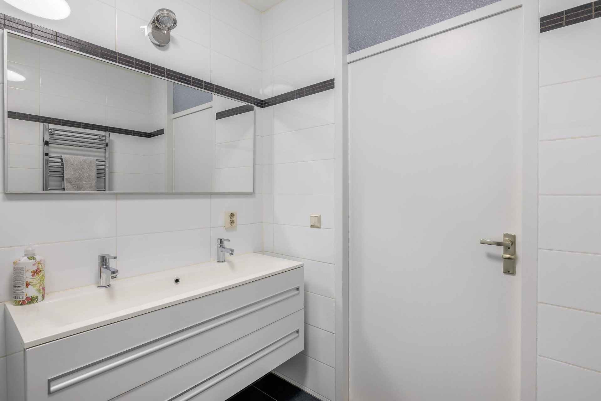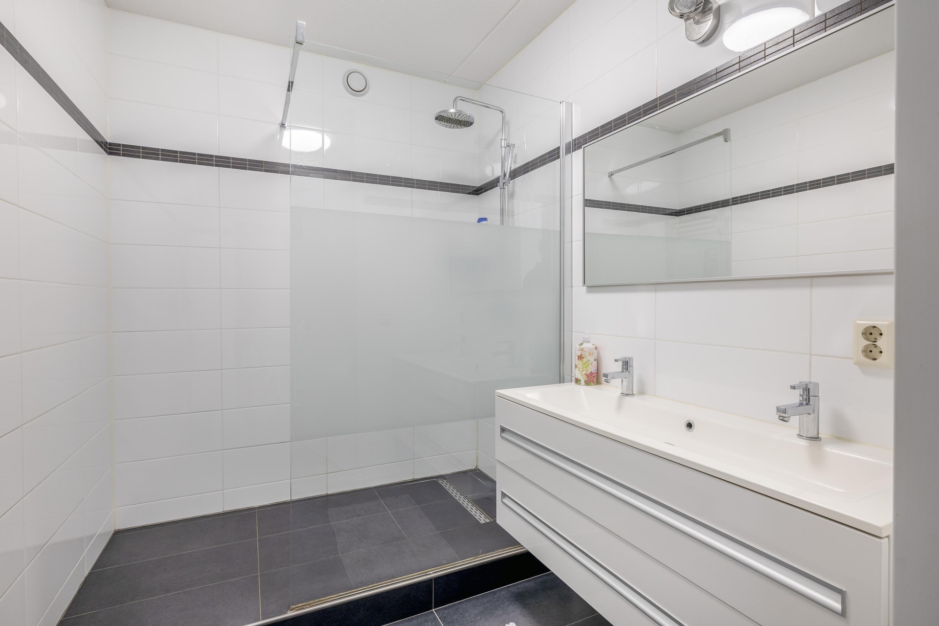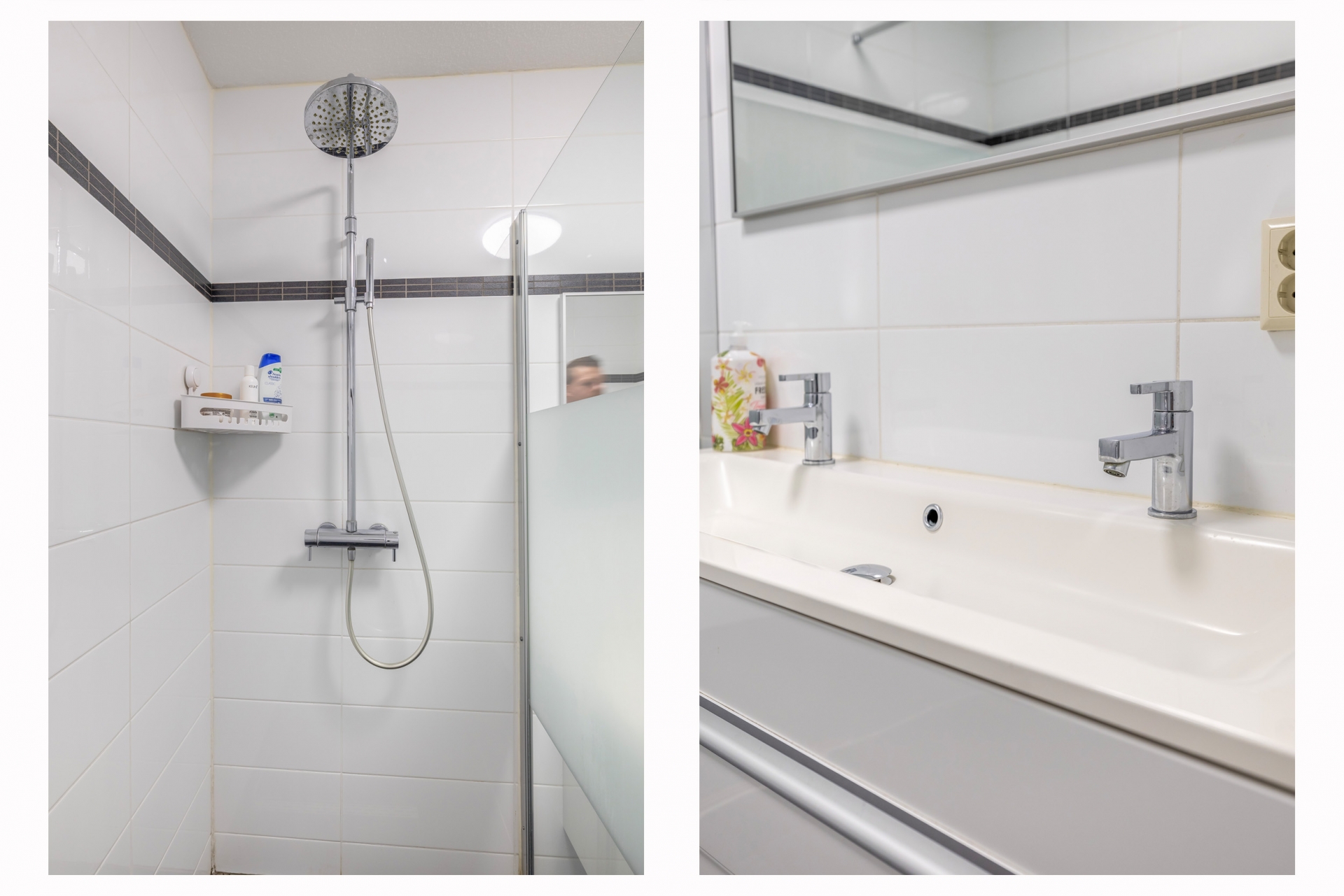 Via de balkondeur in de woonkamer vinden we een keurig betegeld balkon op het noord westen, met uitzicht op het Ambachtsplein. Last but not least is daar nog de badkamer: een strak betegelde ruimte waar zich een dubbel wastafelmeubel en een ruime inloopdouche bevindt.