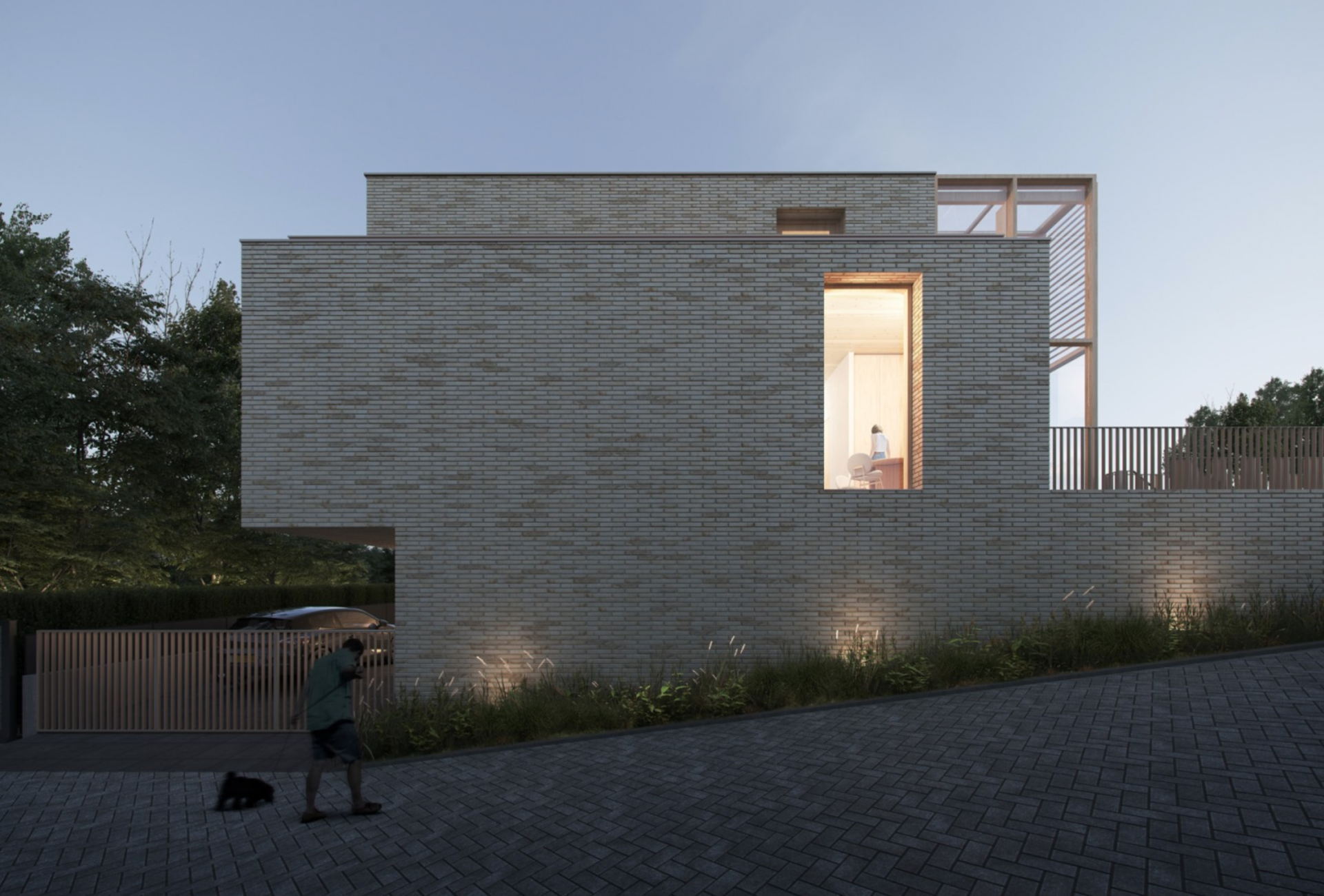 Het vergunde plan voorziet daarnaast in een verdiepte tuin die in verbinding staat met het souterrain. Binnen het plan zijn tevens parkeerplaatsen op eigen terrein en een zwembad voorzien, gesitueerd op het niveau van het souterrain.