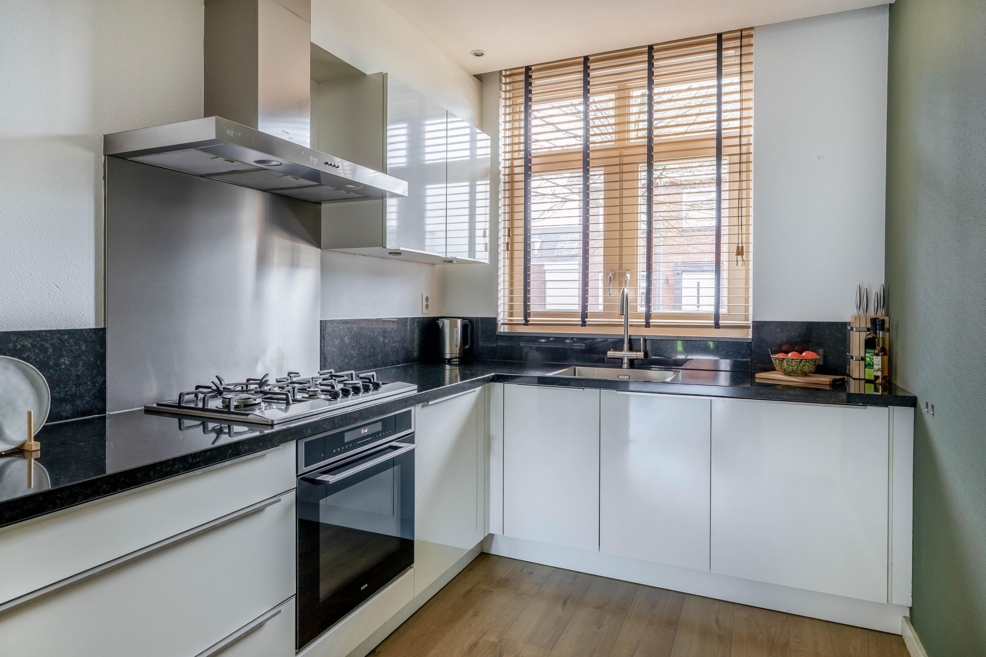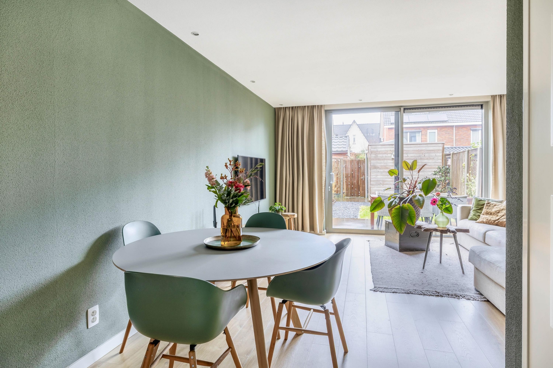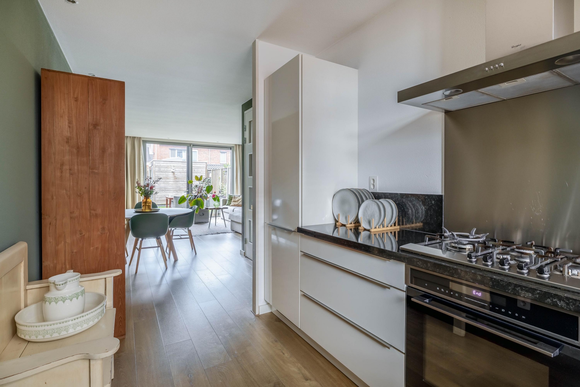 Binnen word je ontvangen in de hal met modern toilet en trapopgang. De keuken ligt aan de voorzijde van het huis. De keuken heeft volop werkruimte en prettig daglicht. De keuken is modern, netjes onderhouden en van alle gemakken voorzien. Aan de achterzijde bevindt zich de tuingerichte woonkamer. Dankzij de brede schuifpui valt het daglicht hier royaal naar binnen en heb je direct contact met buiten. De woonkamer is ruim genoeg voor een comfortabele zithoek én een royale eettafel. Daarnaast zorgen twee airco binnenunits voor extra comfort, zowel in de zomer als in de winter.