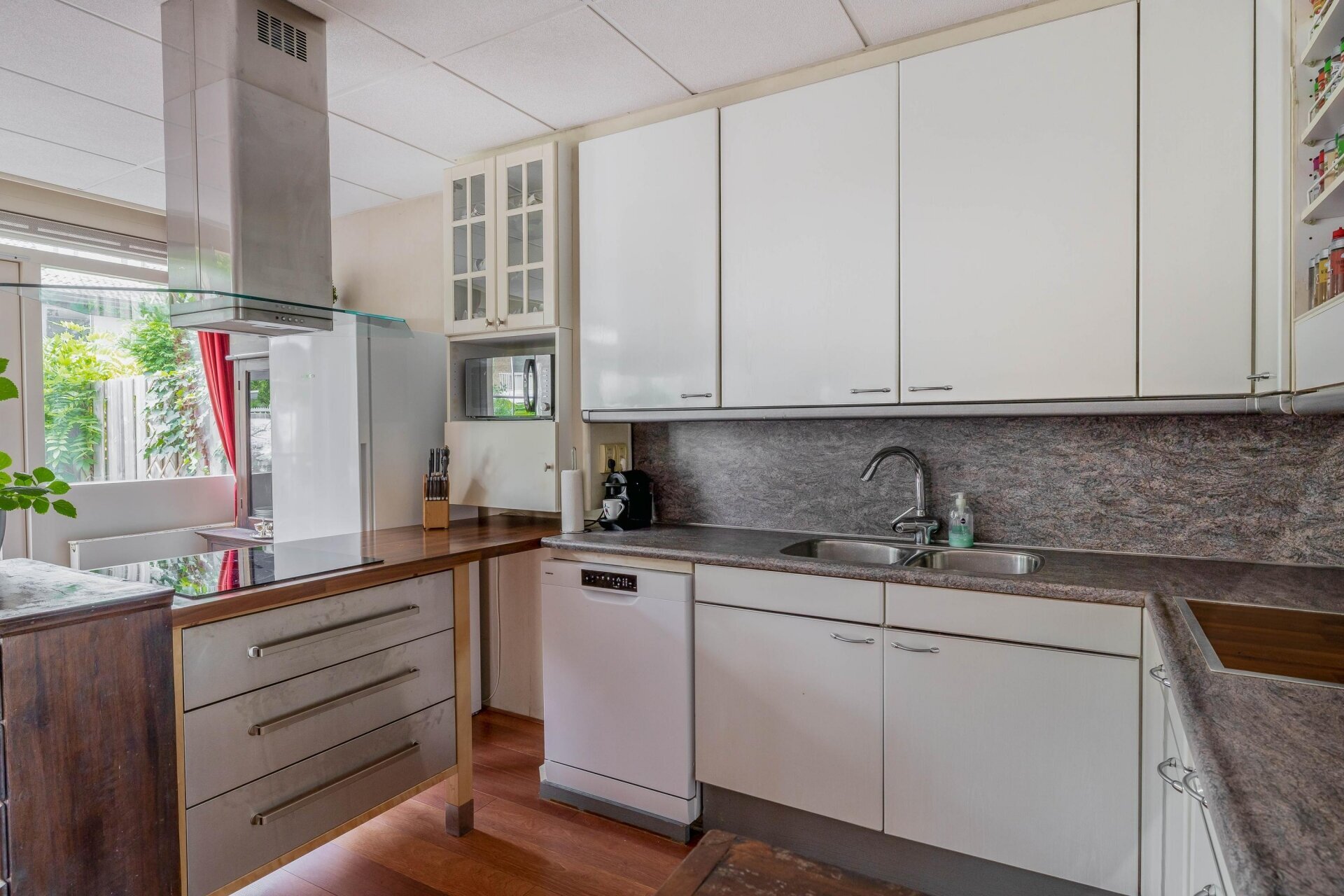 De woonkamer is royaal en licht, met een grote raampartij aan de voorzijde en een mooie Quick-Step laminaatvloer die doorloopt tot in de keuken. De open keuken met baropstelling is voorzien van diverse inbouwapparatuur en biedt voldoende ruimte voor een grote eettafel. Dit is zo’n plek waar je met gemak met de hele familie kunt tafelen of rustig kunt werken met uitzicht op de achtertuin.