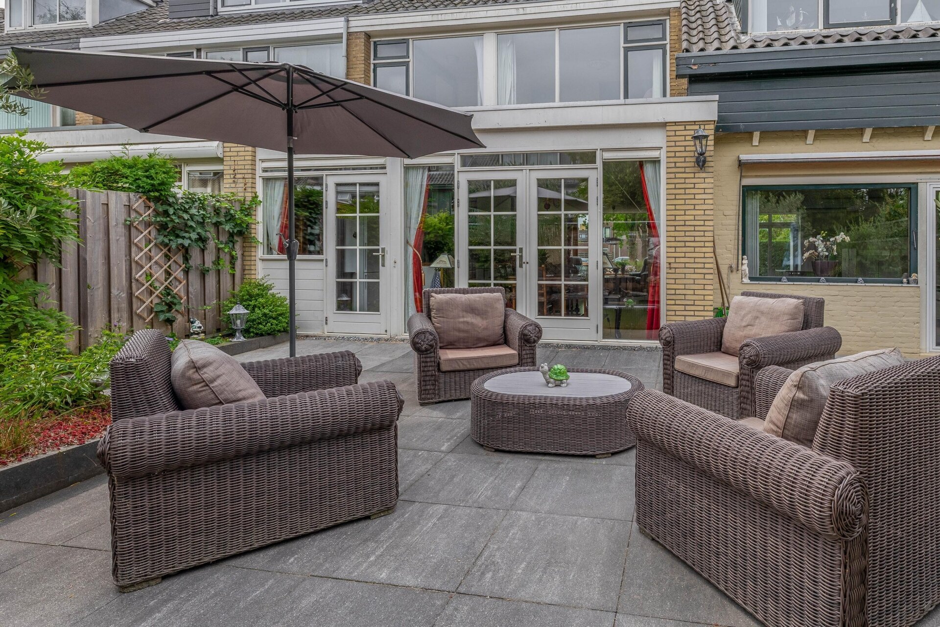 De tuin is een groot pluspunt. Zowel de voor- als achtertuin zijn royaal en verzorgd aangelegd. De achtertuin is gericht op het oosten, waardoor je hier in de ochtend en vroege middag geniet van de zon. Er zijn meerdere zithoeken gecreëerd, ideaal voor een ontbijtje buiten of een gezellige barbecue. De tuin biedt bovendien veel privacy door de volwassen begroeiing rondom. De voortuin is eveneens ruim, met een sfeervolle entree en een oprit waar je met gemak je auto kwijt kunt.