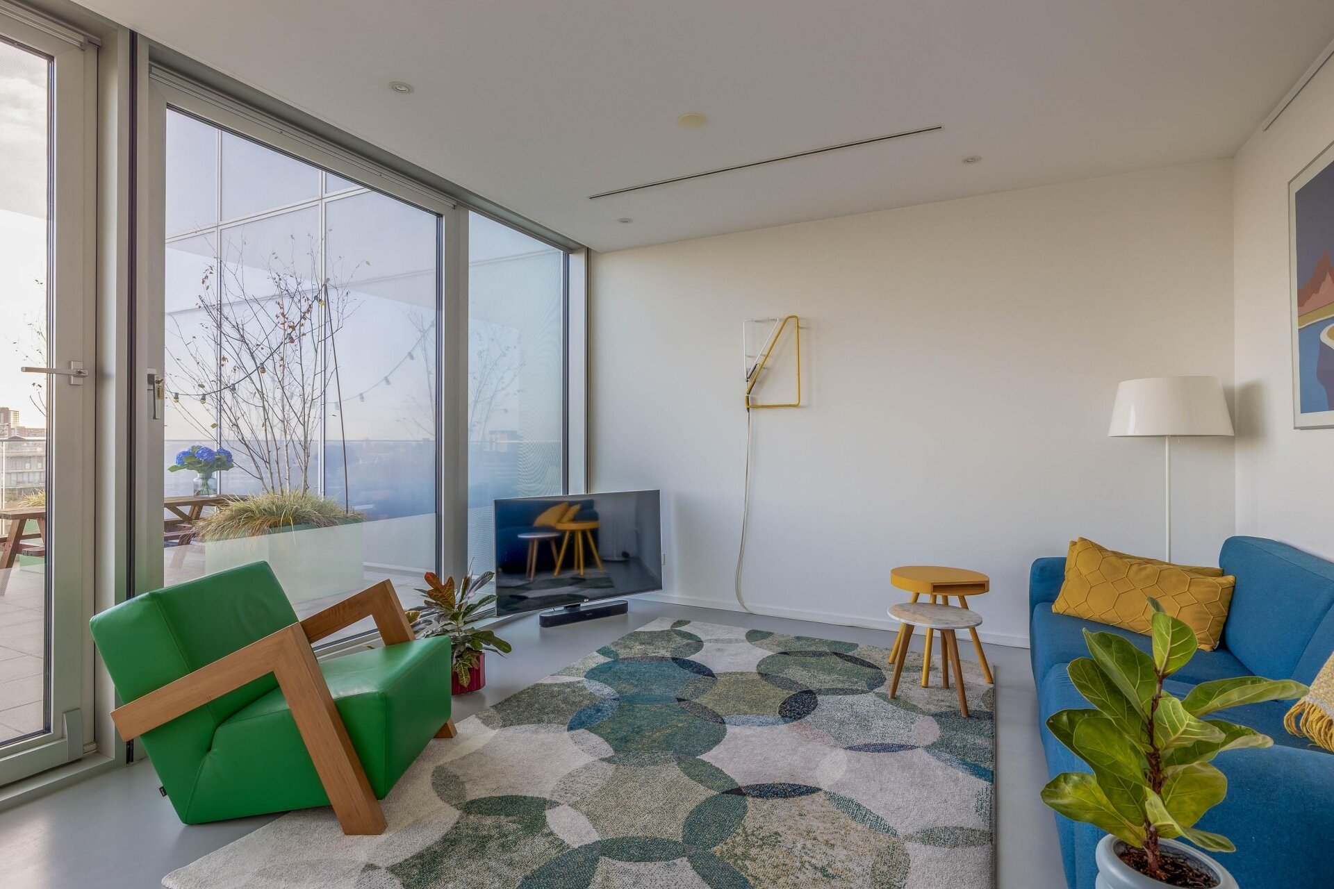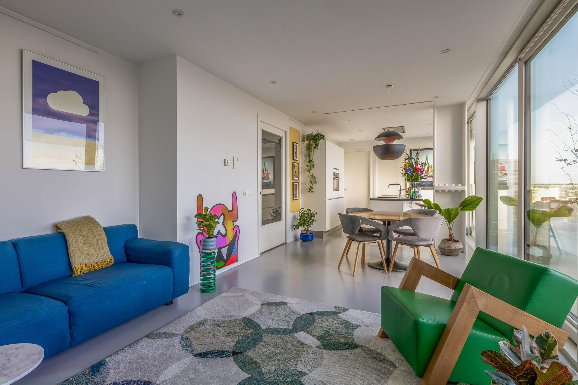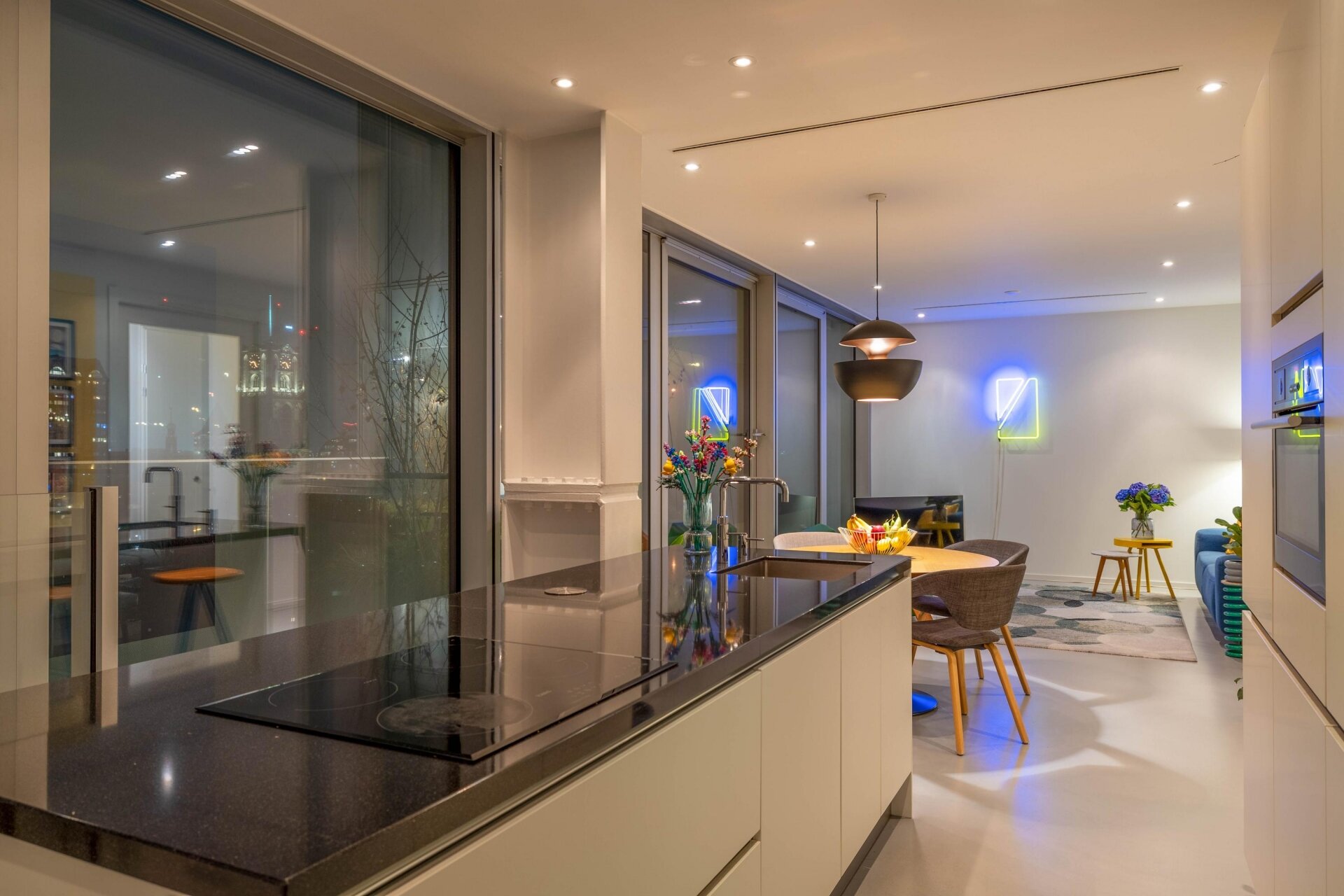 De woonkamer voelt ruimtelijk aan en is sfeervol ingericht. Dankzij de grote glaspartijen, komt er voldoende en prettig natuurlijk licht binnen. De naadloze gietvloer, tijdloze kleurstelling en modern verlichtingsplan versterken het minimalistische en luxe gevoel van het appartement.
