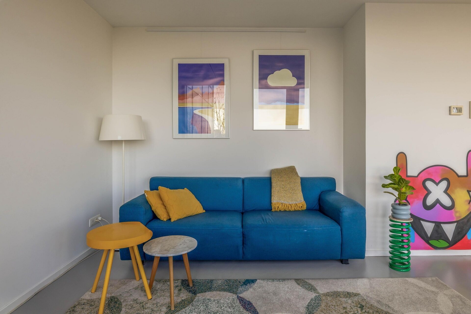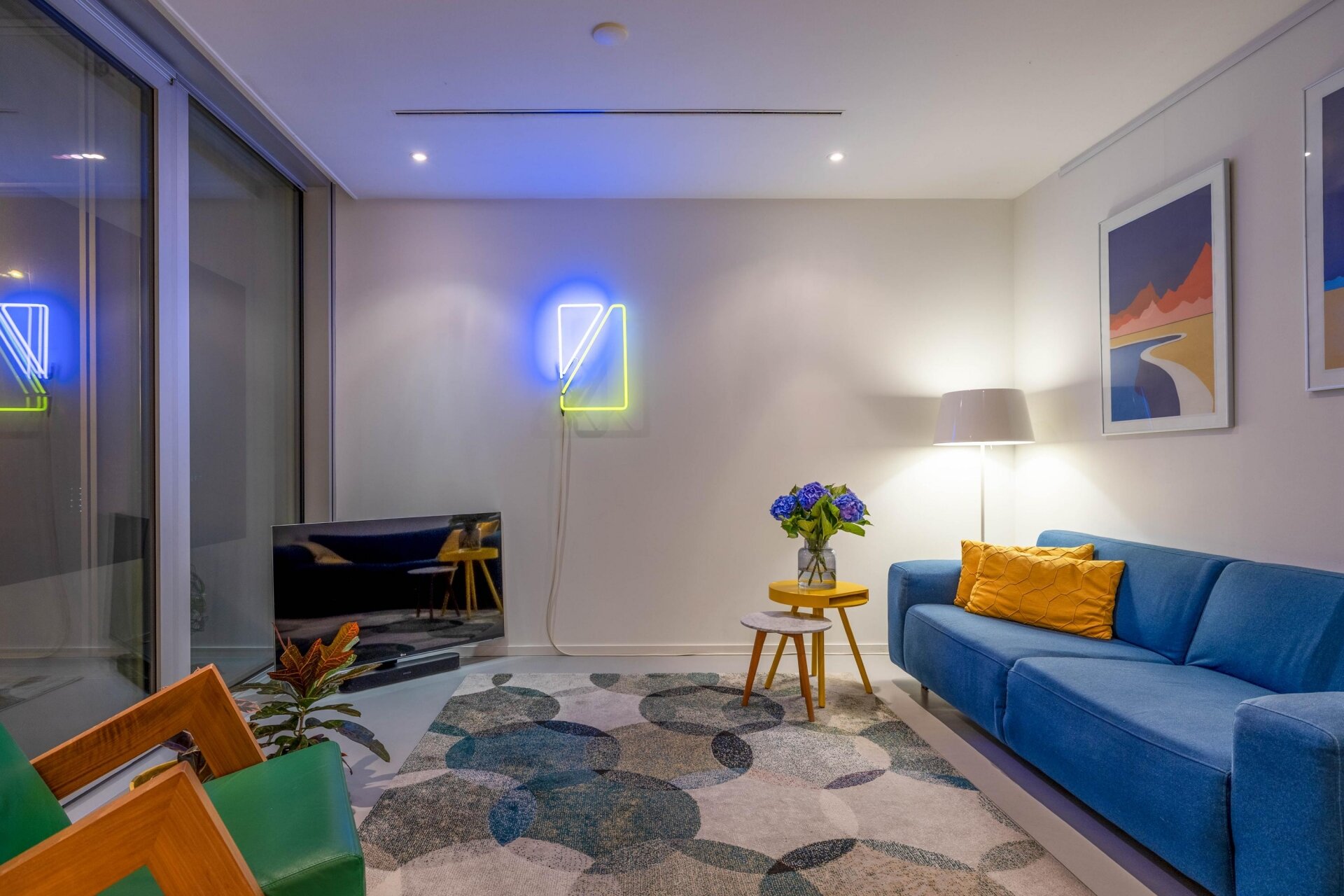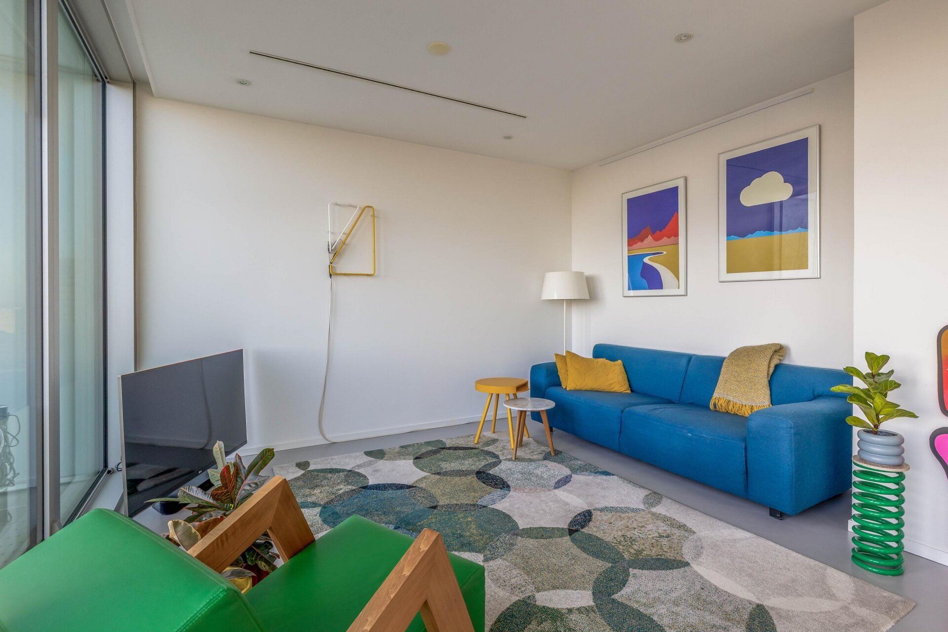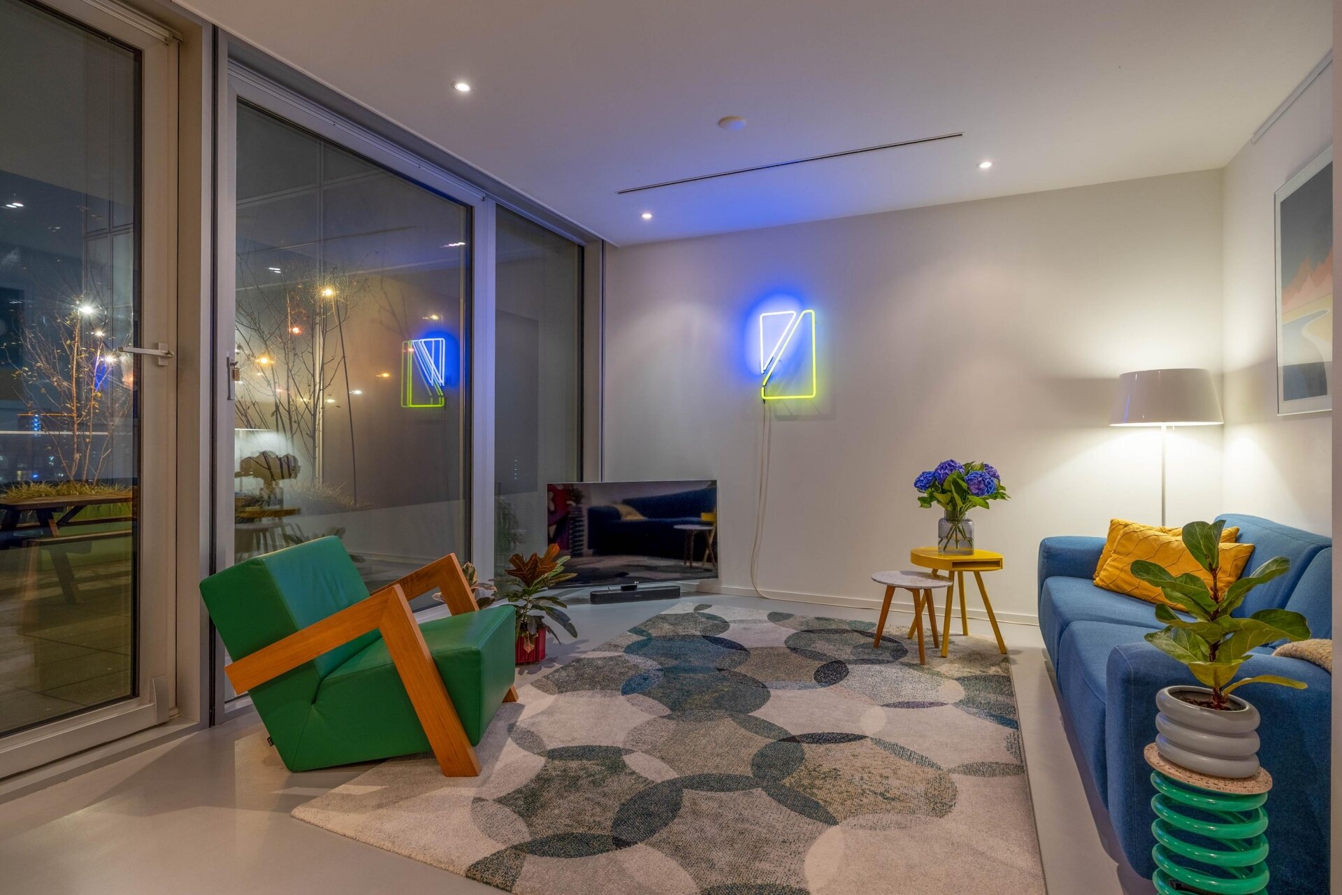 De woonkamer voelt ruimtelijk aan en is sfeervol ingericht. Dankzij de grote glaspartijen, komt er voldoende en prettig natuurlijk licht binnen. De naadloze gietvloer, tijdloze kleurstelling en modern verlichtingsplan versterken het minimalistische en luxe gevoel van het appartement.