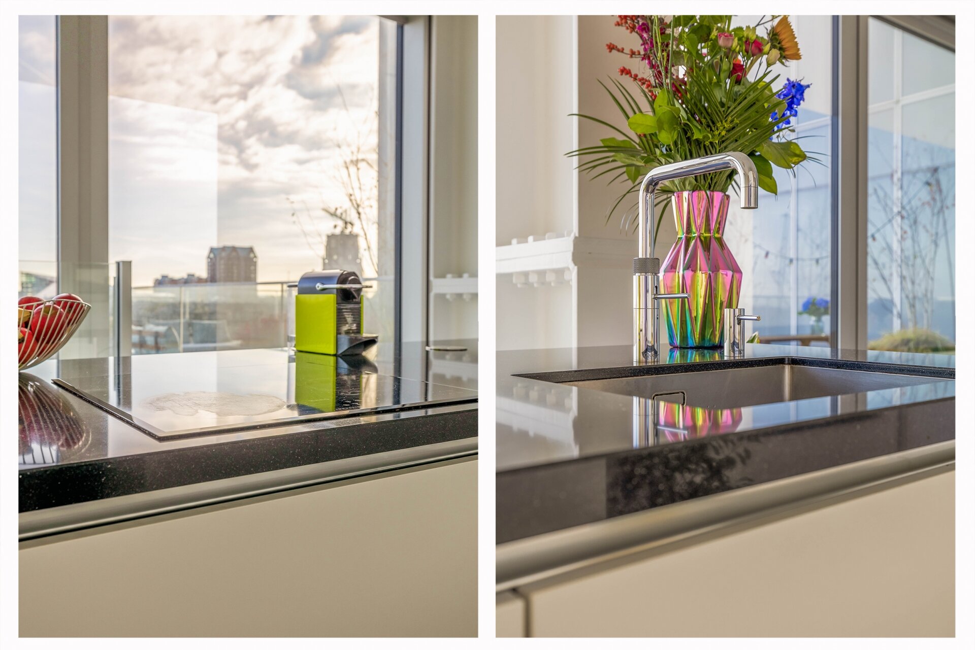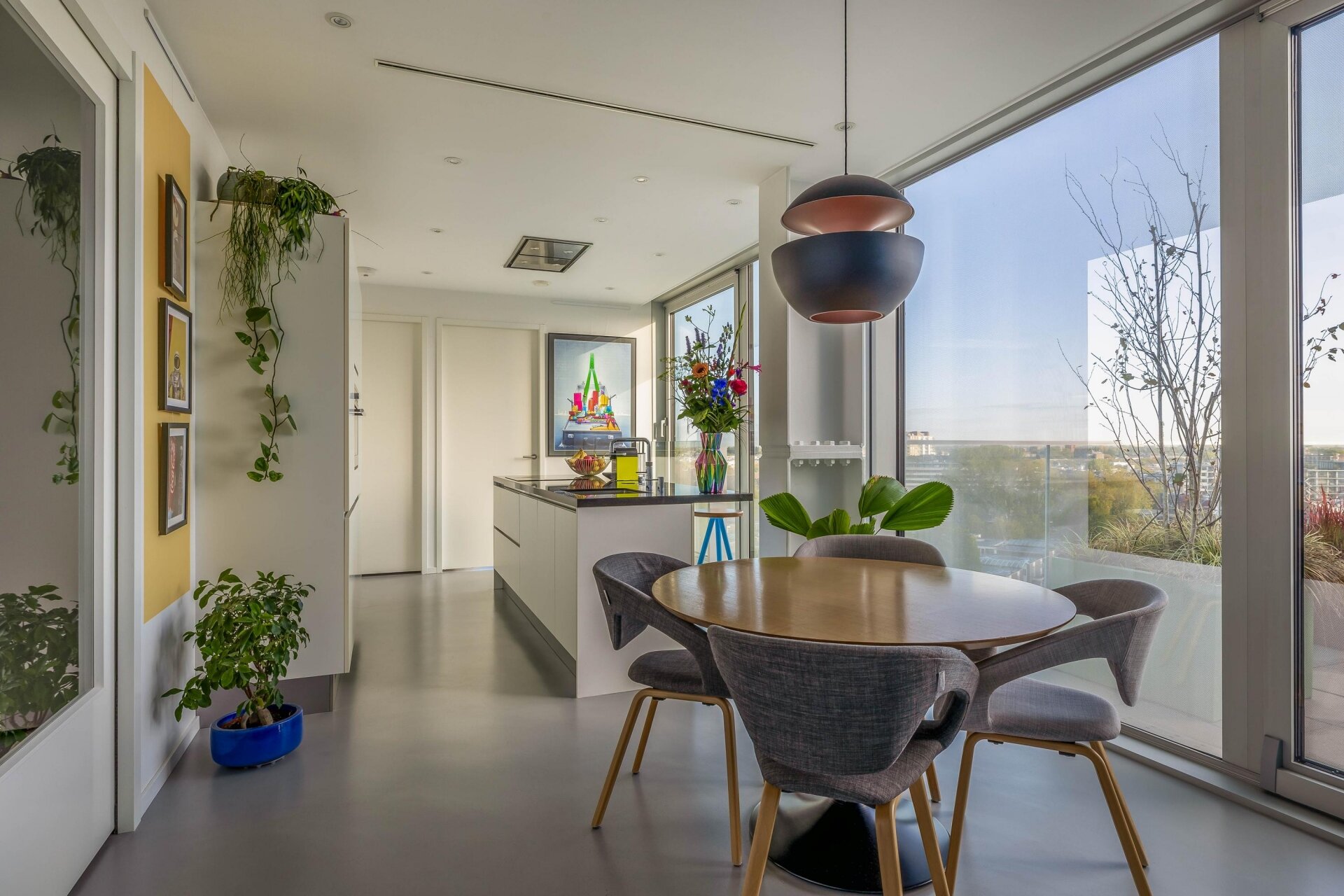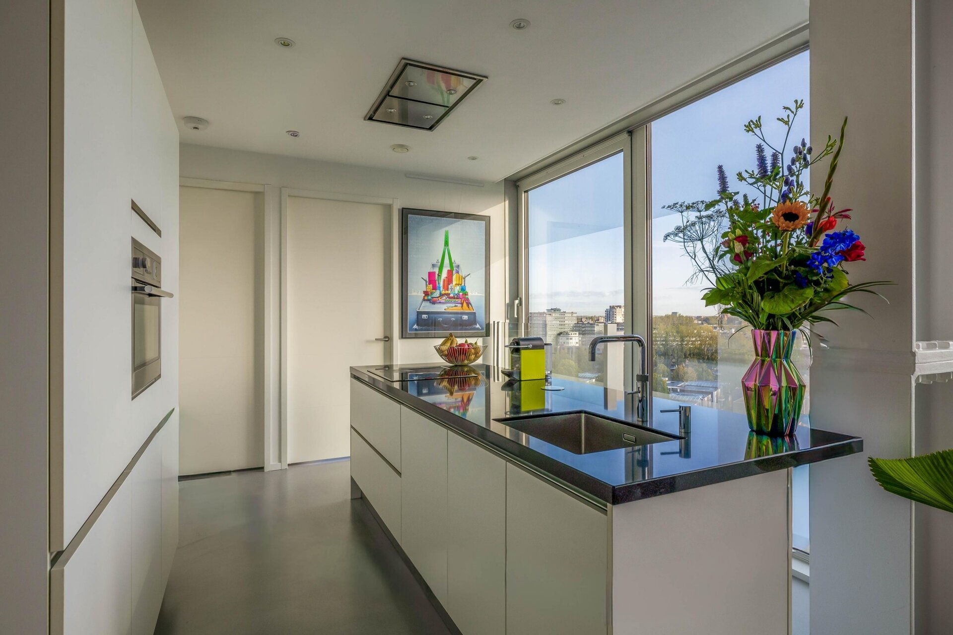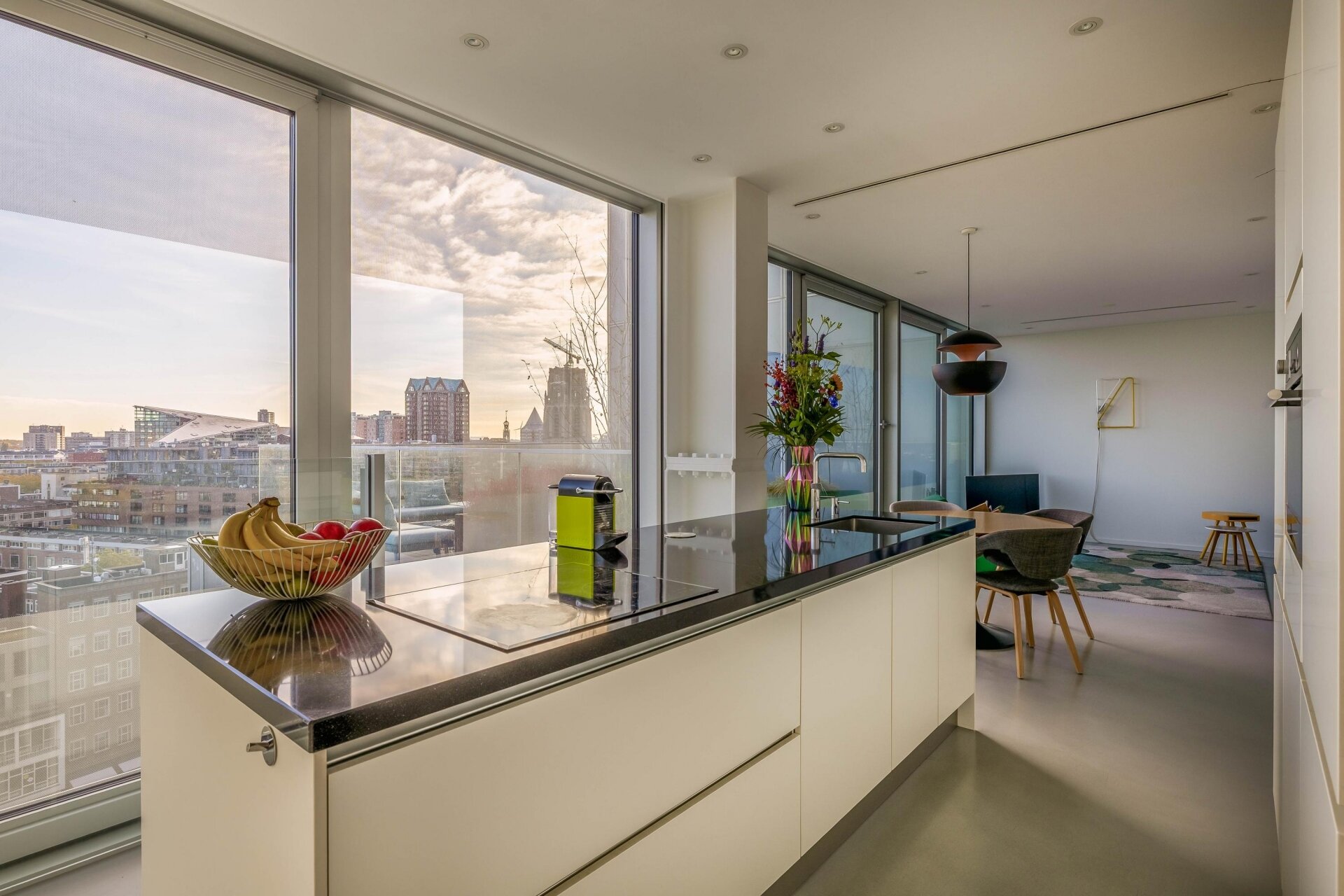 De keuken is strak, modern en perfect geplaatst in de open leefruimte. Koken doe je hier met uitzicht over de stad, wat elke maaltijd net dat beetje extra geeft. De combinatie van het kookeiland, veel opbergruimte en een hoog afwerkingsniveau maakt het een fijne plek voor zowel de dagelijkse maaltijd als een avond met gasten. De keuken is uitgerust met Quooker, inductie kookplaat, vaatwasser, combi-oven, koel-vriescombinatie en een in het plafond ingebouwde afzuigkap.