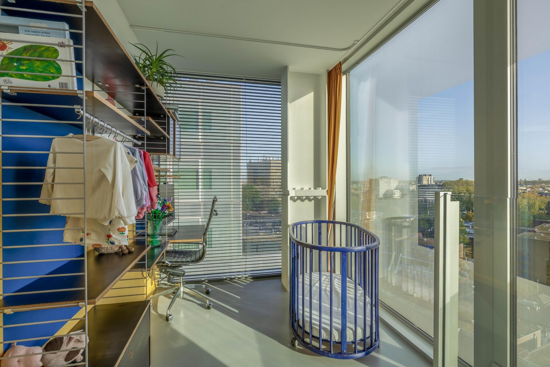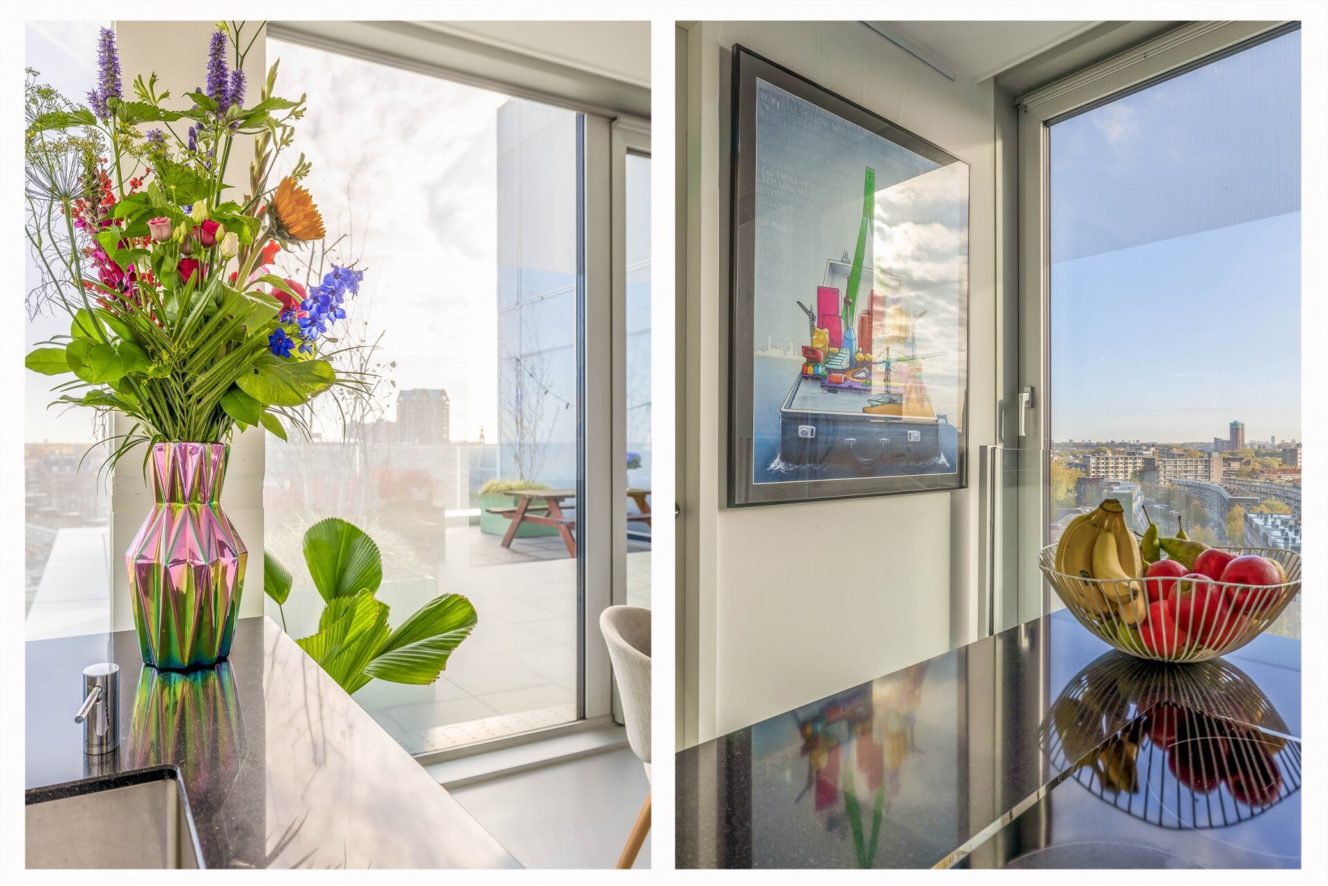 Zodra je de woonkamer binnenkomt, valt je oog direct op het enorme terras. De plafondhoge ramen zorgen voor een naadloze overgang tussen binnen en buiten en laten een zee aan daglicht binnenstromen. De plafondhoge schuifpuien kunnen in de woonkamer, keuken en kleine slaapkamer volledig worden geopend, zodat je in de zomer het buiten naar binnen kan halen waardoor veel extra leefruimte ontstaat! Het terras biedt volop ruimte om te loungen, eten, tuinieren of simpelweg te genieten van het panoramische uitzicht over de skyline van Rotterdam. Dankzij de ligging op het oosten zit je hier perfect voor de ochtendzon en een kop koffie in alle rust – midden in de stad.