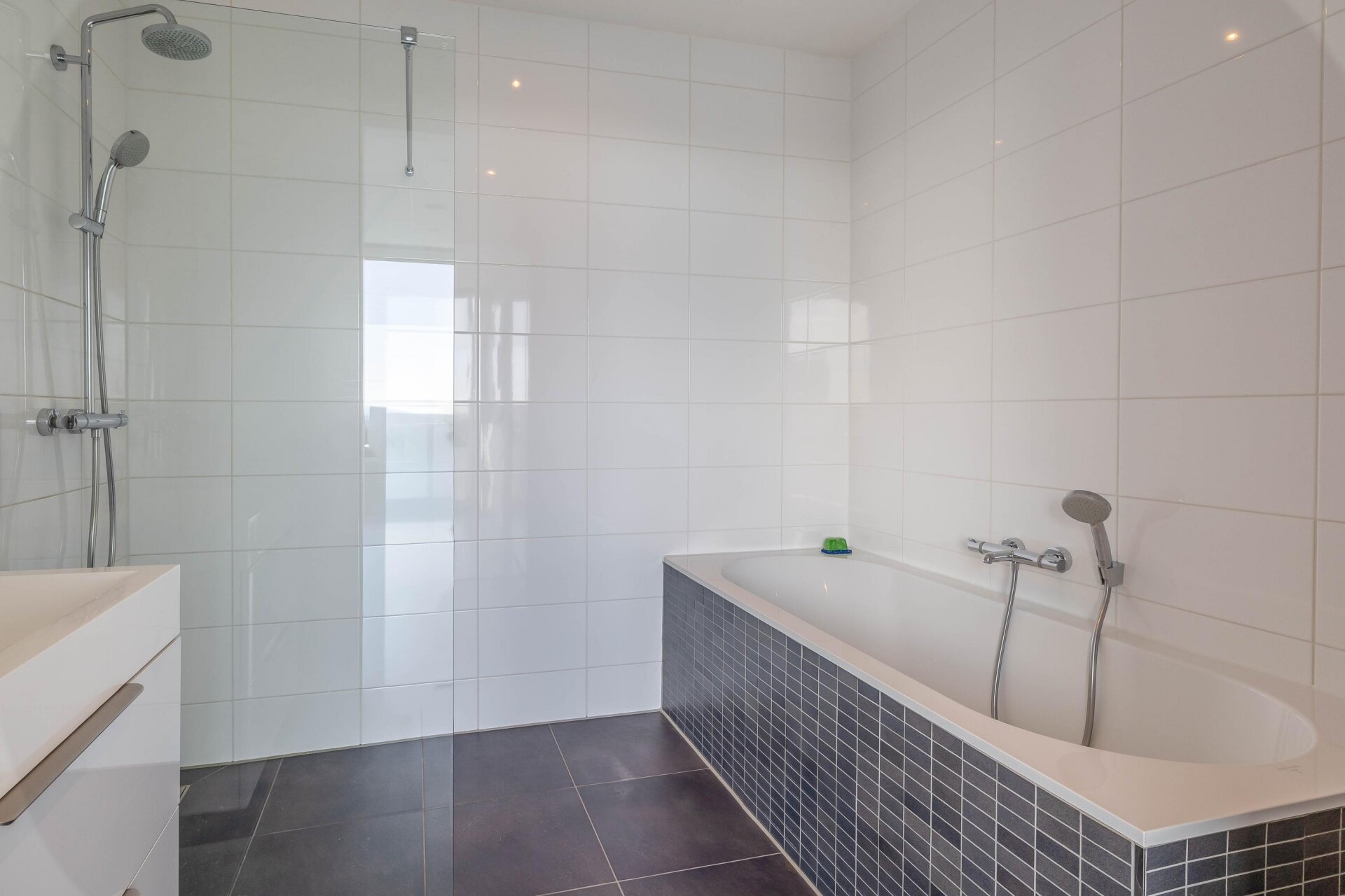 Het sanitair bestaat uit een royale, volledig betegelde badkamer, voorzien van inloopdouche met glazen scherm, wastafelmeubel en ligbad. Het separate toilet bevindt zich bij de entree van het appartement.