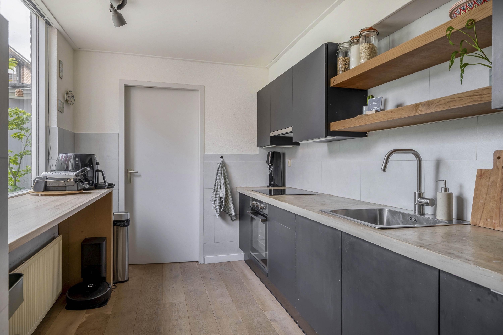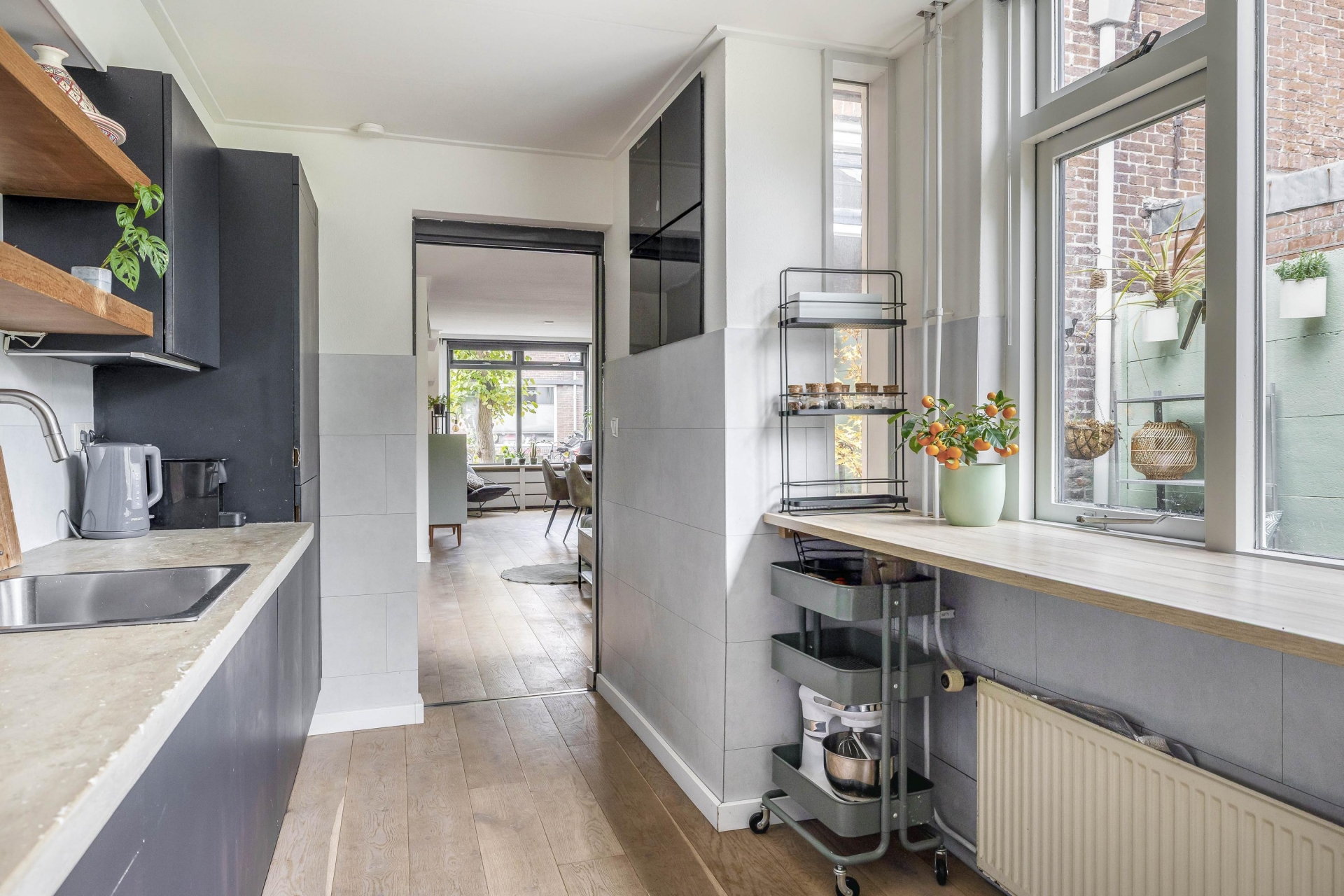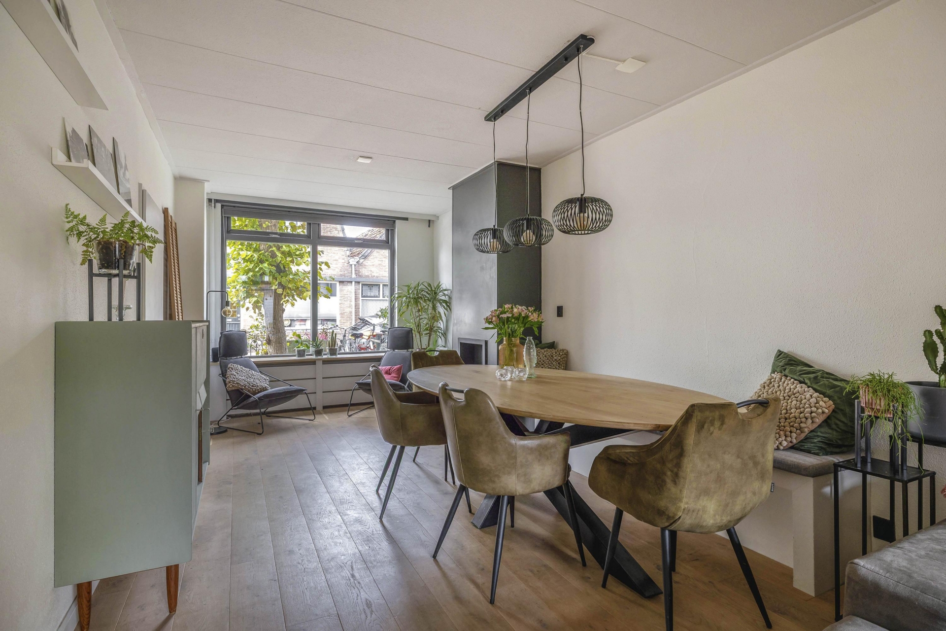 Binnen stap je in een lichte, open leefruimte met een prettige sfeer. De eetkamer aan de voorzijde is gezellig ingericht met een fijne eethoek en behoudt zijn authentieke karakter dankzij de houten vloer en hoge plafonds. Richting de achterzijde van het huis loop je door naar de zitkamer en open keuken. De keuken is in 2019 voorzien van nieuwe fronten en een nieuw blad, en uitgerust met moderne inbouwapparatuur (2020), waaronder een combi-oven, vaatwasser en inductiekookplaat.