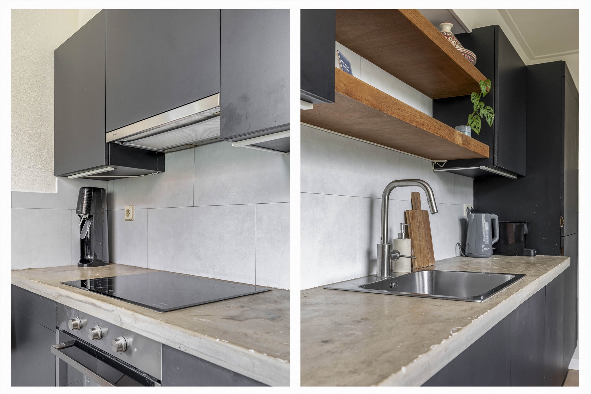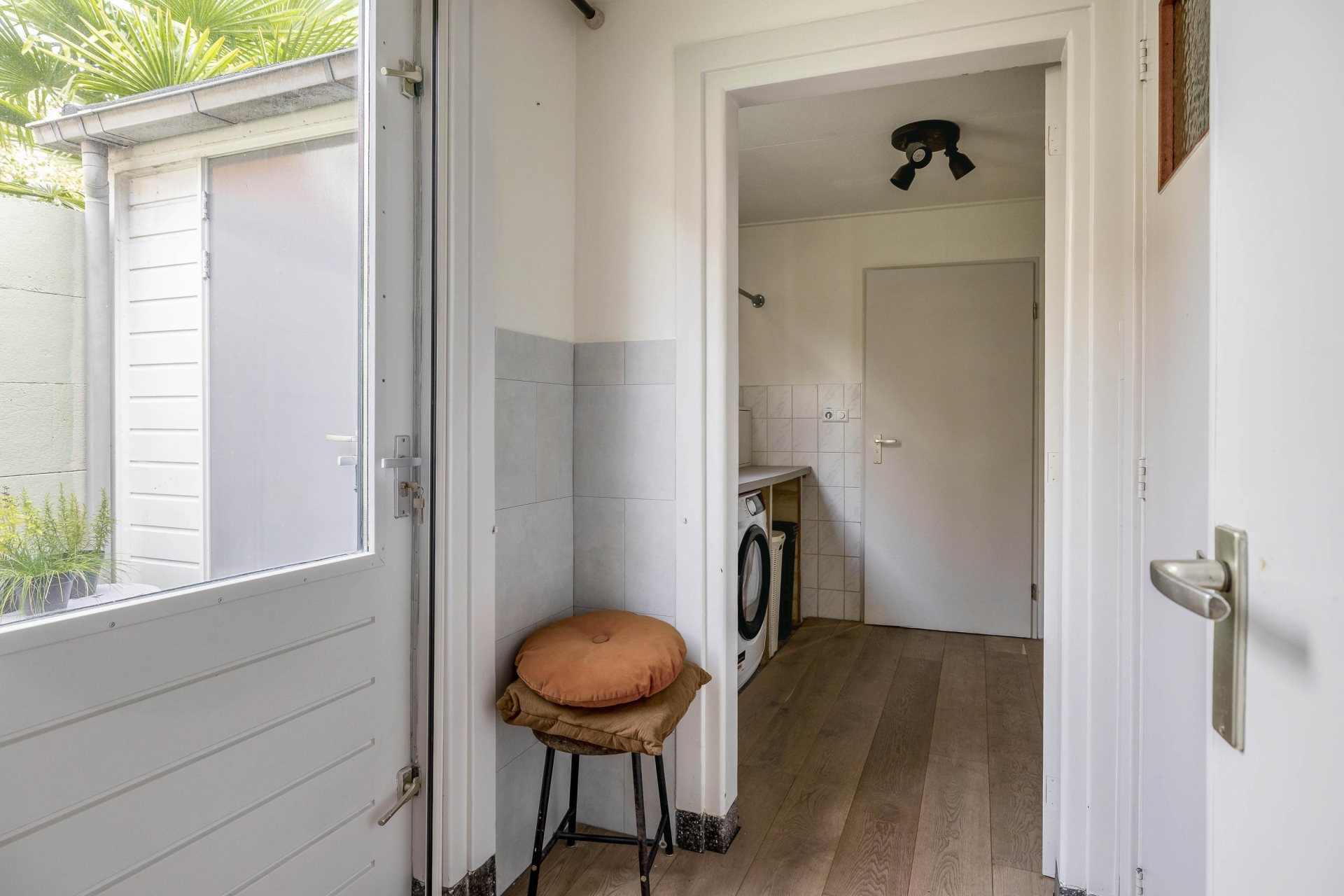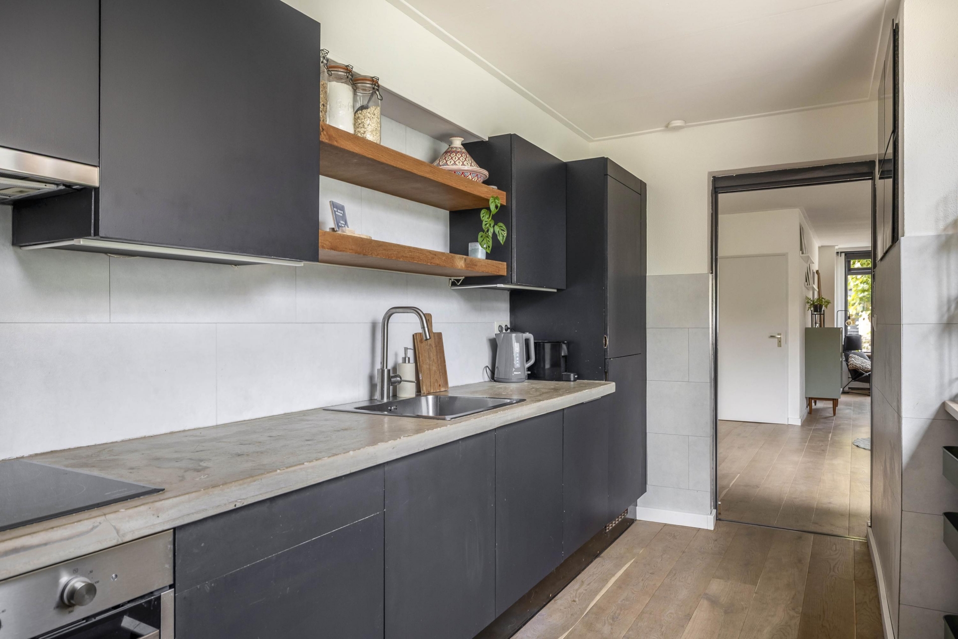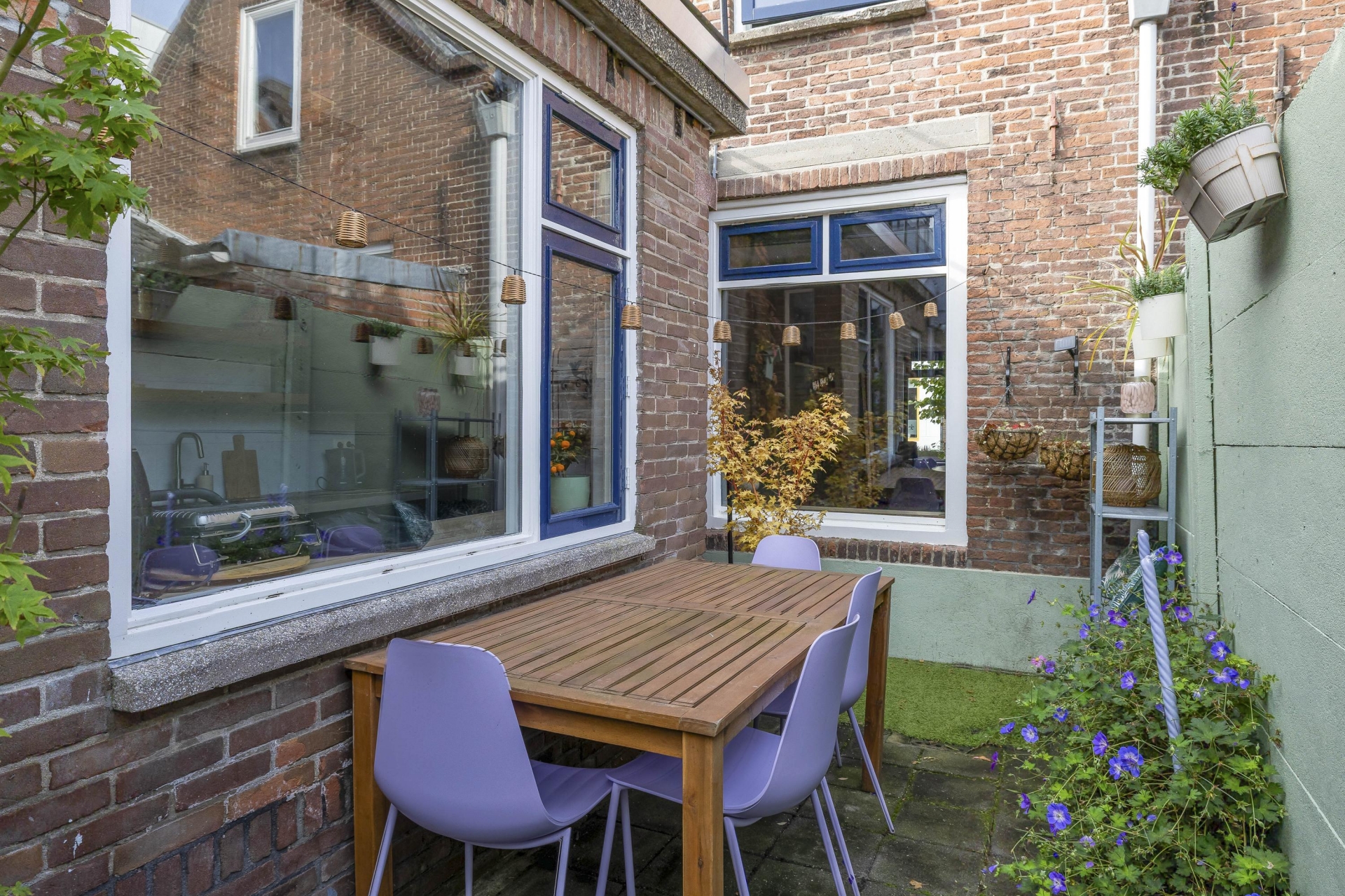 Binnen stap je in een lichte, open leefruimte met een prettige sfeer. De eetkamer aan de voorzijde is gezellig ingericht met een fijne eethoek en behoudt zijn authentieke karakter dankzij de houten vloer en hoge plafonds. Richting de achterzijde van het huis loop je door naar de zitkamer en open keuken. De keuken is in 2019 voorzien van nieuwe fronten en een nieuw blad, en uitgerust met moderne inbouwapparatuur (2020), waaronder een combi-oven, vaatwasser en inductiekookplaat.