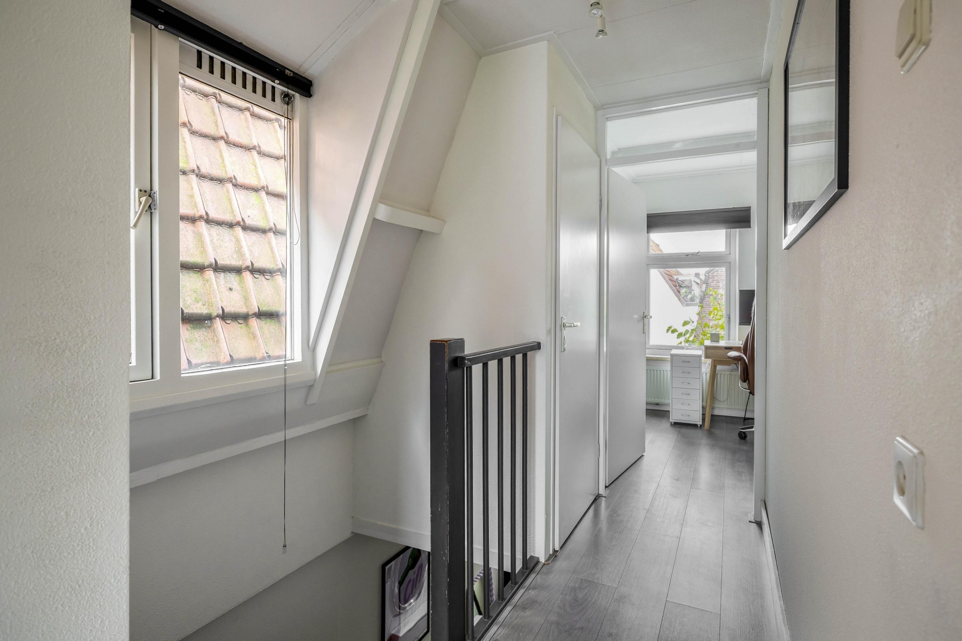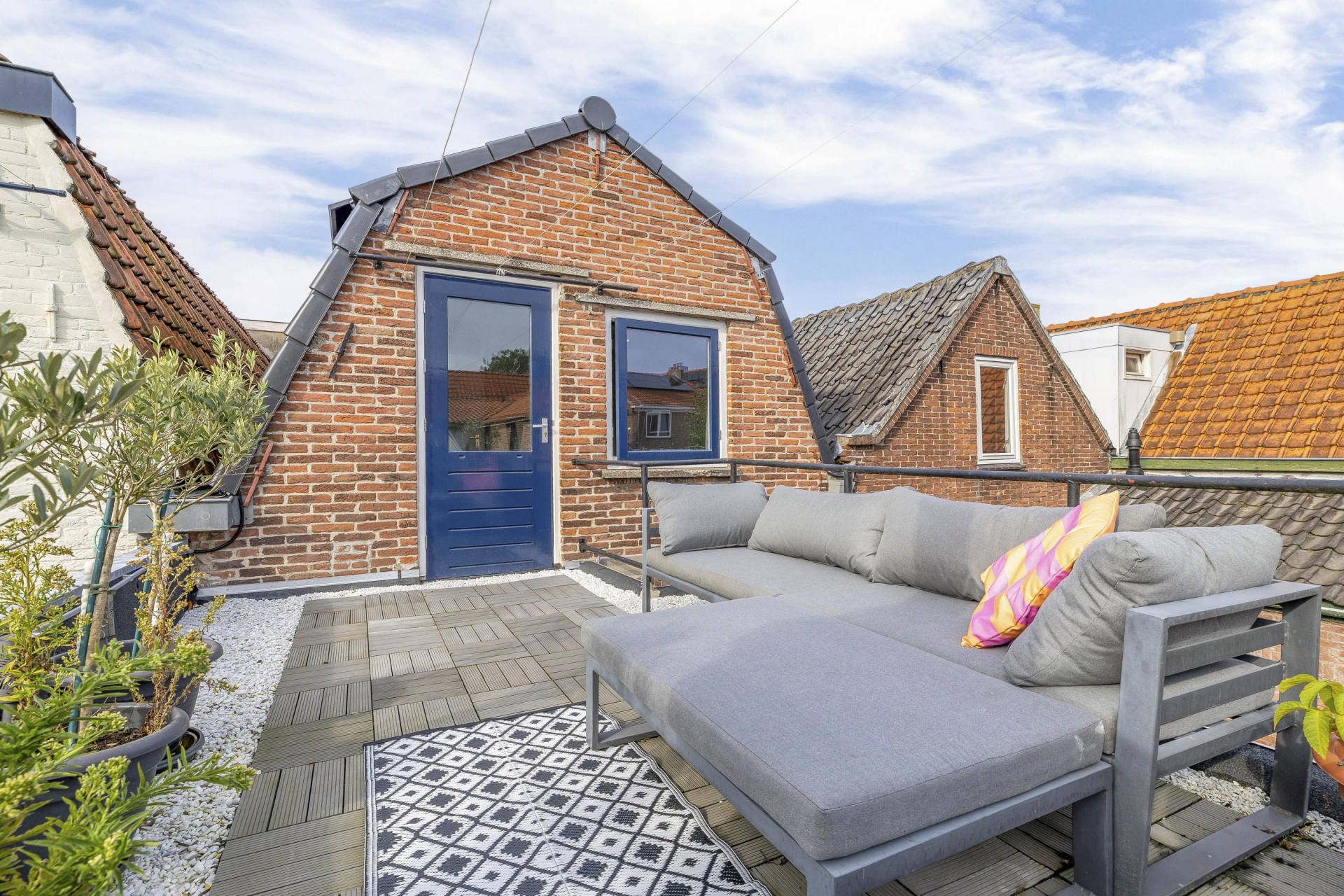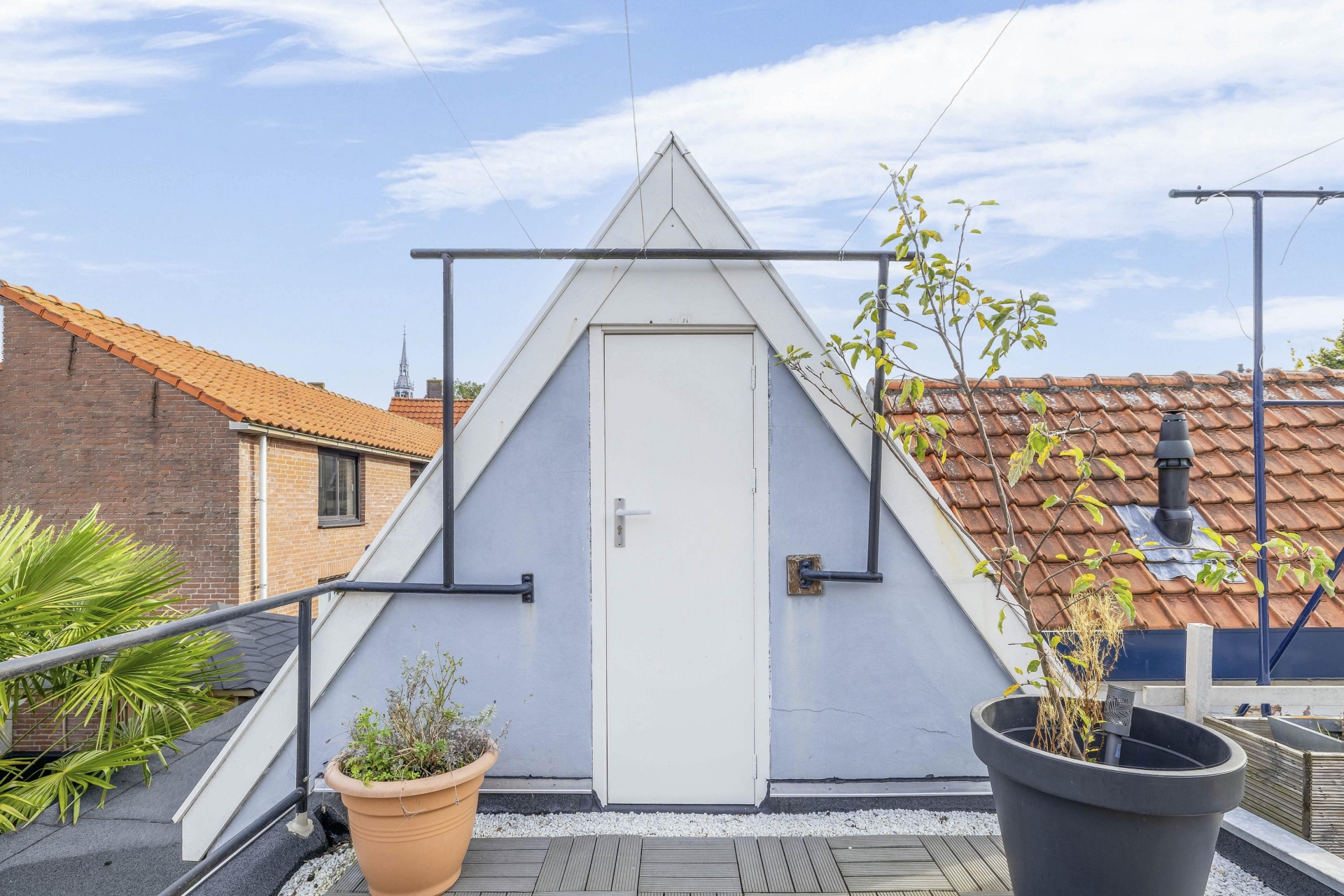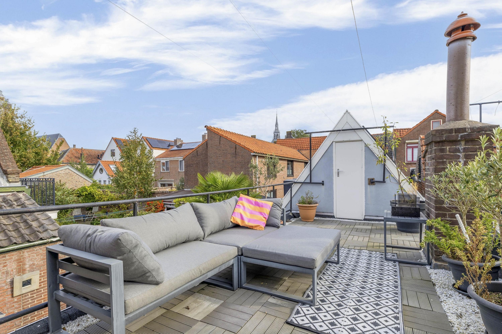 Het dakterras aan de achterzijde is een oase van rust, midden in de stad. Dankzij de ligging op het oosten geniet je hier 's ochtends en aan het begin van de middag van de zon. Het terras is voorzien van houten vlonders en biedt voldoende ruimte voor een gezellige lounge- of eethoek. Een heerlijke plek voor een kop koffie in de zon, een goed boek of een avondborrel met vrienden. Via het dakterras bereik je nog een praktische bergruimte voor opslag.