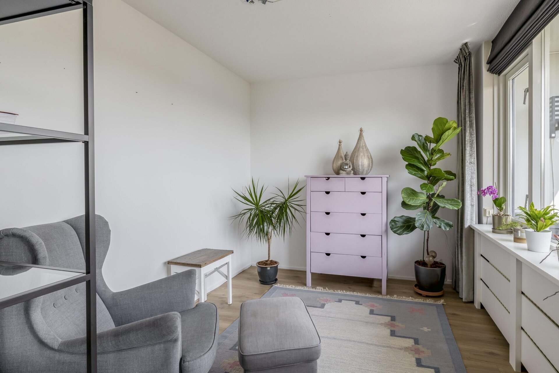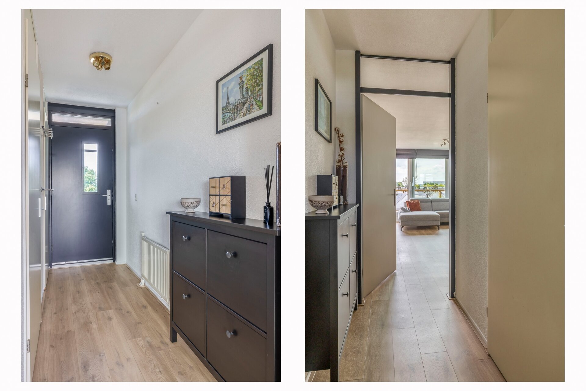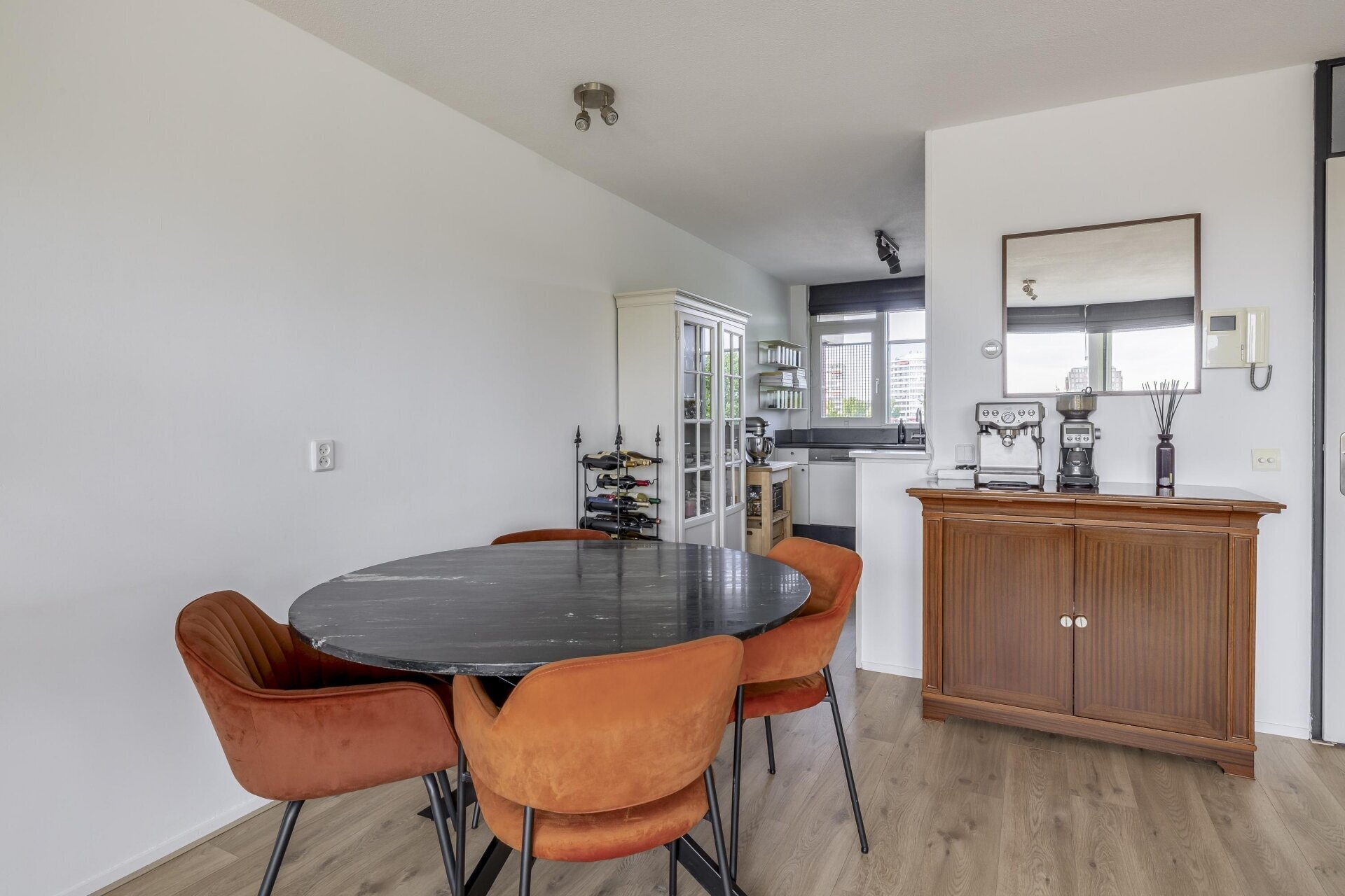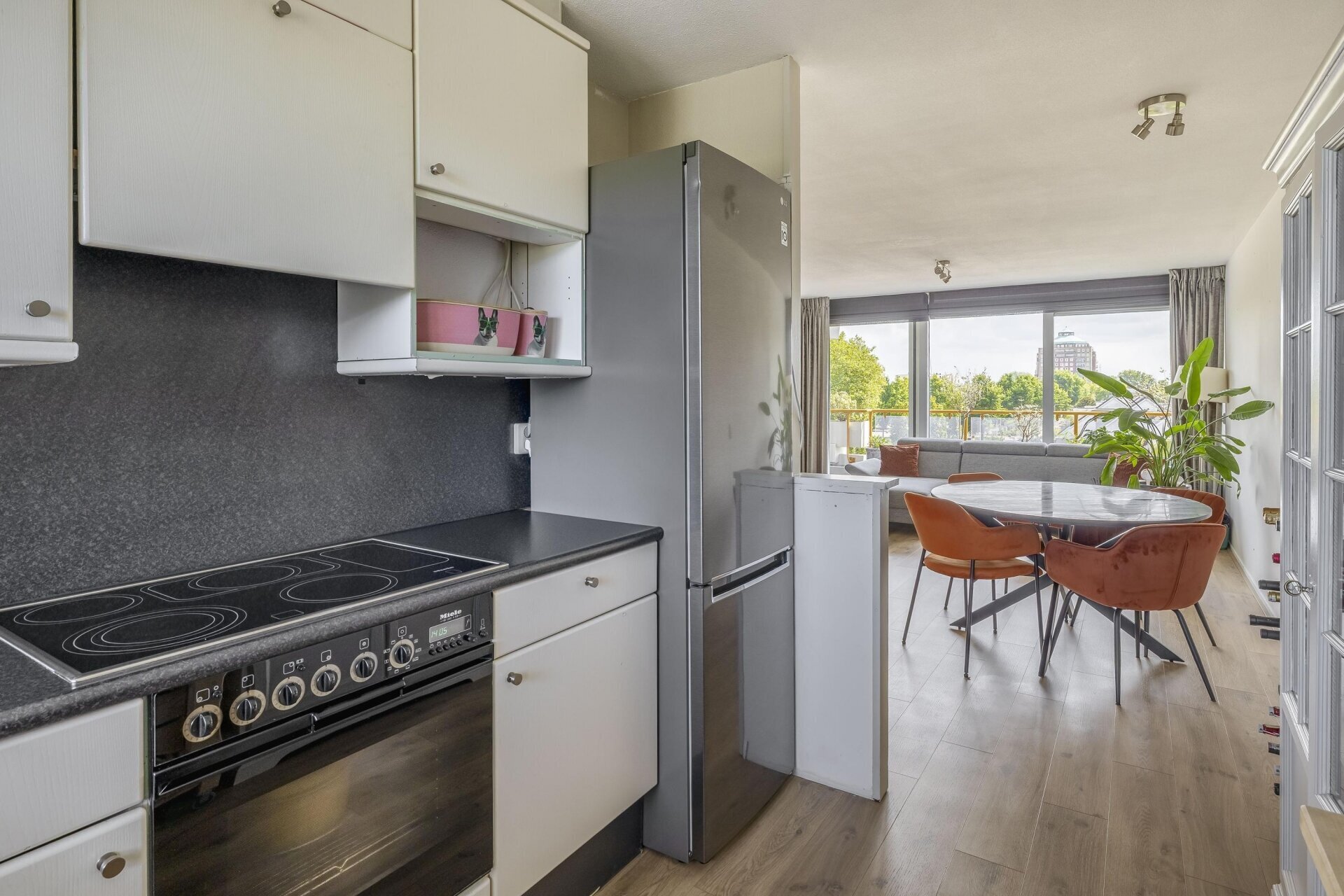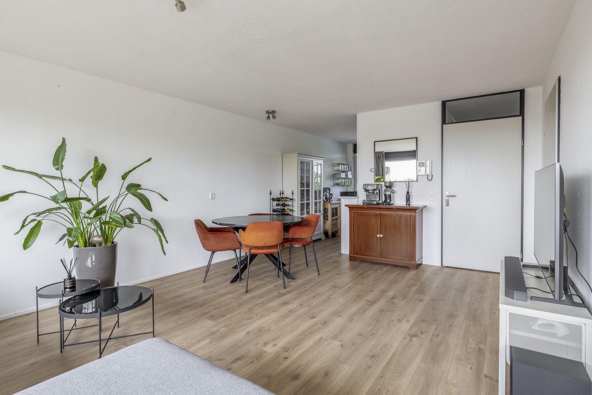 De woonkamer is een fijne plek waar licht en ruimte samenkomen. De nieuwe schuifpui zorgt niet alleen voor veel daglicht, maar biedt ook direct toegang tot het royale terras. Op de vloer ligt een stijlvolle pvc-vloer die zorgt voor een rustige en moderne uitstraling. Grenzend aan de woonkamer bevindt zich de eetkamer, die via een loopdeur ook direct toegang geeft tot het terras. Perfect voor gezellige etentjes of om op zomerse dagen makkelijk buiten te kunnen eten.