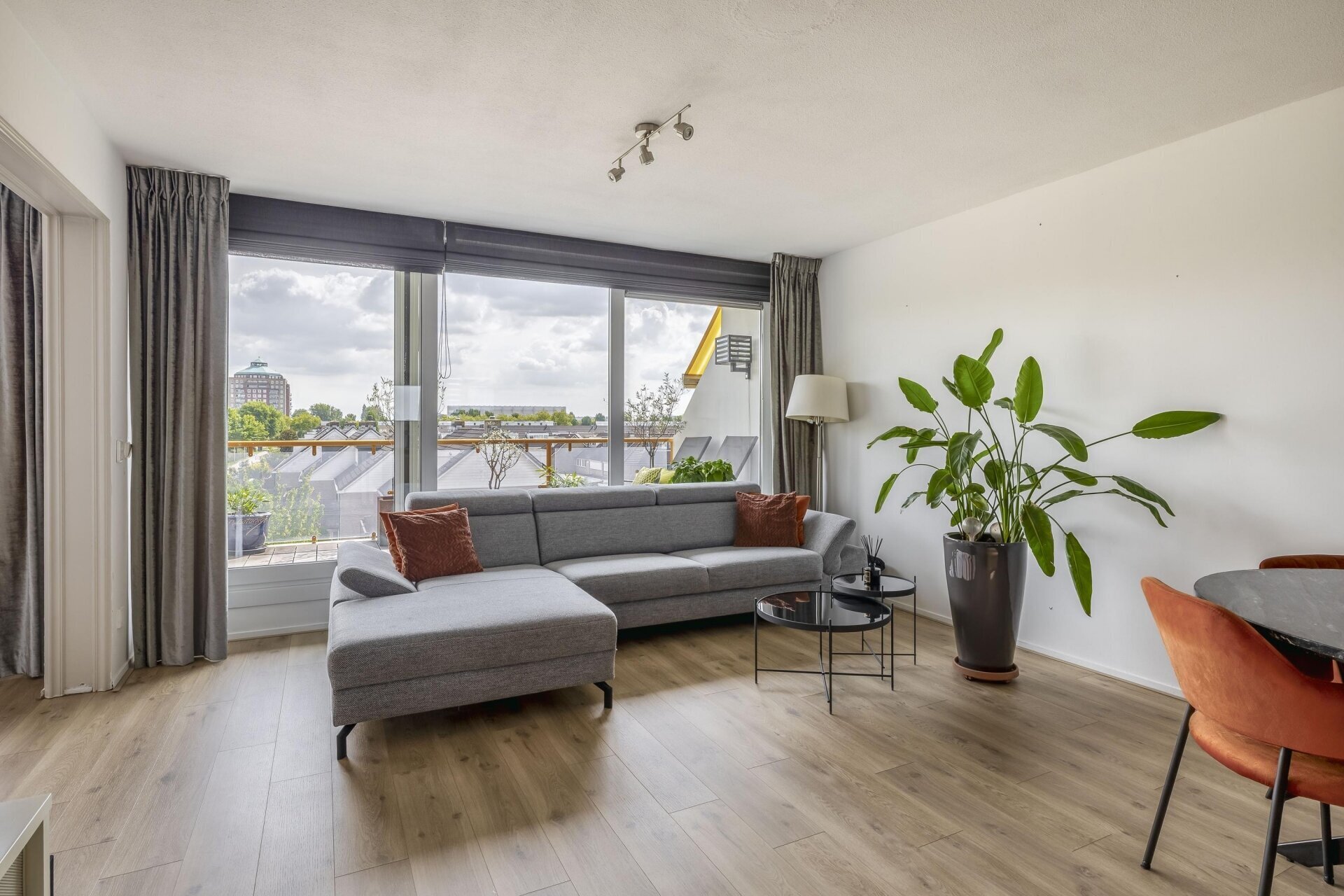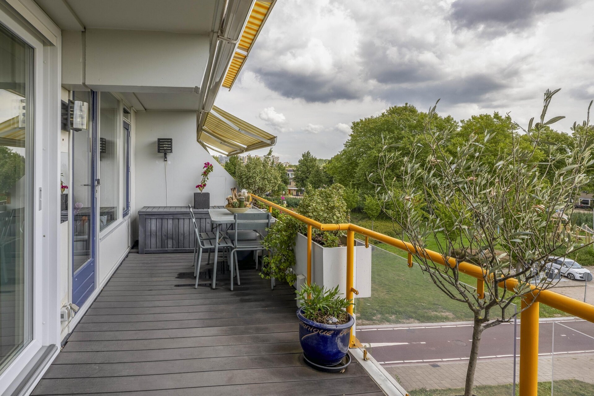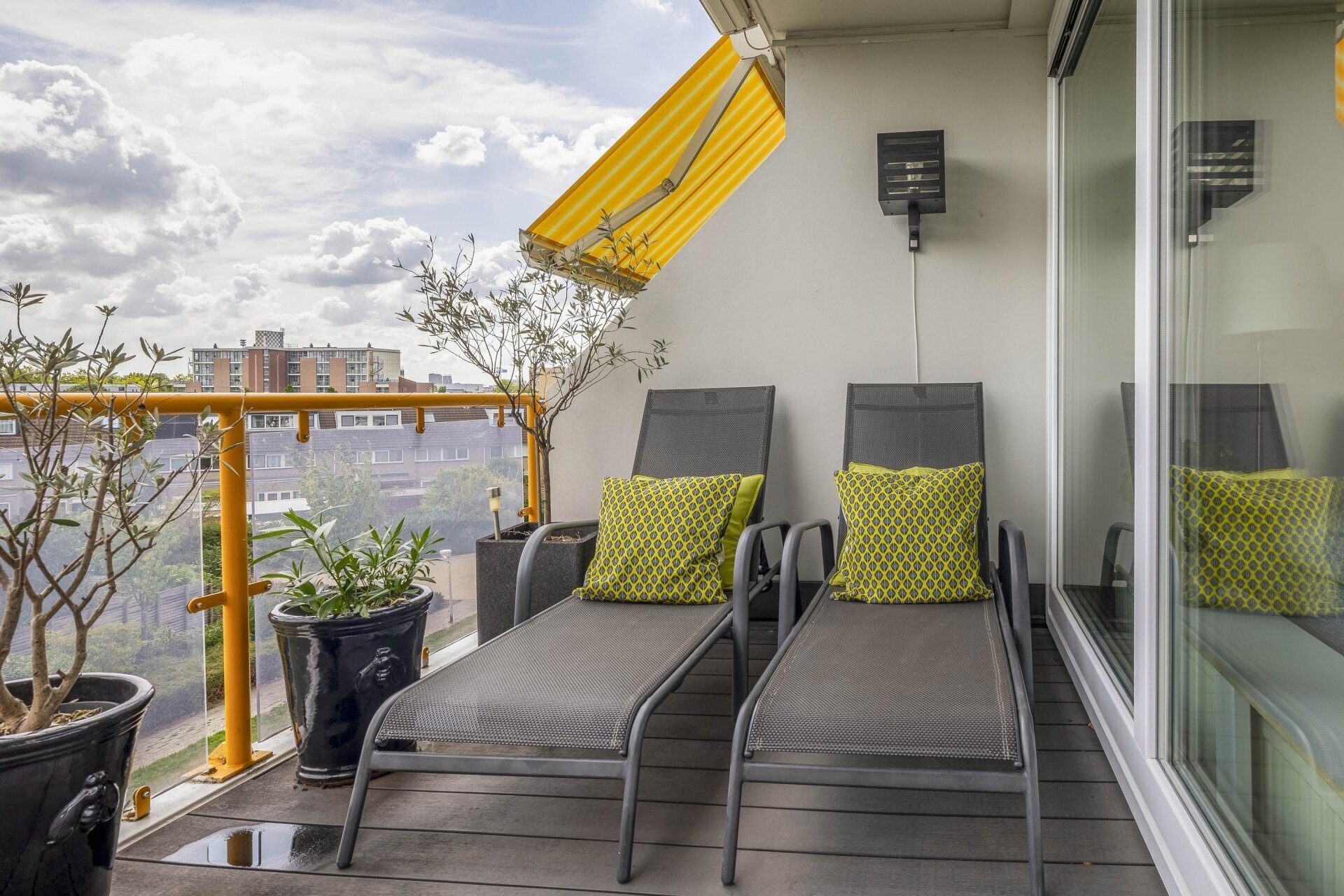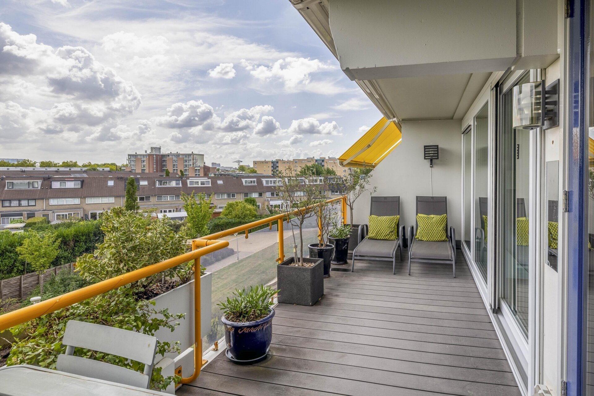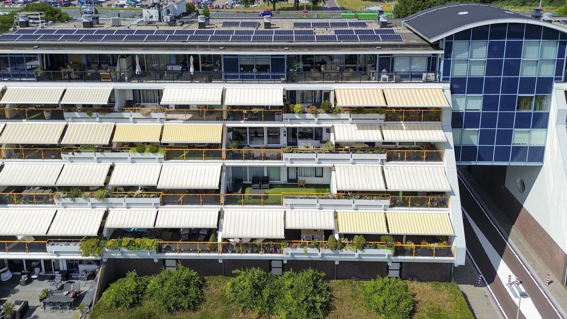 Het ruime terras is een van de grote pluspunten van dit appartement. Hier geniet je van veel buitenruimte én comfort: het terras is voorzien van twee elektrisch bedienbare zonneschermen. Eén van de schermen is twee jaar geleden vervangen, tegelijkertijd is het doek van het andere scherm vernieuwd. Een heerlijke plek om te ontspannen, zowel in de zon als in de schaduw.