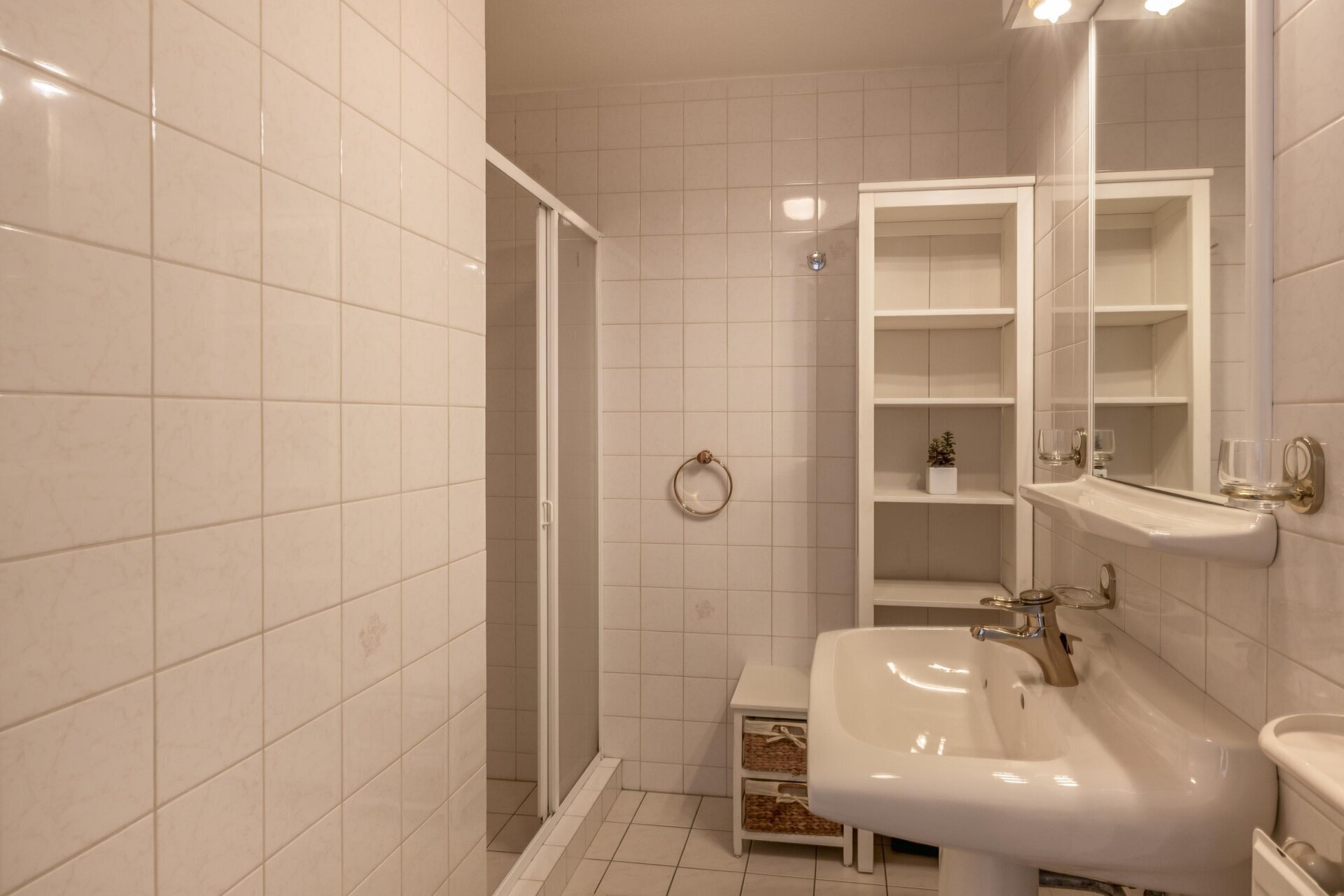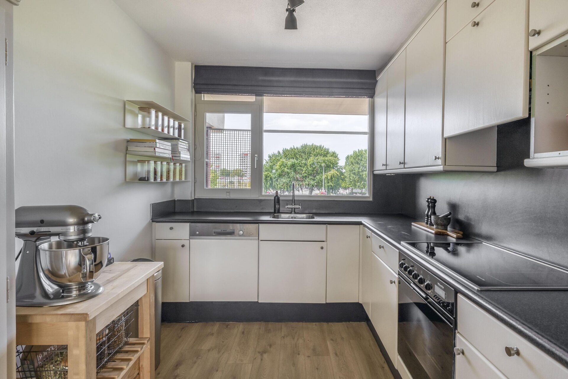Aan de voorzijde van het appartement bevindt zich de keuken in L-opstelling. Deze is uitgerust met een keramische kookplaat, oven en vaatwasser. Een praktische en fijne ruimte om te koken. Verder beschikt het appartement over een separaat toilet met fontein en een badkamer met douche en wastafel, alles netjes en verzorgd.