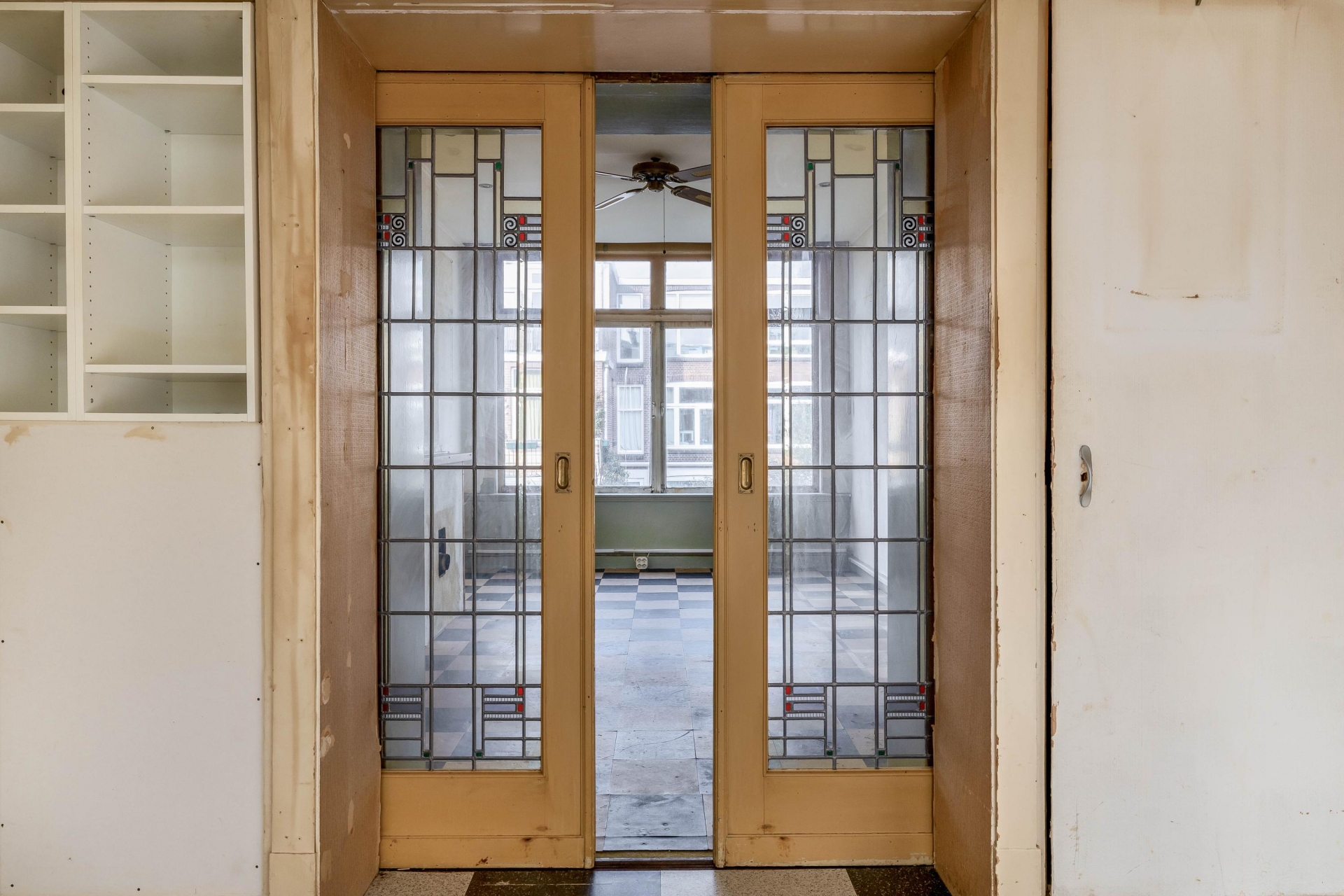 Aan de linkerzijde bevindt zich een praktische vaste kast, ideaal als garderobe. Direct daarnaast ligt de eerste slaapkamer, net als meerdere ruimtes voorzien van karakteristiek glas-in-lood, wat de woning direct sfeer geeft.