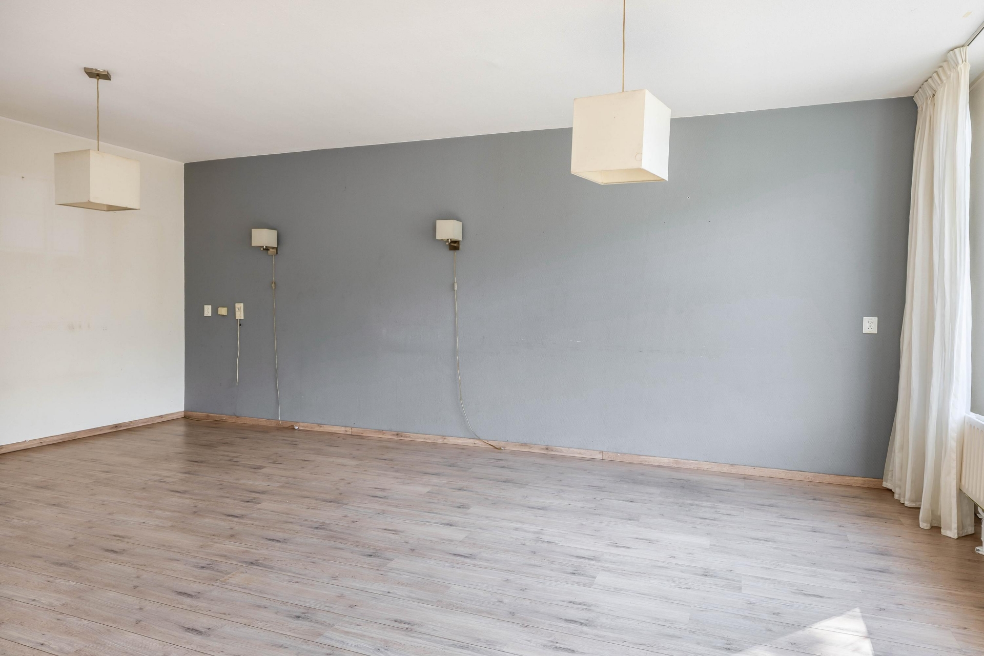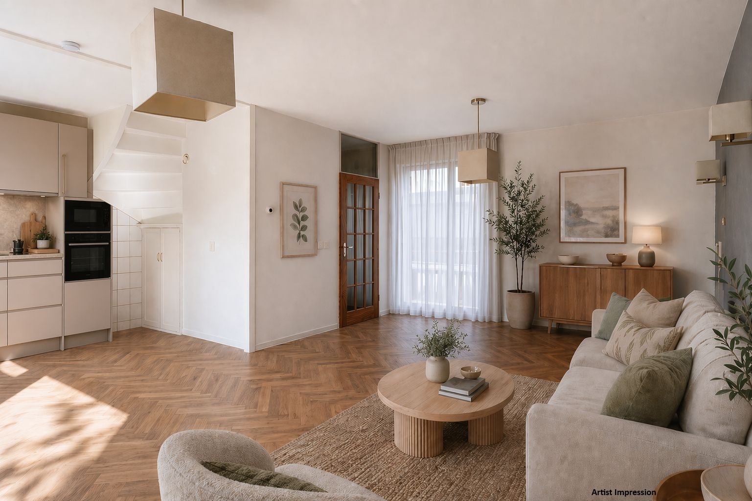 De lichte woonkamer met open keuken vormt het hart van het huis. Dankzij de grote raampartijen komt er veel daglicht naar binnen, wat direct zorgt voor een fijne sfeer. De keuken is eenvoudig uitgevoerd, maar functioneel en biedt volop mogelijkheden om hier jouw ideale woonkeuken van te maken. Vanuit de woonkamer loop je zo de achtertuin in, waar je tot in de avond van de zon kunt genieten.