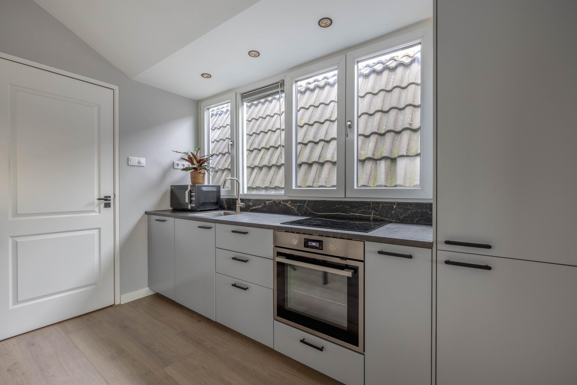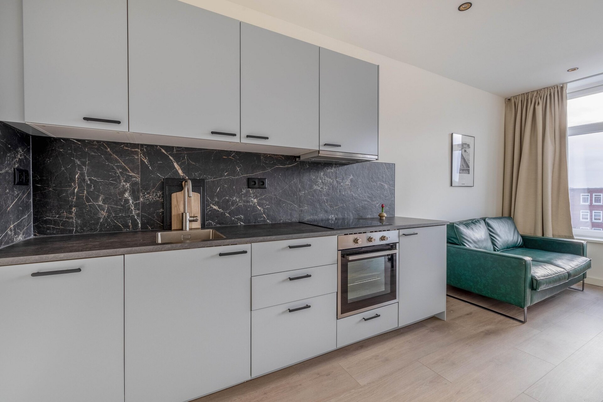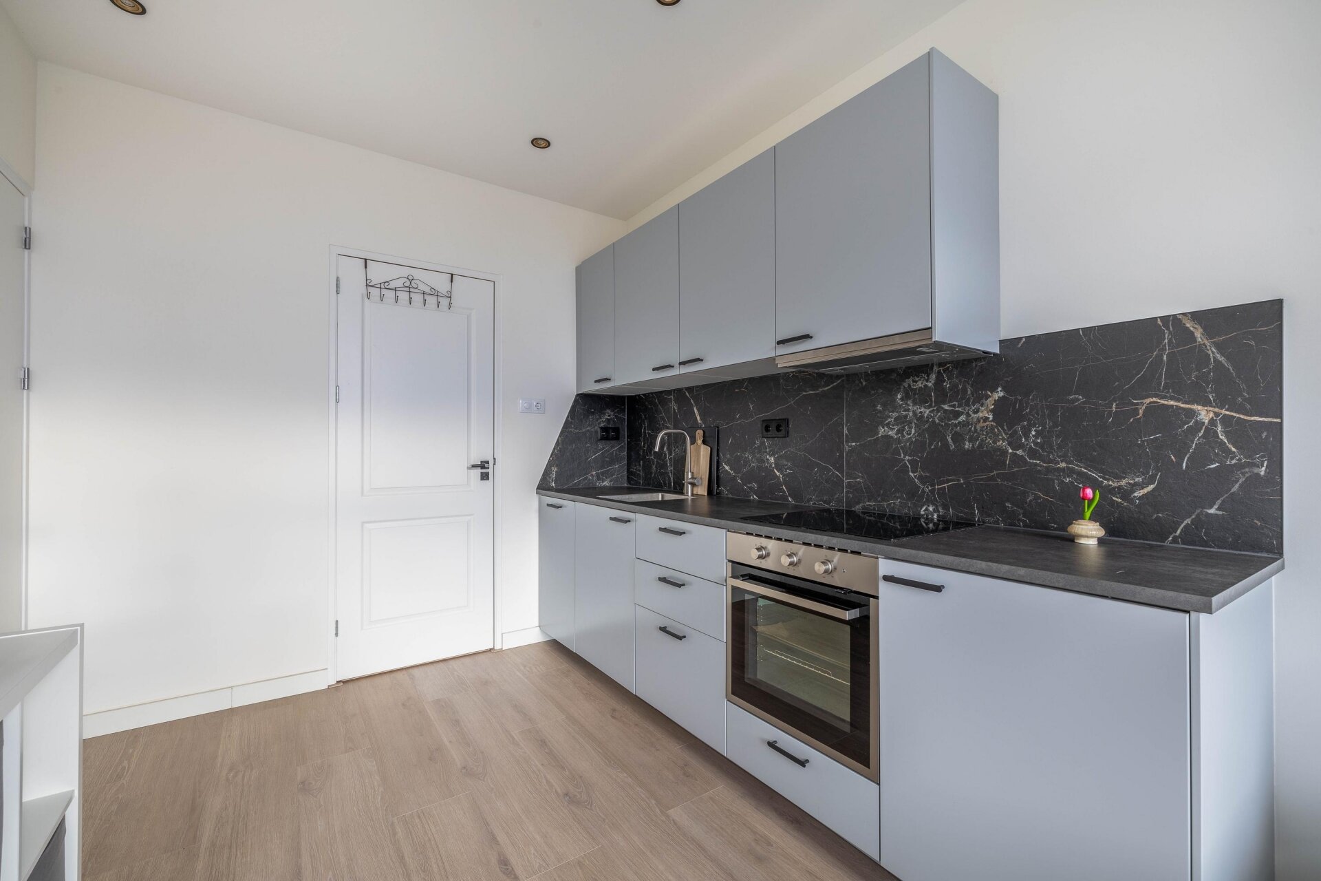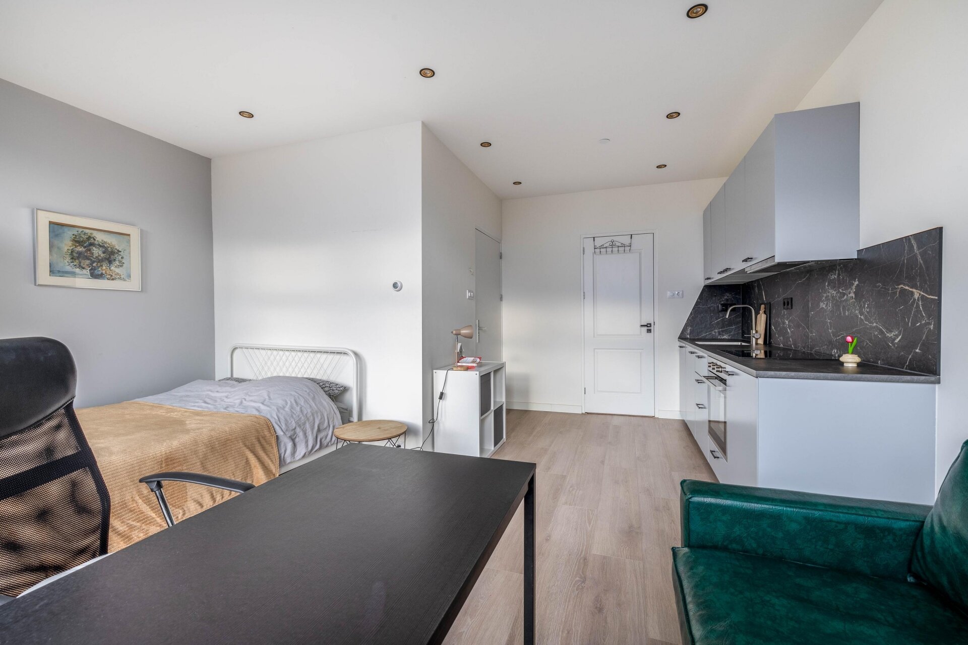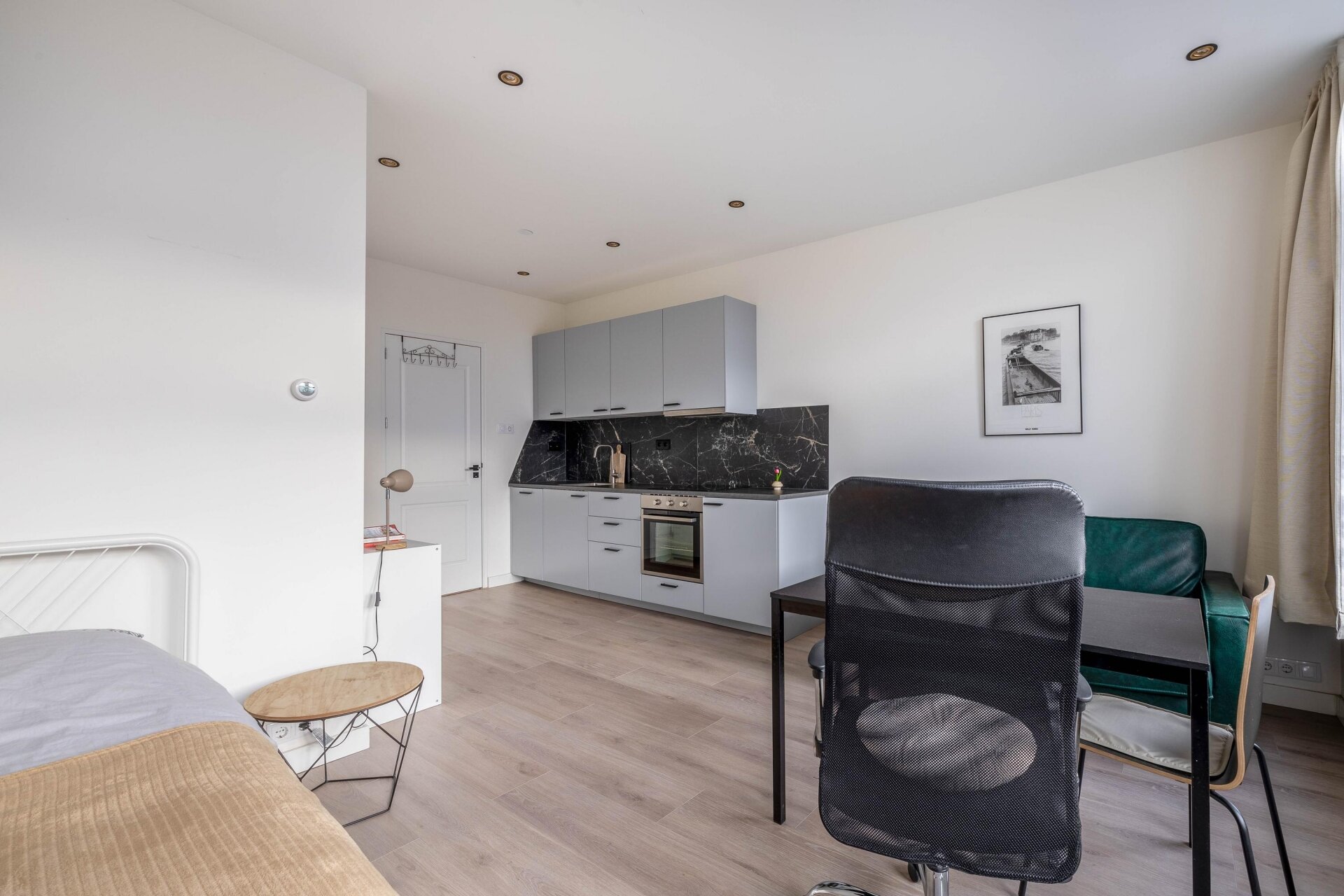 Studio 2 ligt aan de zuidwestzijde en geniet van veel lichtinval. Ook hier is de leefruimte ingericht voor comfort, met een gezellige zithoek en slaapgedeelte. De keuken, eveneens vernieuwd in 2020, beschikt over inbouwapparatuur en een inductiekookplaat. De badkamer is modern en voorzien van een inloopdouche, toilet, wastafel en meubel.