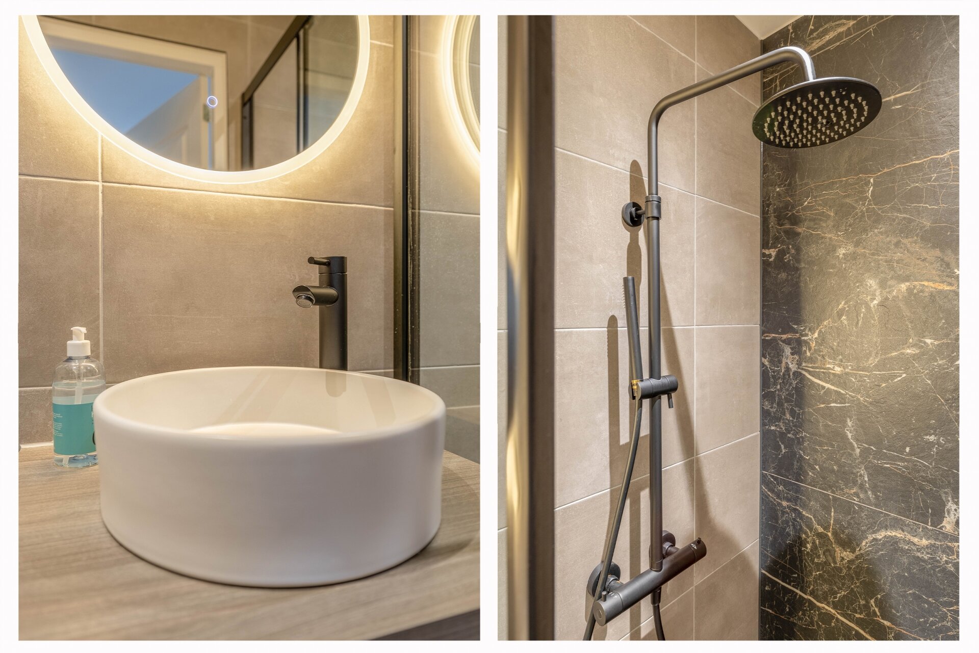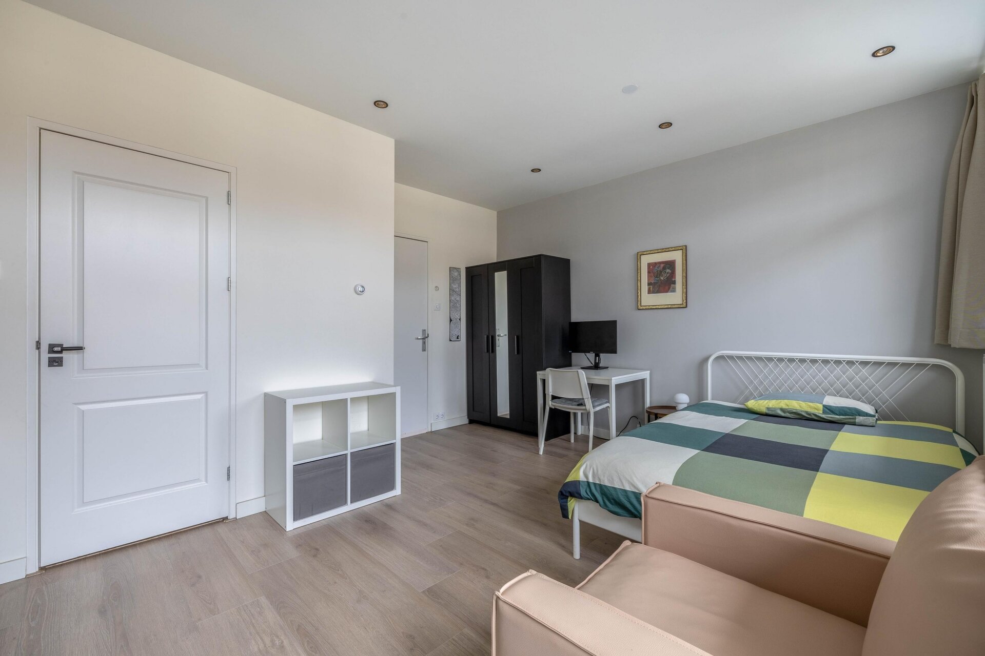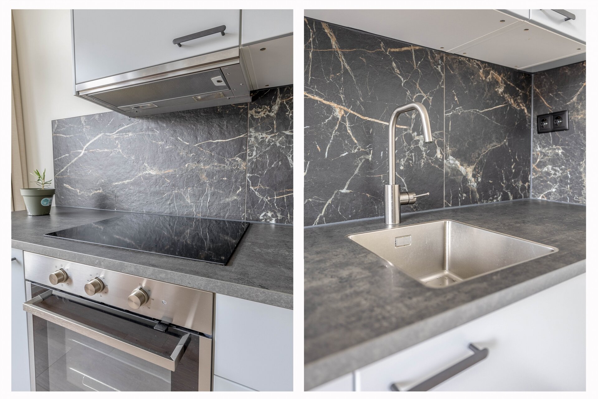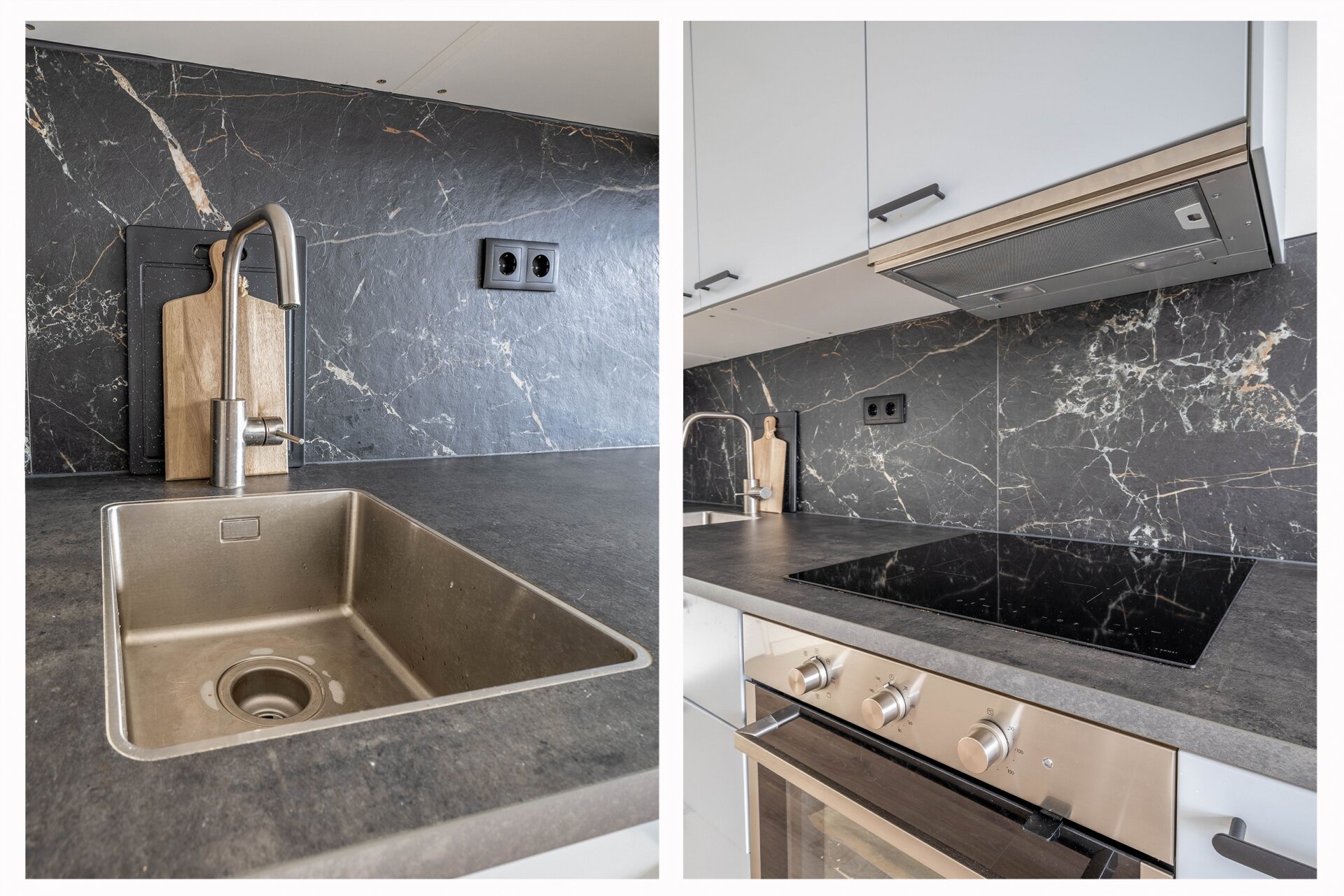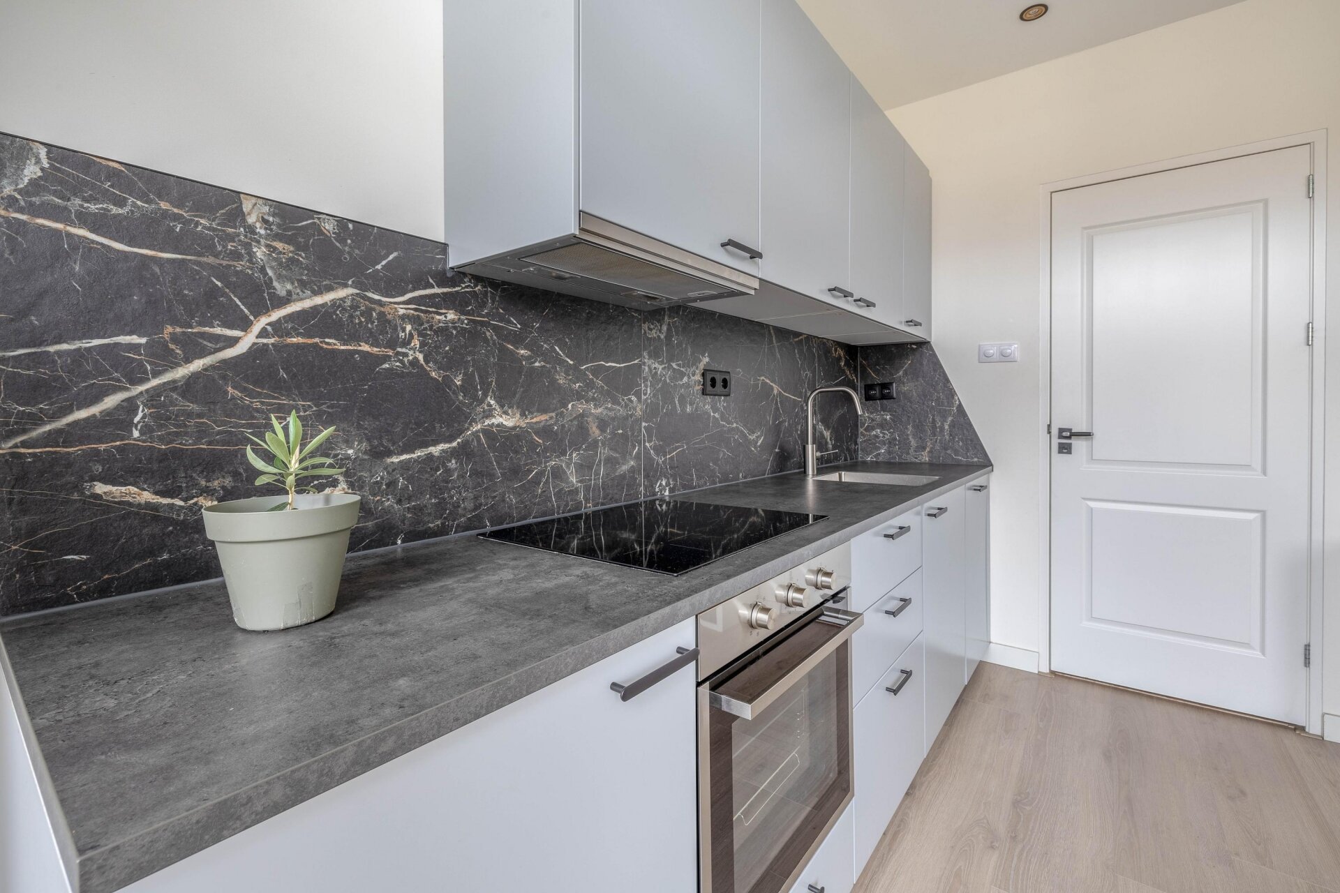 Studio 2 ligt aan de zuidwestzijde en geniet van veel lichtinval. Ook hier is de leefruimte ingericht voor comfort, met een gezellige zithoek en slaapgedeelte. De keuken, eveneens vernieuwd in 2020, beschikt over inbouwapparatuur en een inductiekookplaat. De badkamer is modern en voorzien van een inloopdouche, toilet, wastafel en meubel.