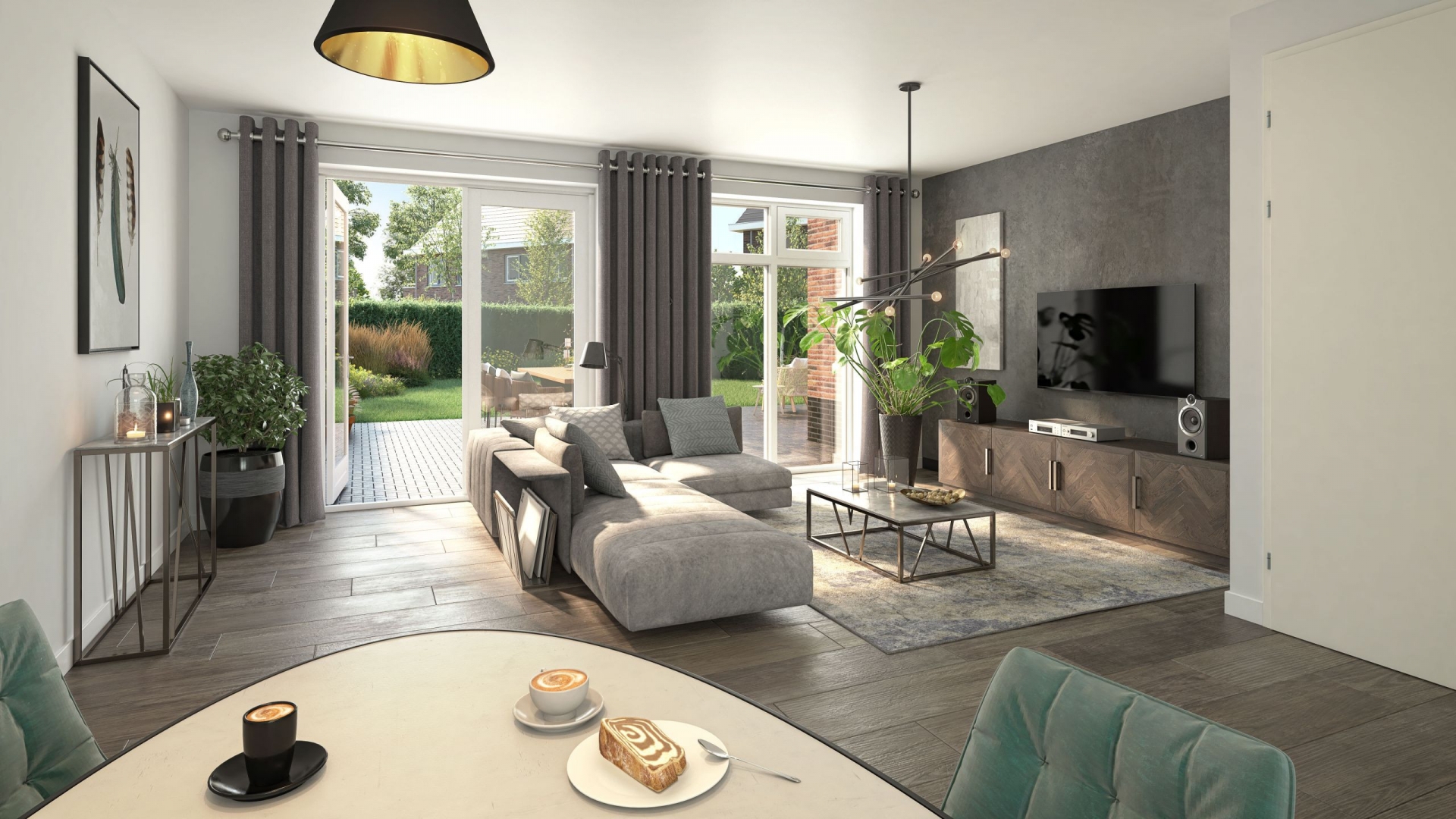 Bij binnenkomst valt direct de ruime, lichte woonkamer op. De grote raampartijen zorgen voor veel natuurlijk licht en een fraai uitzicht op de tuin. De open keuken aan de voorzijde biedt alle ruimte voor een royale opstelling en een gezellige eethoek.