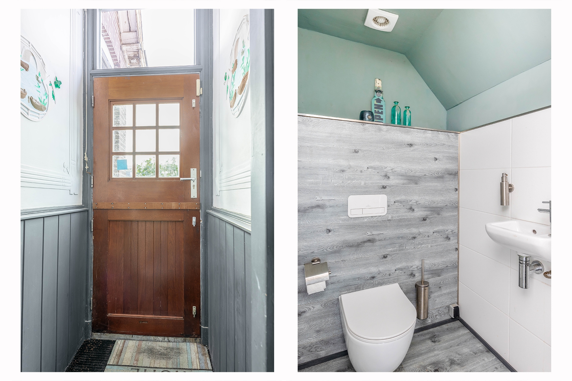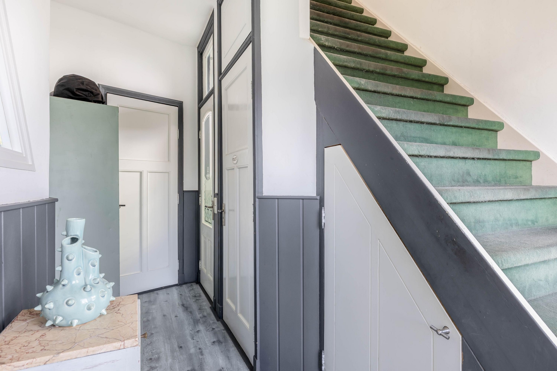 Via de entree betreedt u de woning, die toegang biedt tot de hal. Vanuit de hal zijn alle vertrekken op de begane grond bereikbaar. Hier bevinden zich het toilet met fonteintje, de trapopgang naar de eerste verdieping en de doorgang naar de ruime keuken. Onder de trap bevindt zich een ruime opbergkast.