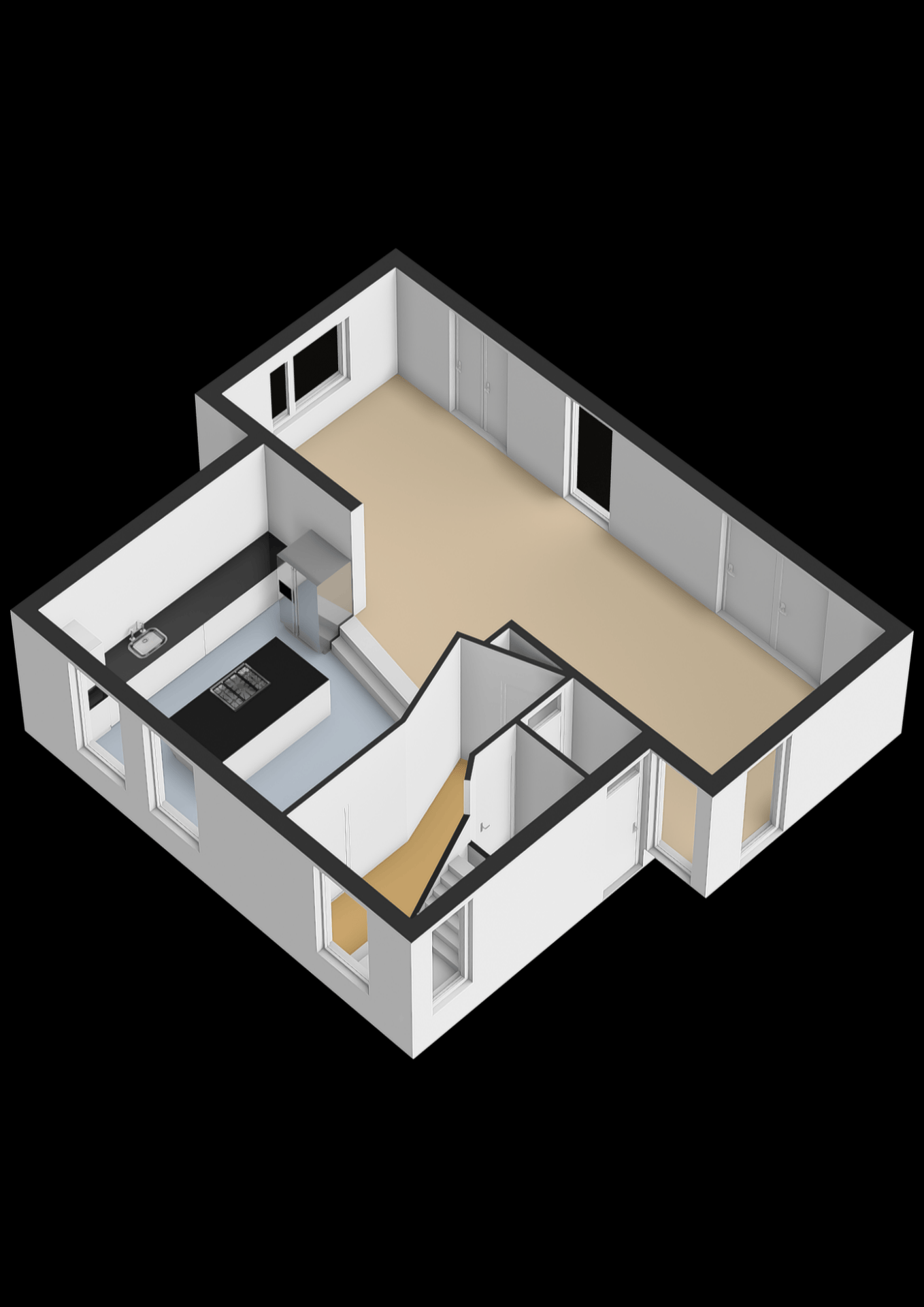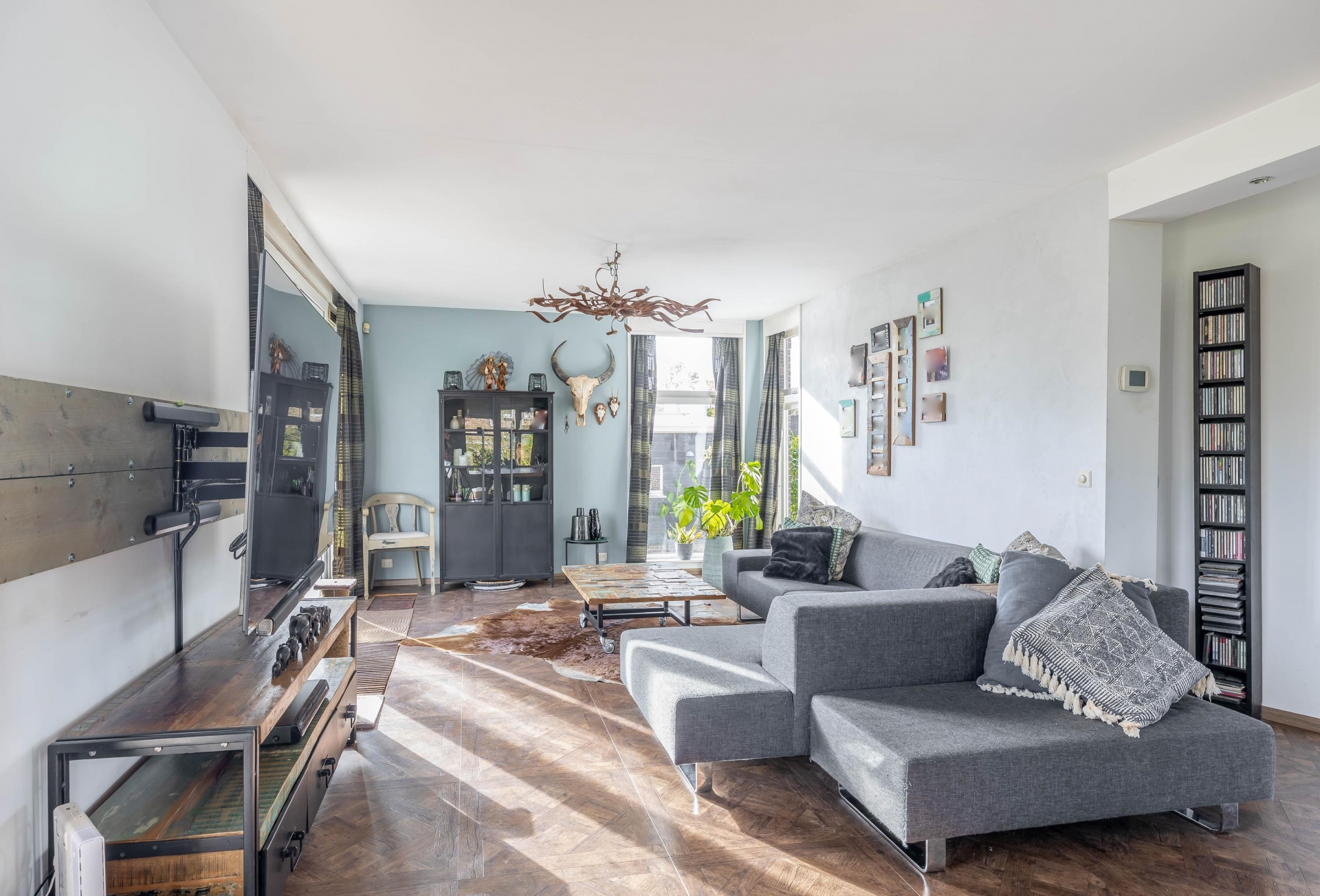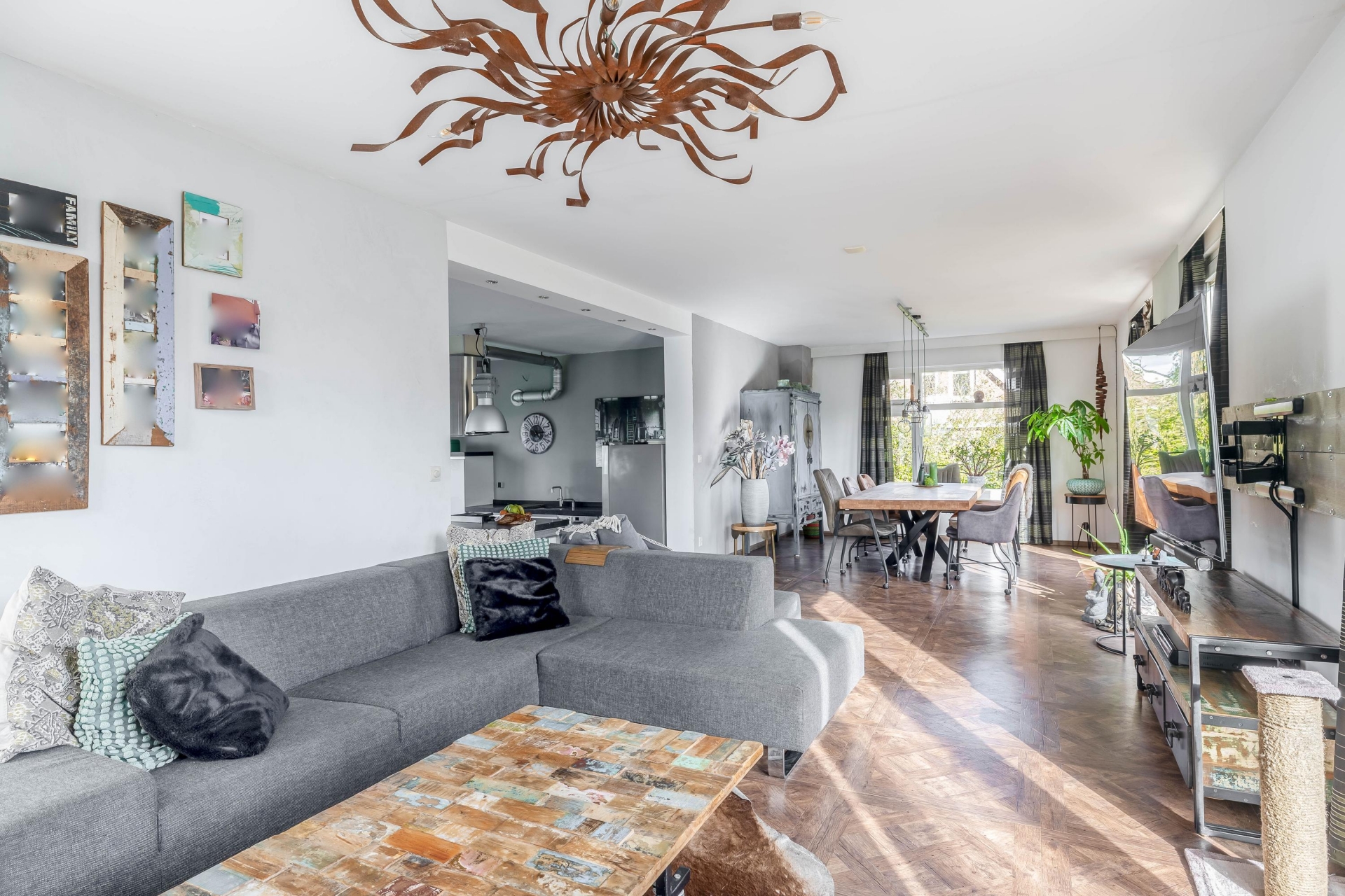 Een brede 3 trede trap vanuit de keuken leidt naar de woonkamer, wat zorgt voor een speelse en open indeling. De woonkamer is onderverdeeld in een eetgedeelte en een zitgedeelte, die samen een riant oppervlak van circa 38 m² beslaan. Dankzij de royale afmetingen is er volop ruimte voor een grote eettafel en een comfortabele zithoek. De grote ramen op het zuiden zorgen bovendien voor veel natuurlijk licht, wat de ruimte een warme en uitnodigende sfeer geeft. In deze ruimte zit een luik die toegang verschaft via een wenteltrap aan de kelderkamer (12 m2) met een groot raam naar de achtertuin.