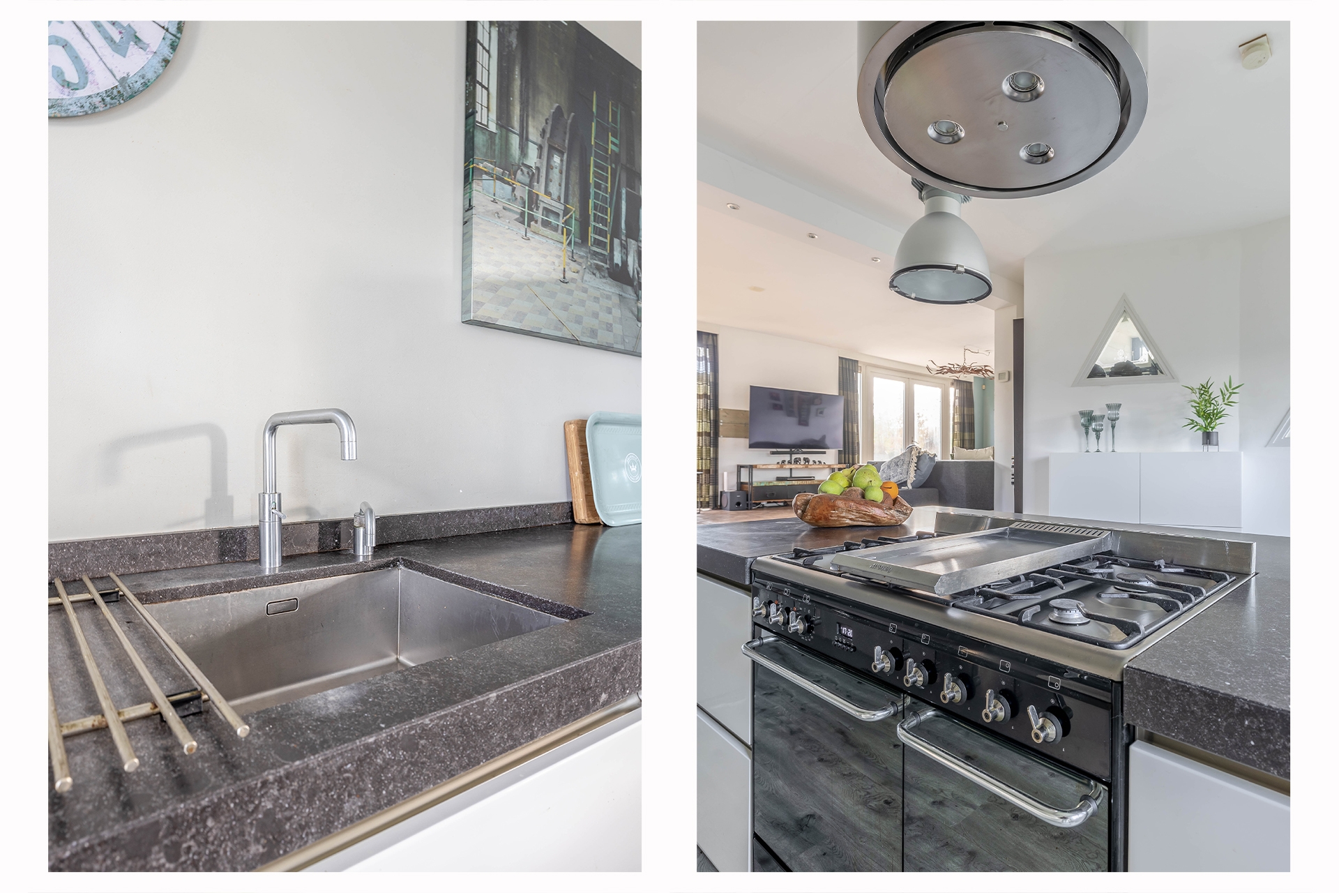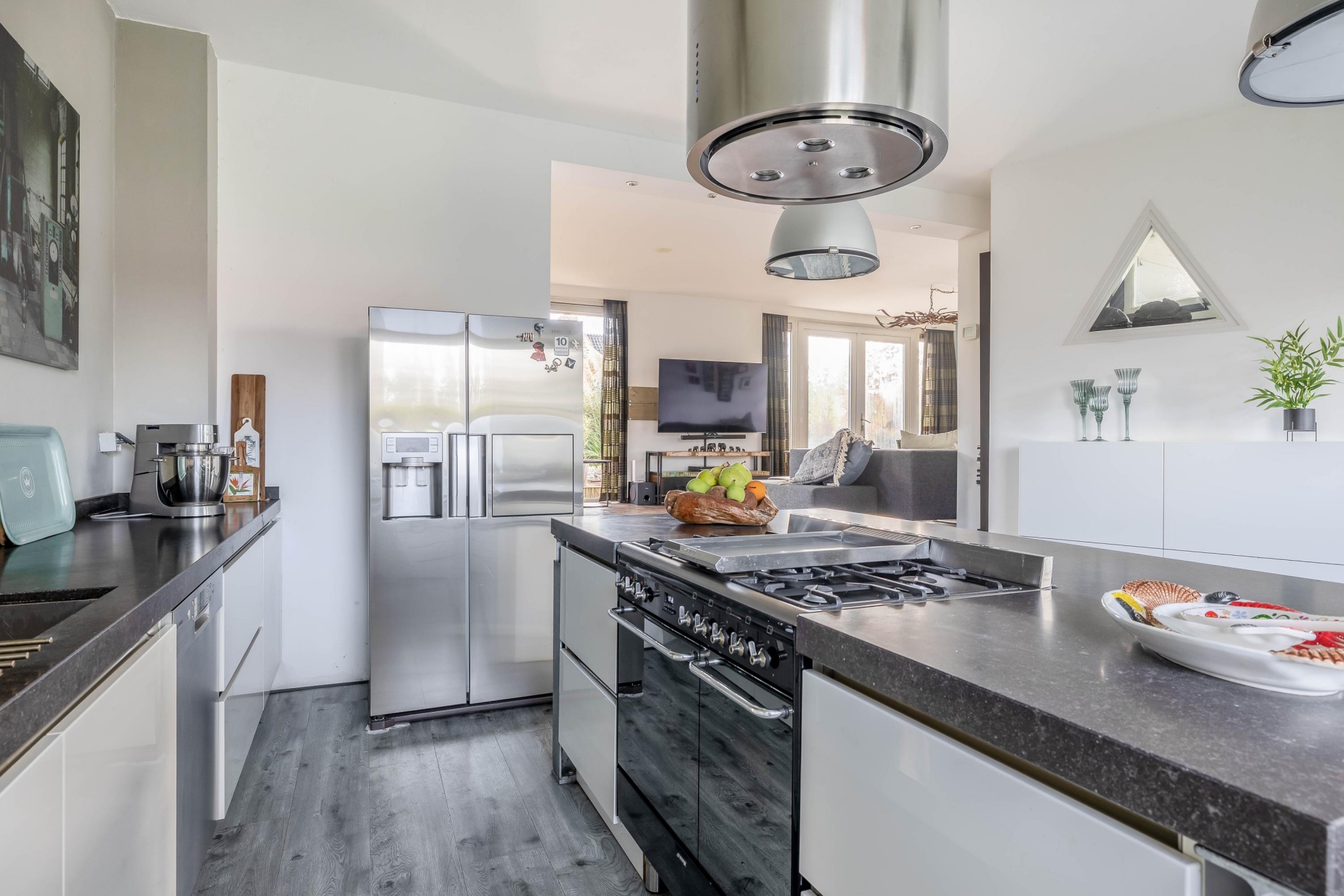 De keuken is opgesteld in een moderne open indeling met centraal een eetbar en royaal kookeiland welke direct in het oog springt. Deze keuken is volledig uitgerust met hoogwaardige inbouwapparatuur, waaronder een oven, ingebouwd koffiezetapparaat, magnetron, Amerikaanse koelkast, Quooker-kraan, vaatwasser en een 5-pits gaskookplaat met stijlvolle afzuigschouw. De ruimte is perfect geschikt voor kookliefhebbers en vormt een gezellige plek om samen te komen.