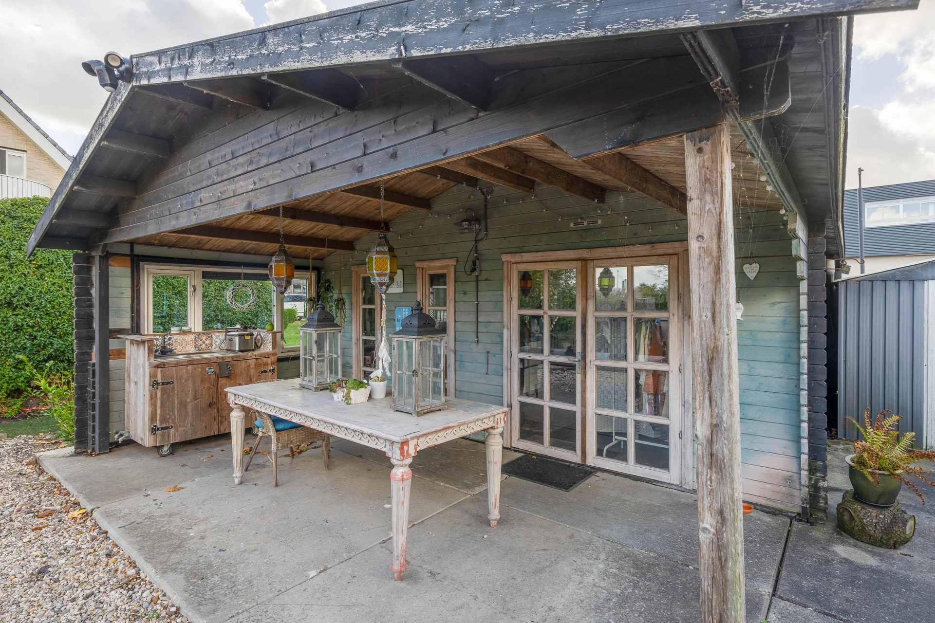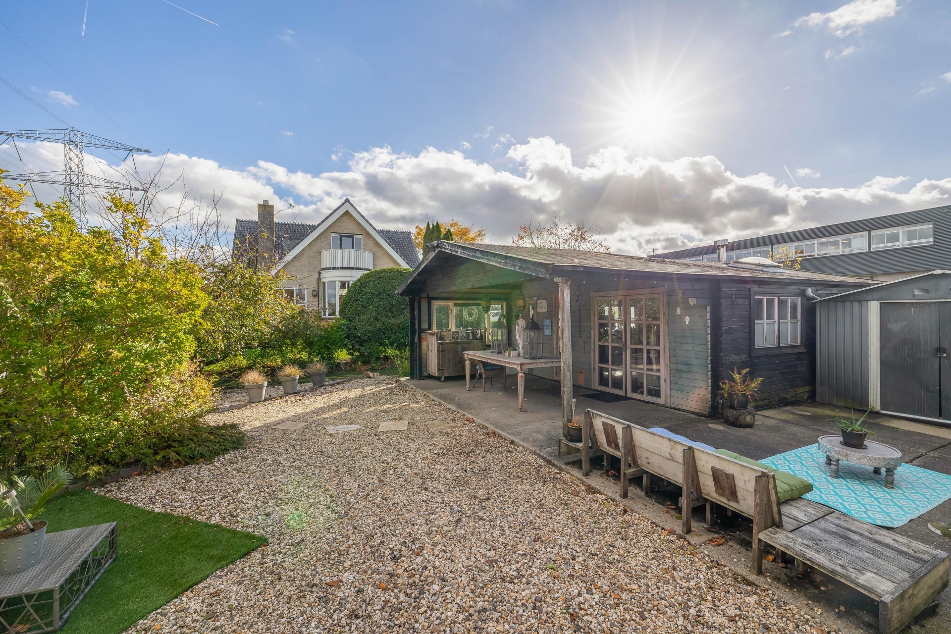 De tuin is rondom de woning gelegen en biedt een verzorgde, groene uitstraling met diverse sfeervolle zitplekken. Naast de woning bevindt zich een garage met een praktische berging (84 m2) met een carport, ideaal voor het overdekt parkeren van een auto. Blokhut met luifel (54 m²) te gebruiken als bedrijfsruimte of kantoor. Direct aan de Schollevaar is een gezellig prieel
