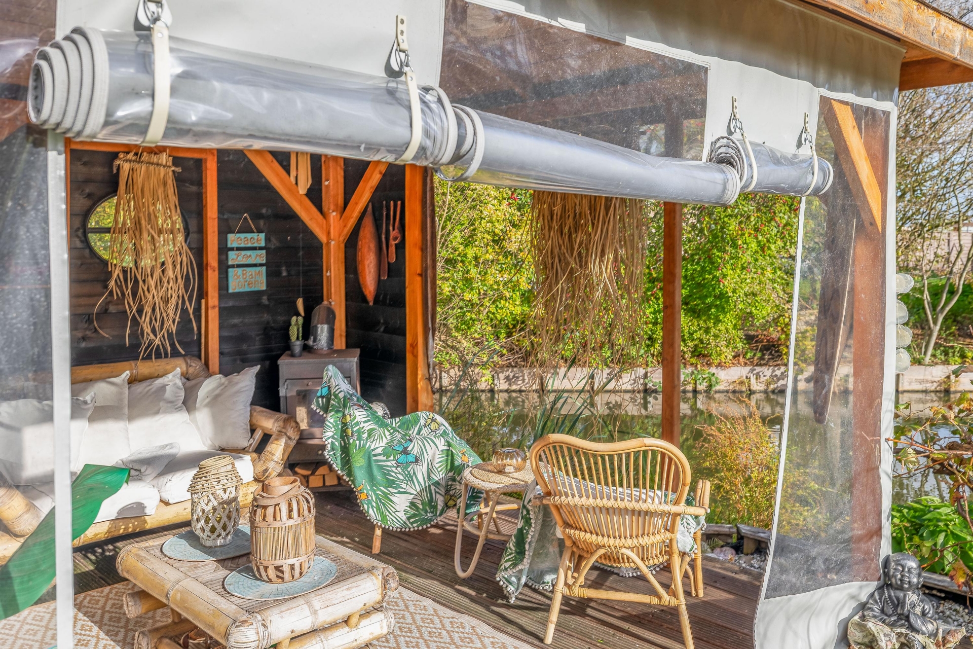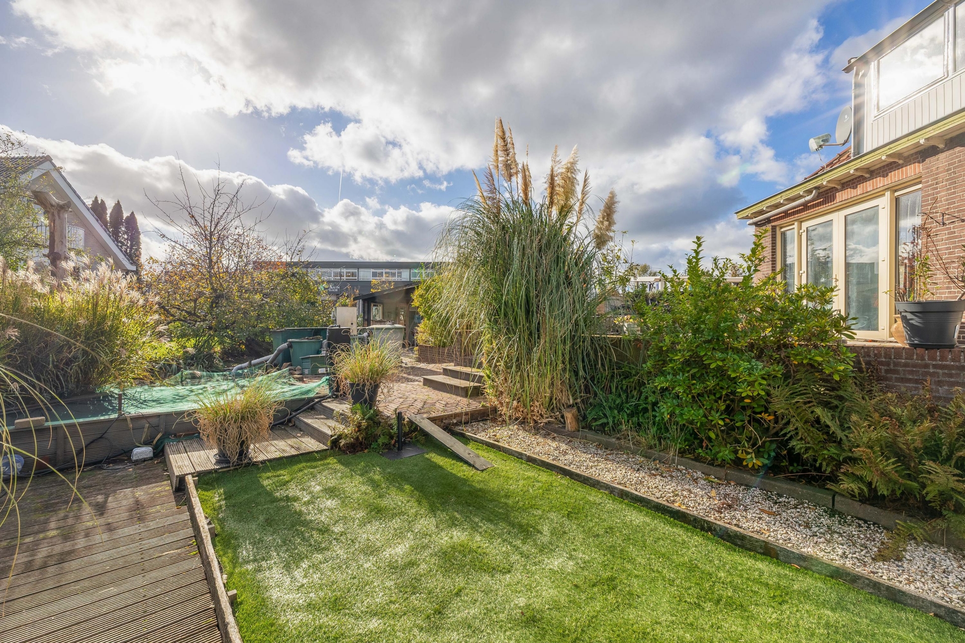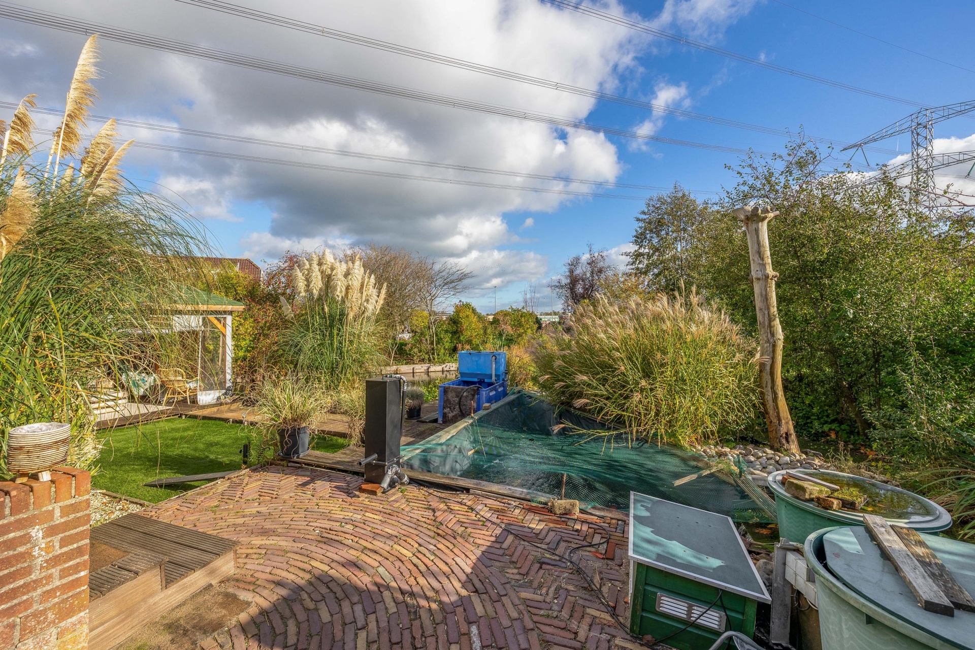 (13 m2) grotendeels (afsluitbaar) gerealiseerd, een heerlijke plek om te ontspannen en te genieten van het uitzicht. Er bevinden zich een aantal fruitbomen (druiven, (hand/stoof) peren, appels, pruimen, rode bessen) er is ook een koi vijver aanwezig met een zuivering.