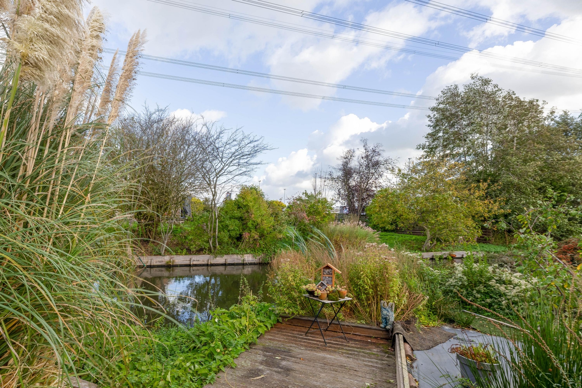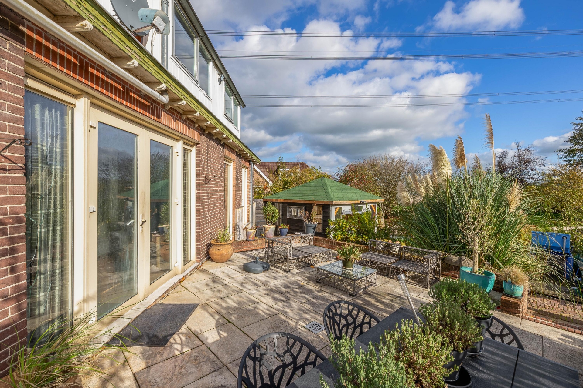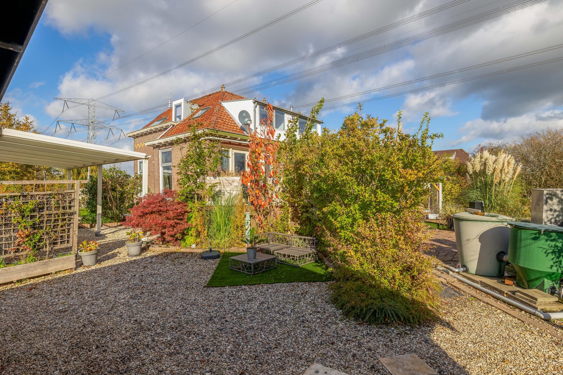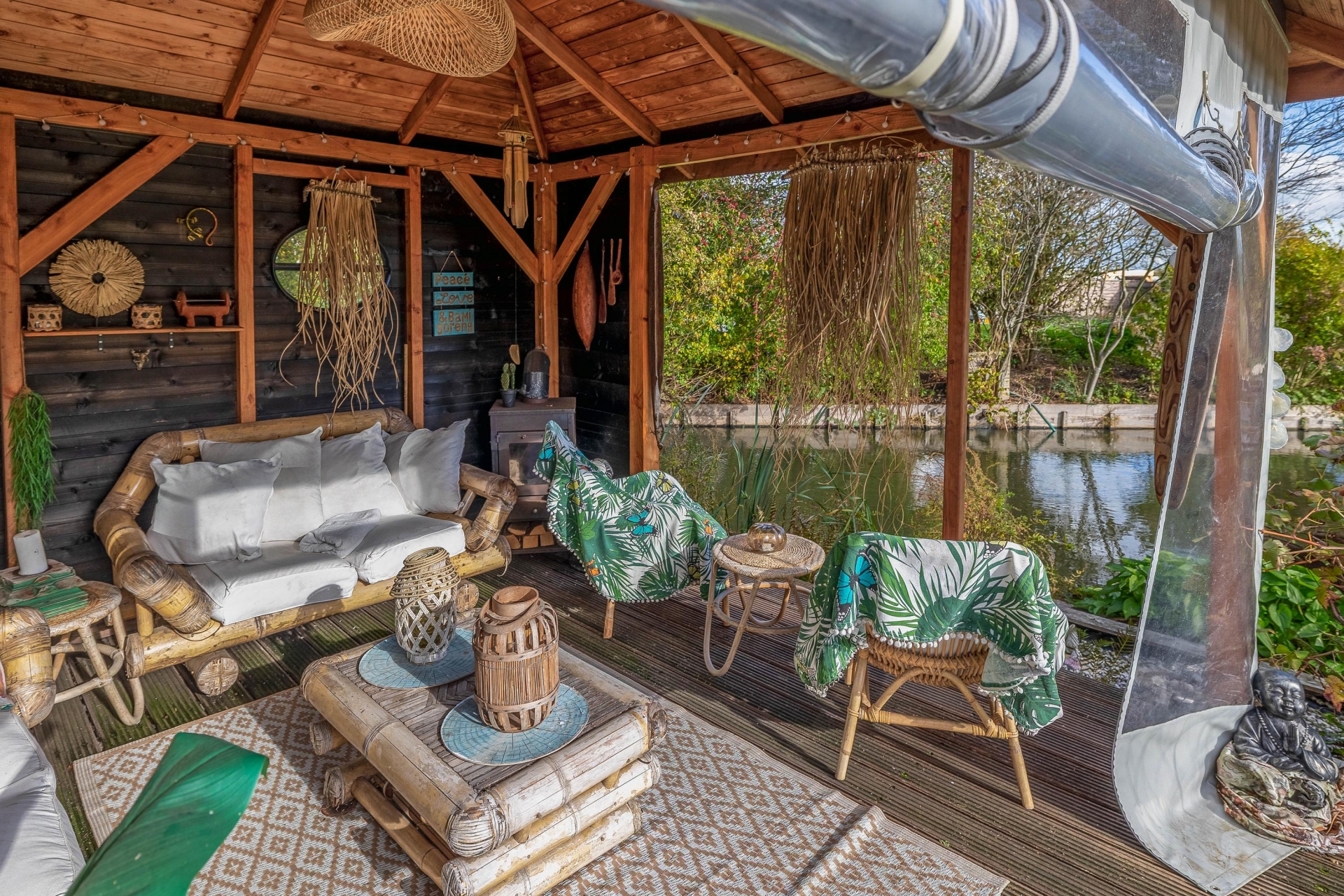 (13 m2) grotendeels (afsluitbaar) gerealiseerd, een heerlijke plek om te ontspannen en te genieten van het uitzicht. Er bevinden zich een aantal fruitbomen (druiven, (hand/stoof) peren, appels, pruimen, rode bessen) er is ook een koi vijver aanwezig met een zuivering.
